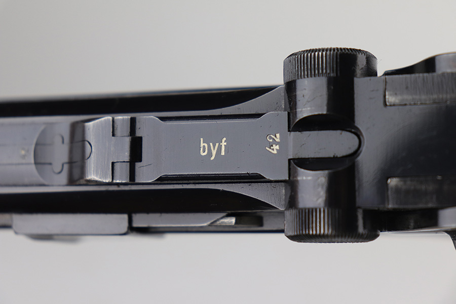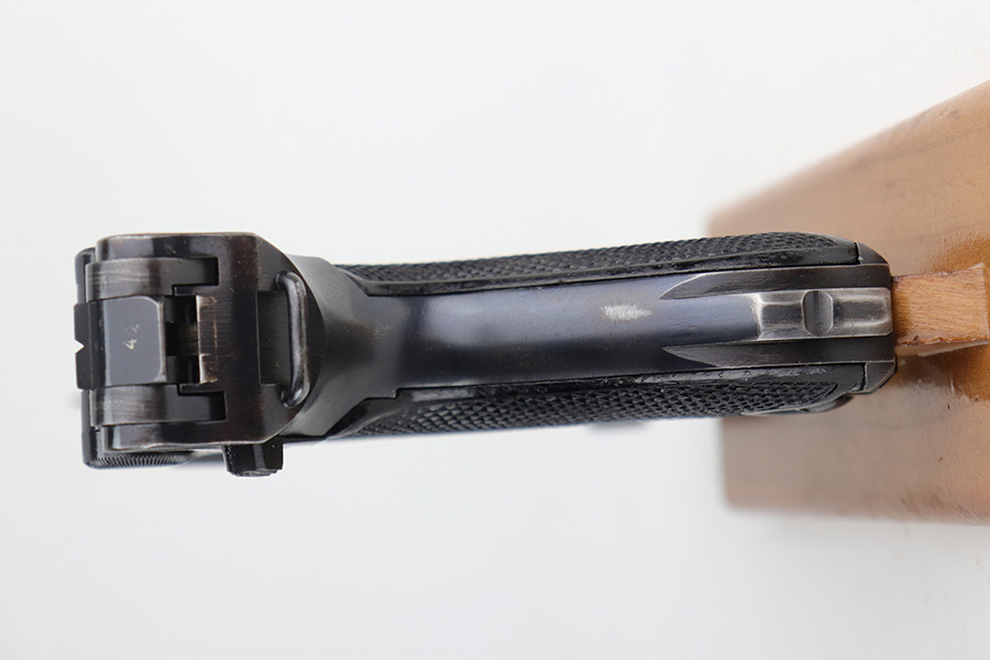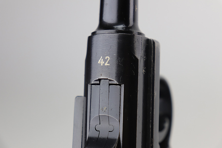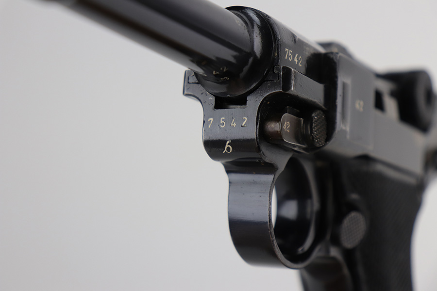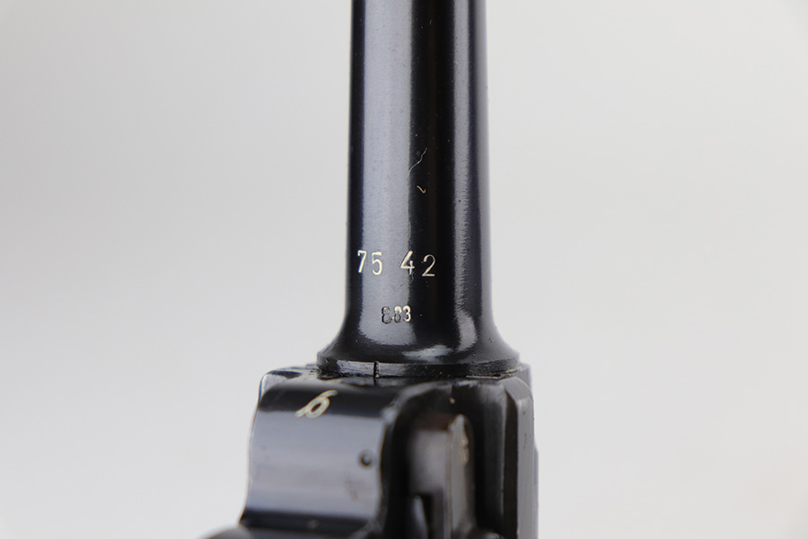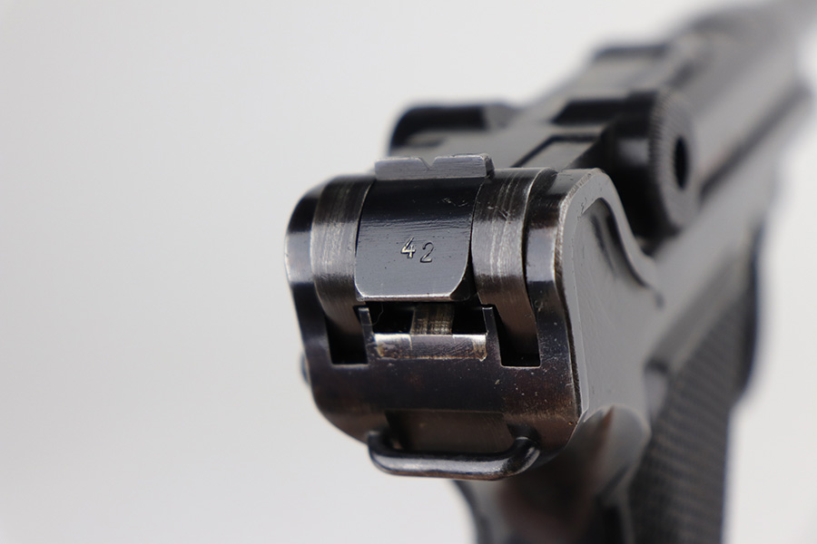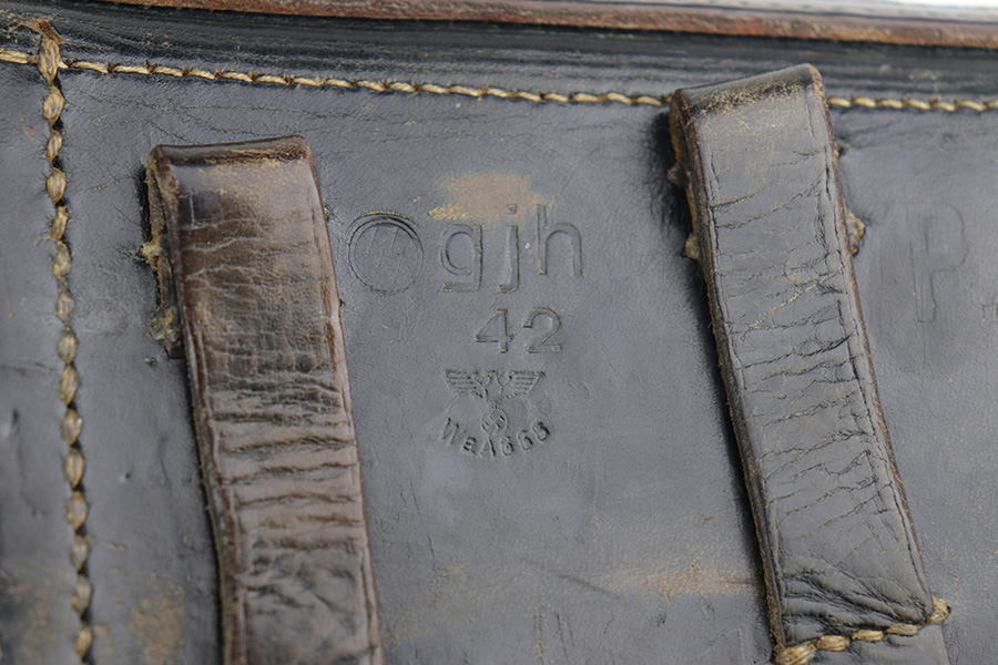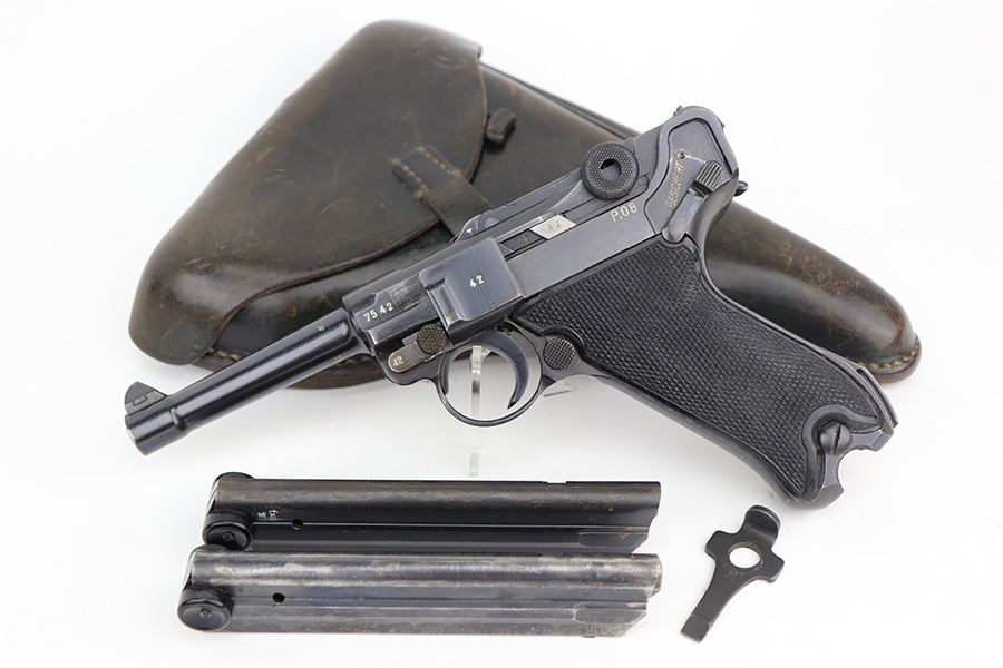 8/20/21 – This is a nice, honest example of a complete Black Widow Mauser Luger rig from 1942. The pistol is all matching and original with maybe 92-93% of the blue remaining. There are small spots of finish loss in several areas, including a patch on both straps and the back of the receiver. Excellent bore. Very nice Black Widow grips with only minor handling wear. Total of two original magazines included. Original E/655 tool is in the pouch. Rig is completed by the excellent ’42 dated holster, which is ‘gjh’ maker marked. The holster also has SS runes on the back, that we do not believe are original.