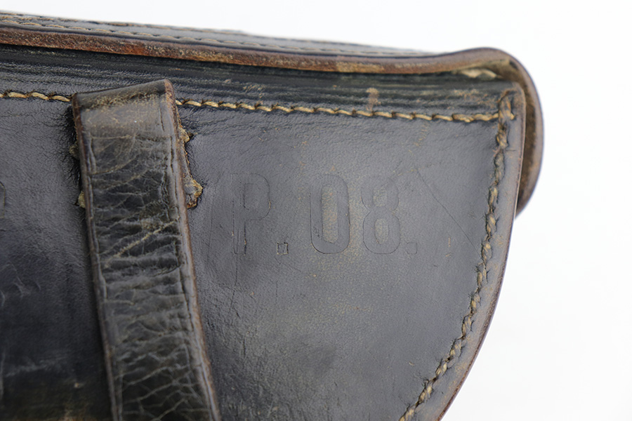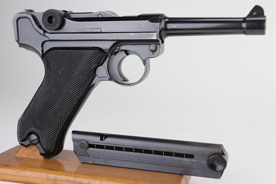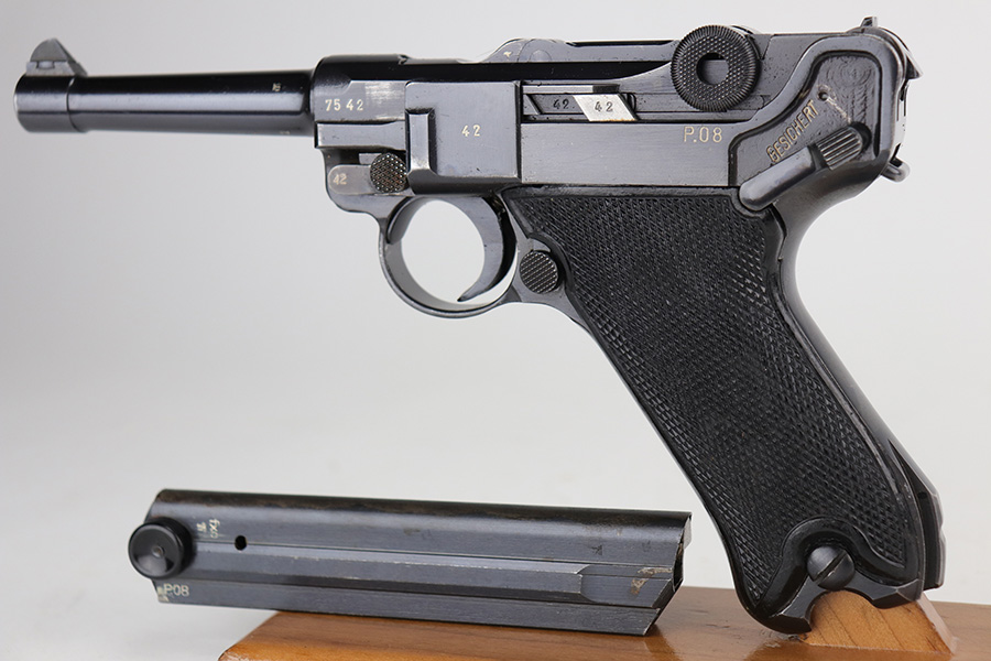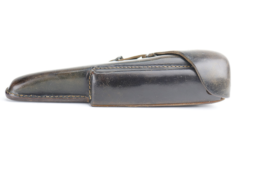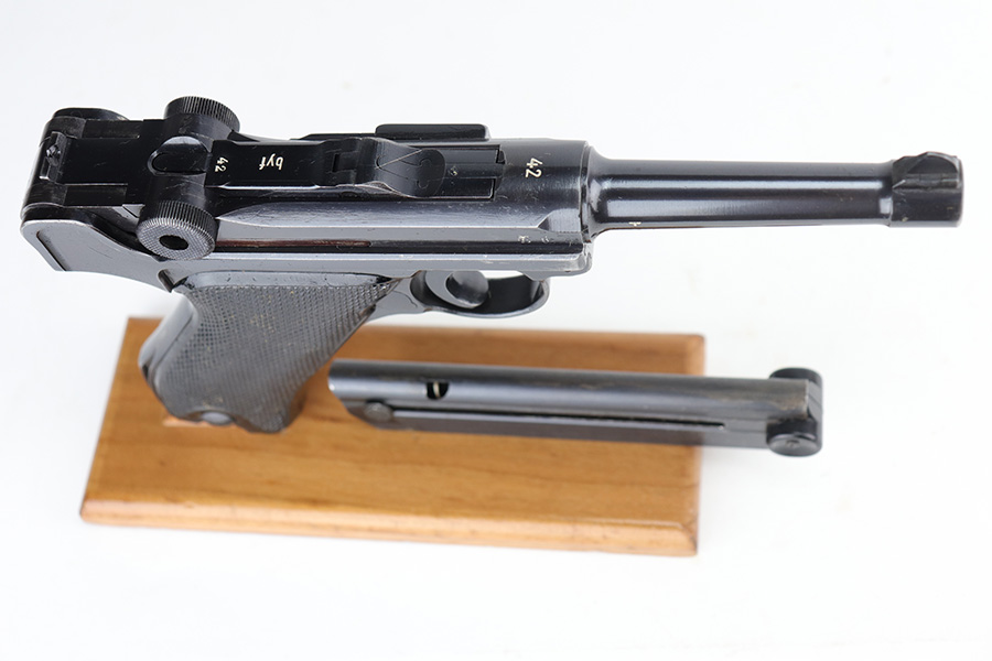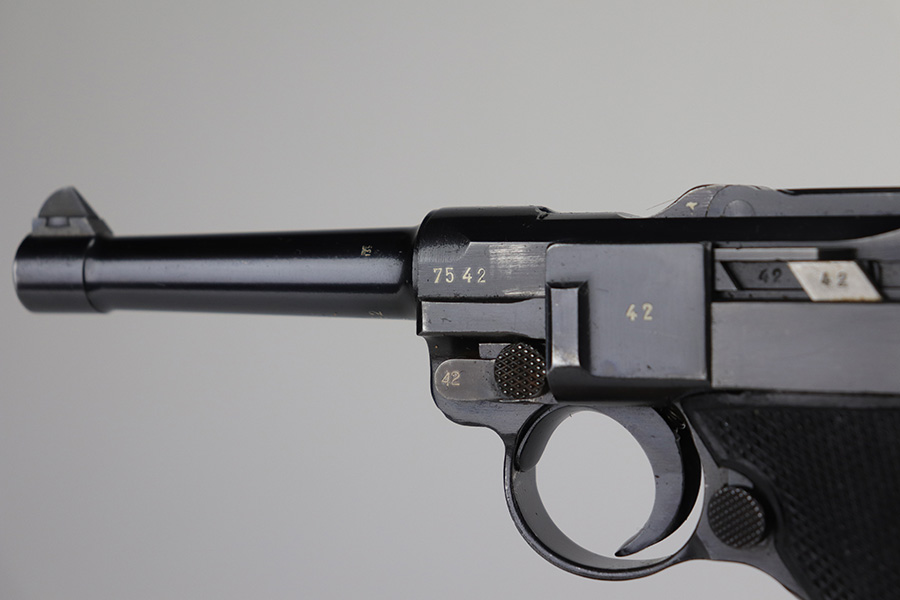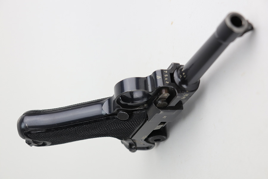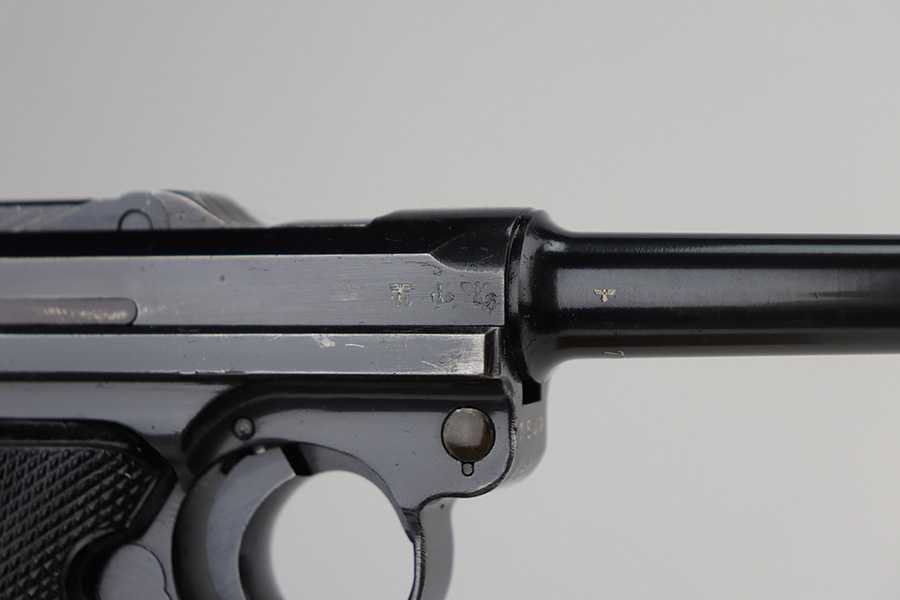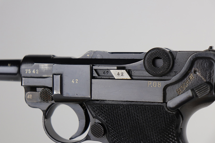 8/20/21 – This is a nice, honest example of a complete Black Widow Mauser Luger rig from 1942. The pistol is all matching and original with maybe 92-93% of the blue remaining. There are small spots of finish loss in several areas, including a patch on both straps and the back of the receiver. Excellent bore. Very nice Black Widow grips with only minor handling wear. Total of two original magazines included. Original E/655 tool is in the pouch. Rig is completed by the excellent ’42 dated holster, which is ‘gjh’ maker marked. The holster also has SS runes on the back, that we do not believe are original.