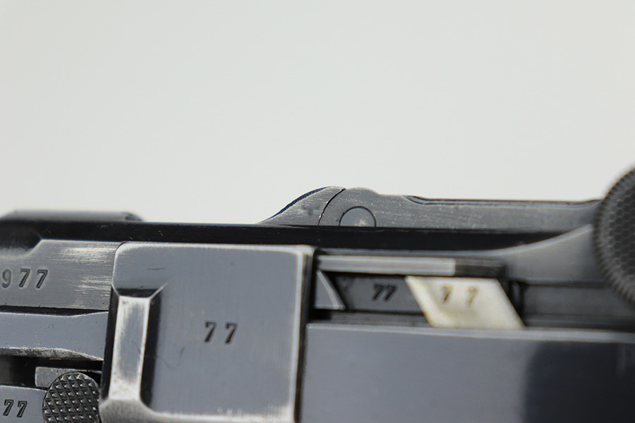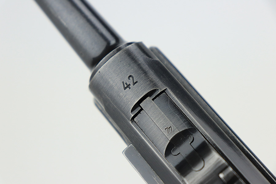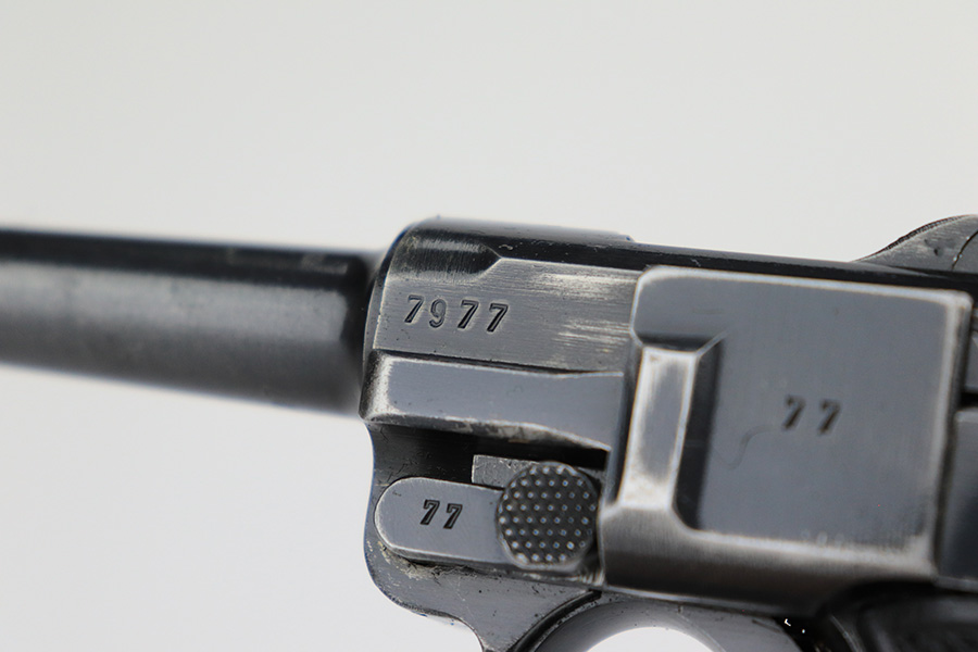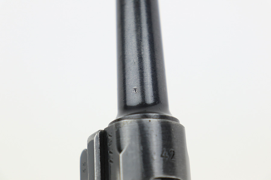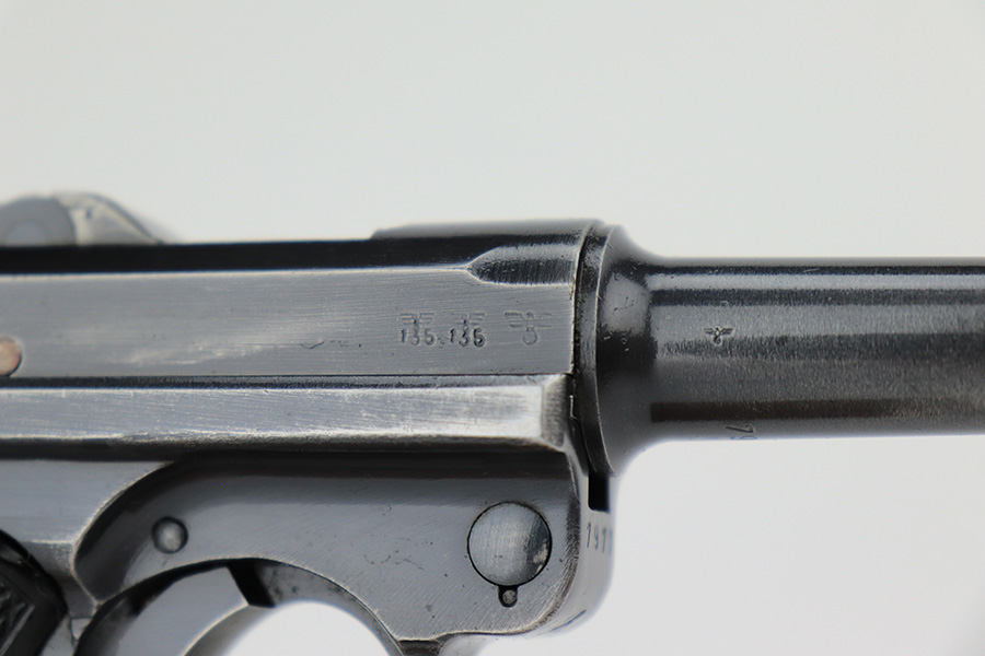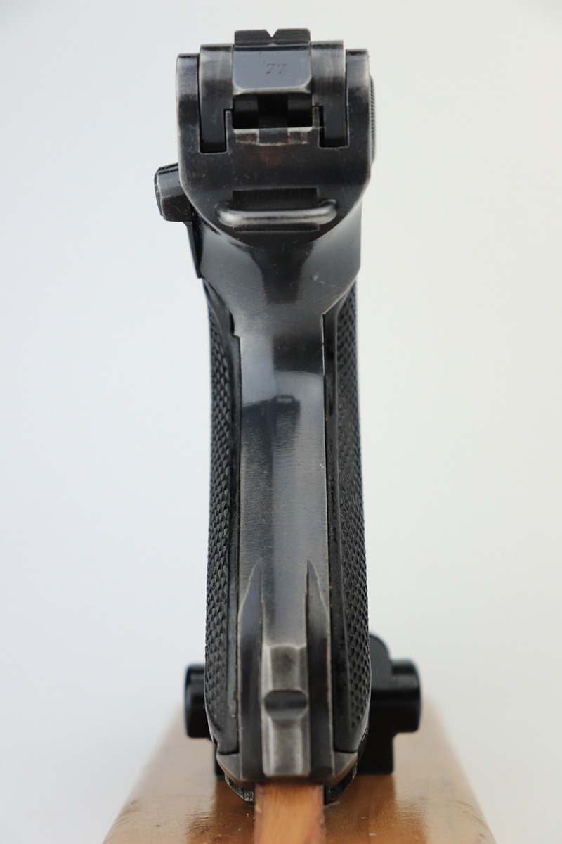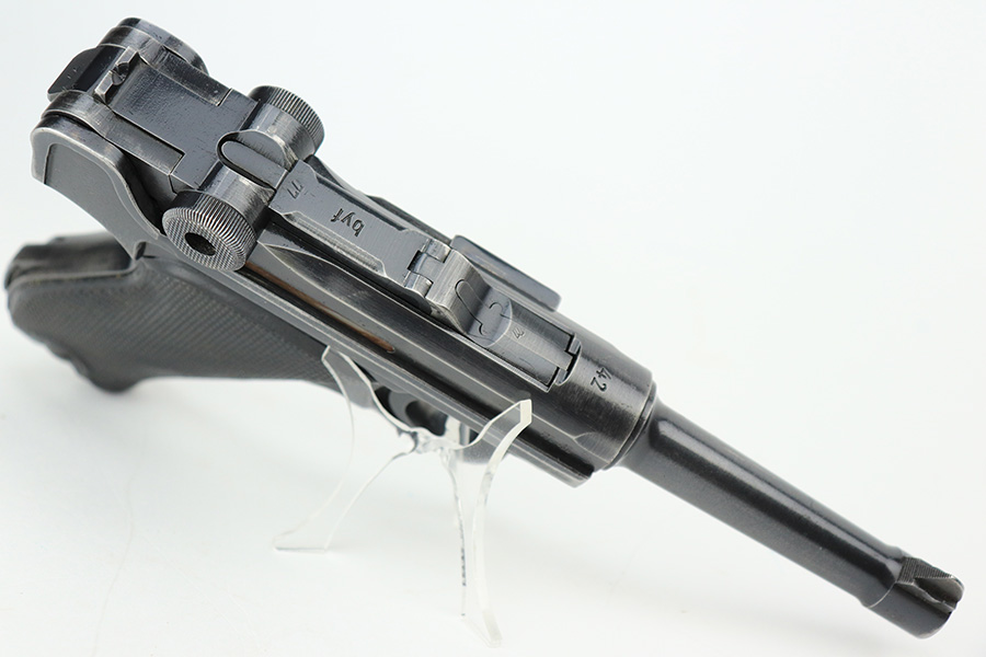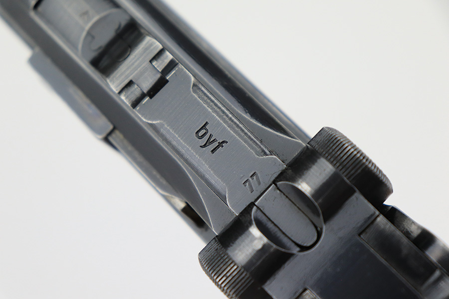 6/5/23 – This is a nice example of a BYF 42 “Black Widow” Mauser Luger issued to the Nazi military in 1942. It is all matching and has the proper “Eagle 135” military acceptance proofs. It comes with a set of original black bakelite “Black Widow” grips and comes as a rig with a nice 1942-dated holster, an “Eagle 655” Luger tool, and two original Black Widow magazines. The gun itself has retained roughly 80% of its original finish. There is wear around the muzzle, side plate, and high edges in general. Areas of noticeable thinning along the barrel, on both grip straps, and along the top and right side of the slide. Excellent bore with strong rifling.