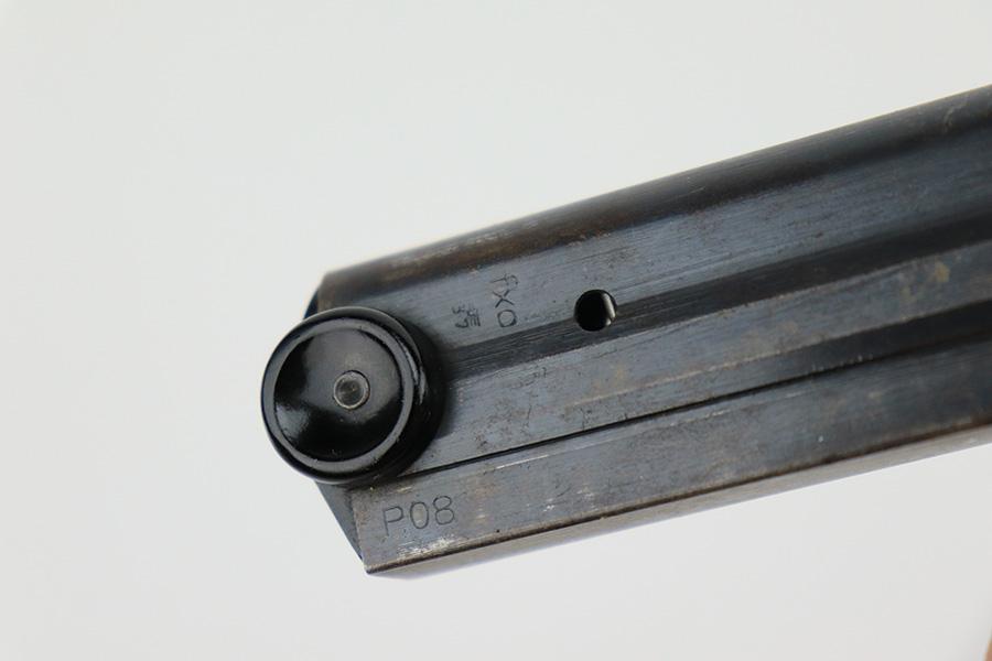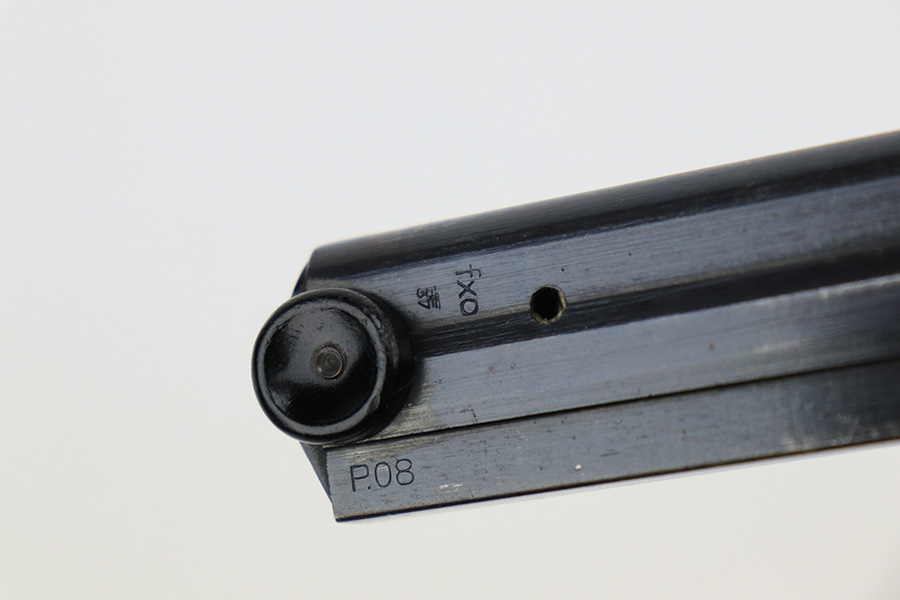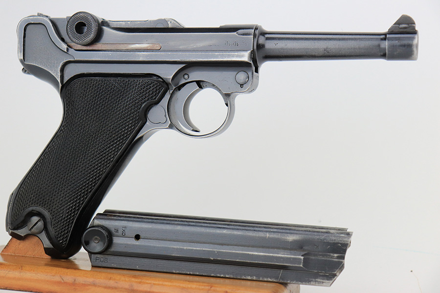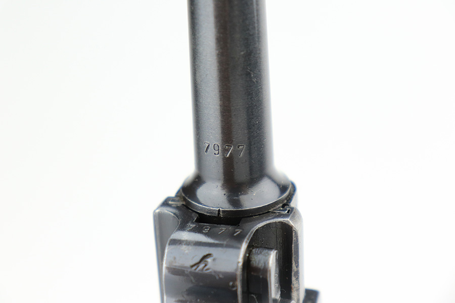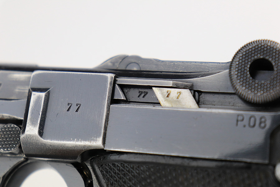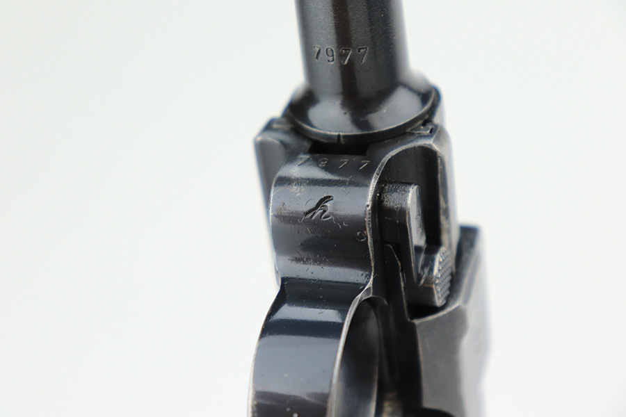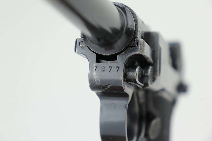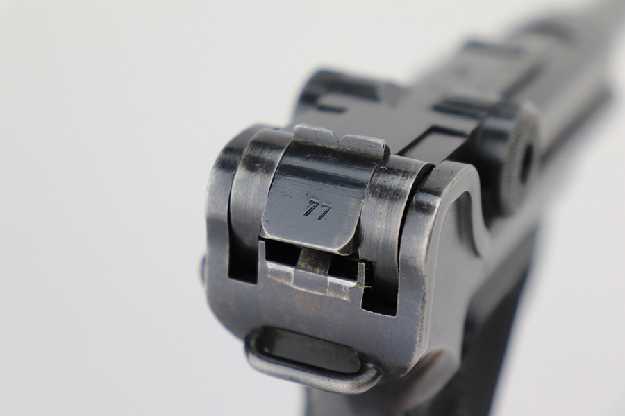 6/5/23 – This is a nice example of a BYF 42 “Black Widow” Mauser Luger issued to the Nazi military in 1942. It is all matching and has the proper “Eagle 135” military acceptance proofs. It comes with a set of original black bakelite “Black Widow” grips and comes as a rig with a nice 1942-dated holster, an “Eagle 655” Luger tool, and two original Black Widow magazines. The gun itself has retained roughly 80% of its original finish. There is wear around the muzzle, side plate, and high edges in general. Areas of noticeable thinning along the barrel, on both grip straps, and along the top and right side of the slide. Excellent bore with strong rifling.