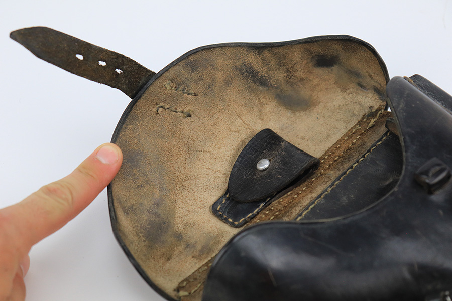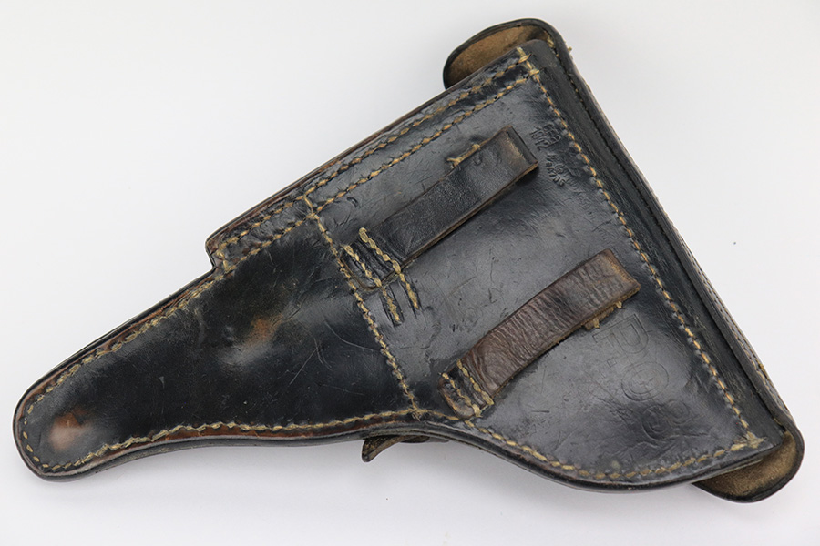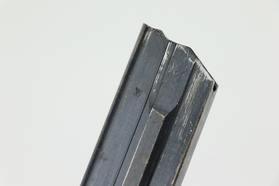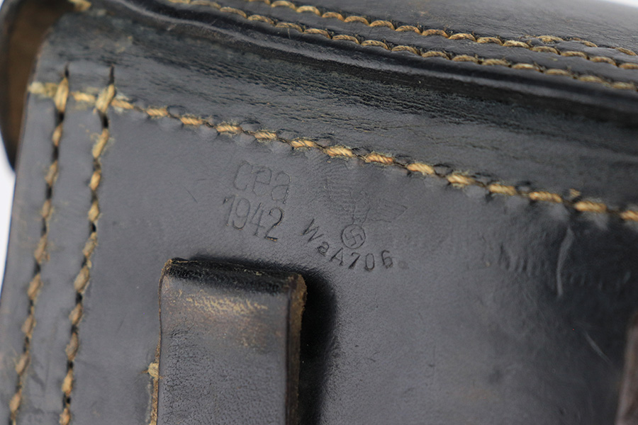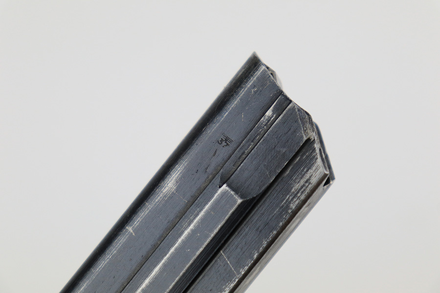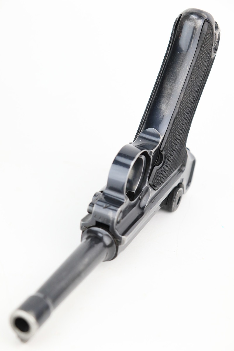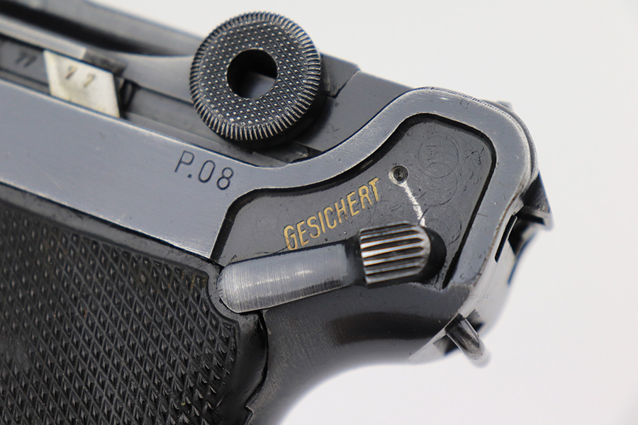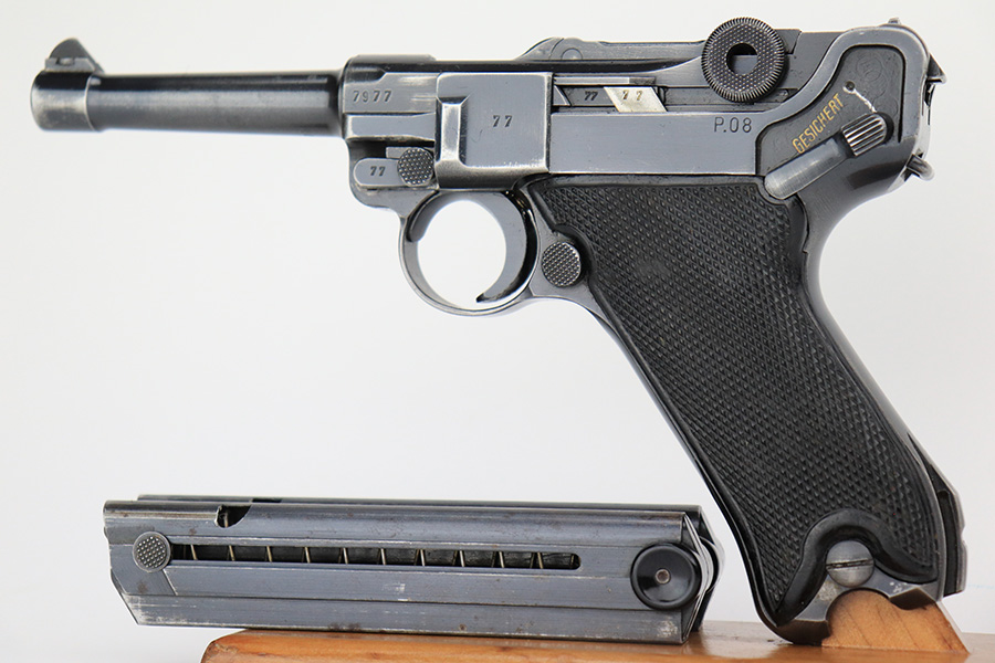 6/5/23 – This is a nice example of a BYF 42 “Black Widow” Mauser Luger issued to the Nazi military in 1942. It is all matching and has the proper “Eagle 135” military acceptance proofs. It comes with a set of original black bakelite “Black Widow” grips and comes as a rig with a nice 1942-dated holster, an “Eagle 655” Luger tool, and two original Black Widow magazines. The gun itself has retained roughly 80% of its original finish. There is wear around the muzzle, side plate, and high edges in general. Areas of noticeable thinning along the barrel, on both grip straps, and along the top and right side of the slide. Excellent bore with strong rifling.