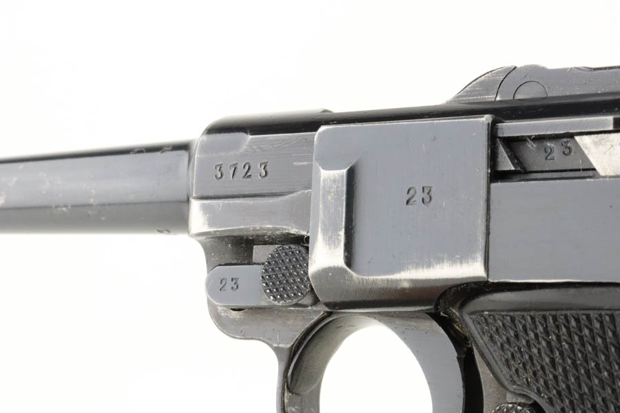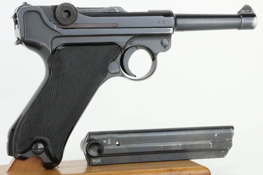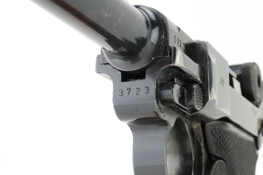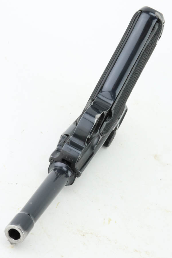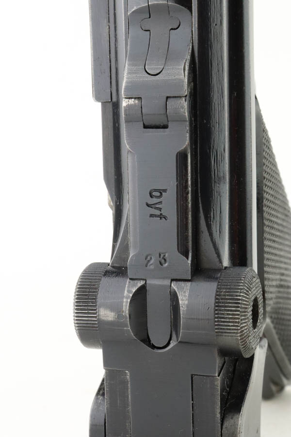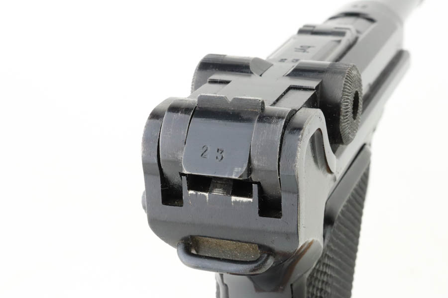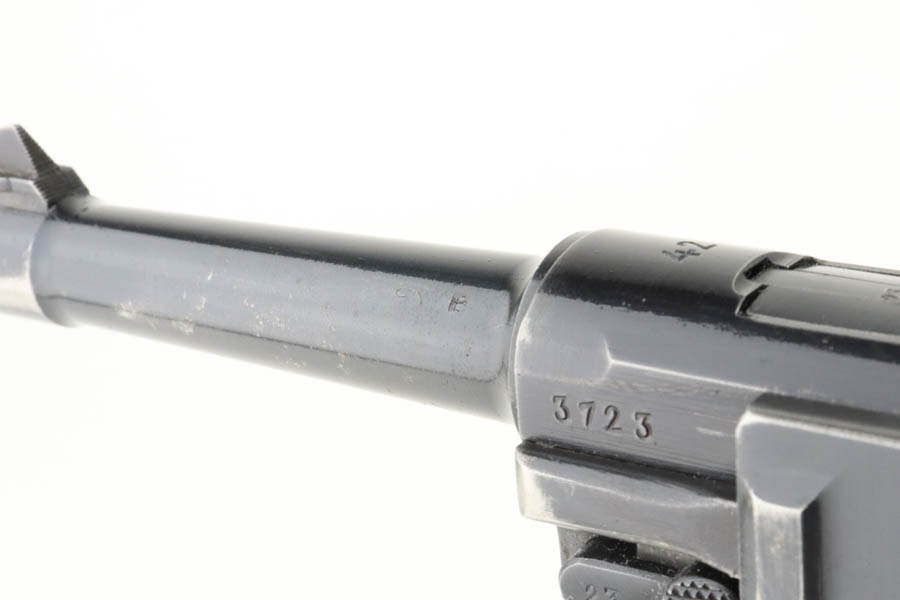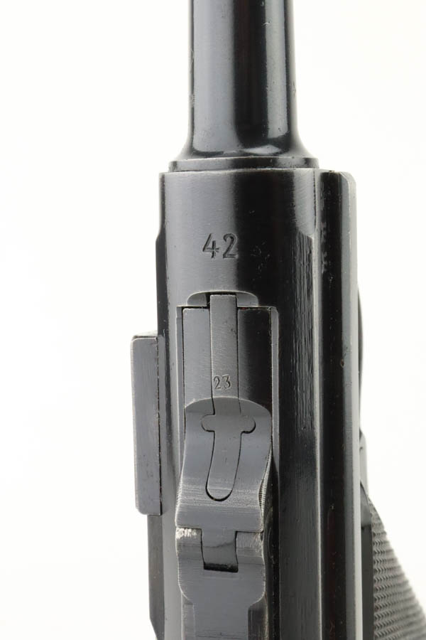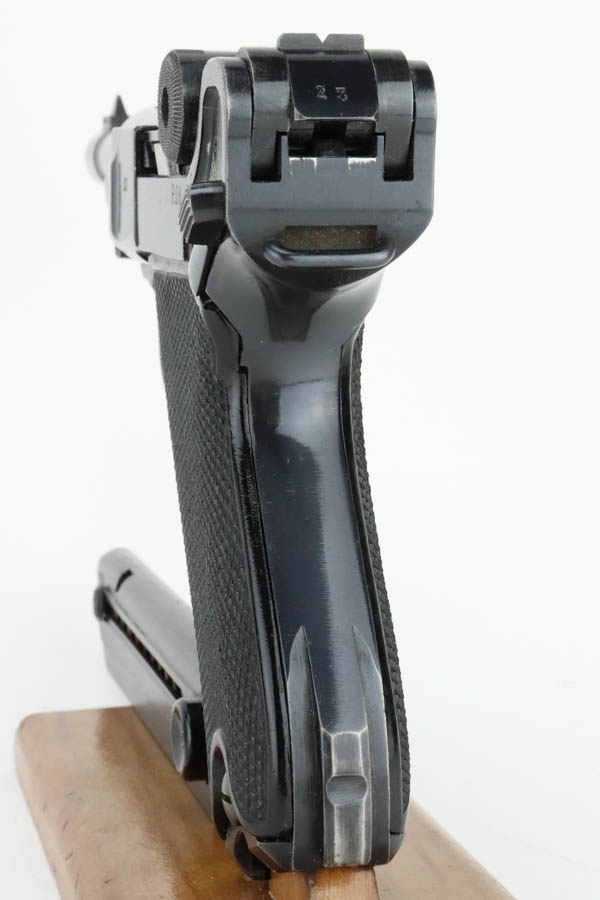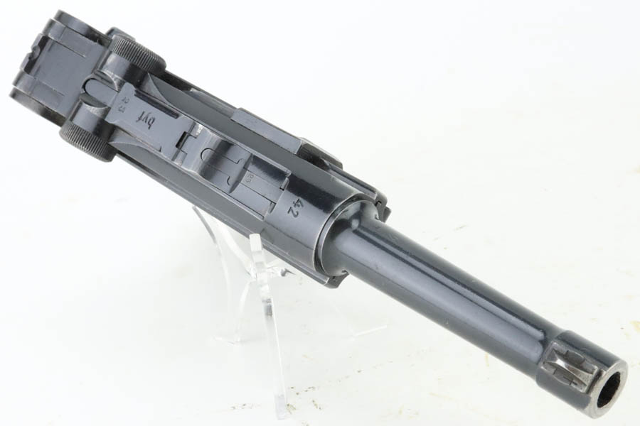 6/25/24 – This is a BYF 42 “Black Widow” Mauser Luger issued to the Nazi military in 1942. It is all matching, has the proper “Eagle 135” military acceptance proofs, and fitted with an excellent set of original “Black Widow” bakelite grips. It comes as a rig with one original “Black Widow” magazine and a nice 1941-dated holster. The gun has retained about 93% of its original finish with wear around the muzzle, high edges, and some small dots of discoloration along the left side of the barrel. Very nice bore with great rifling.