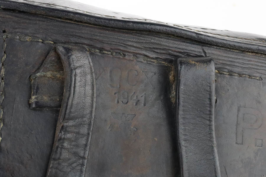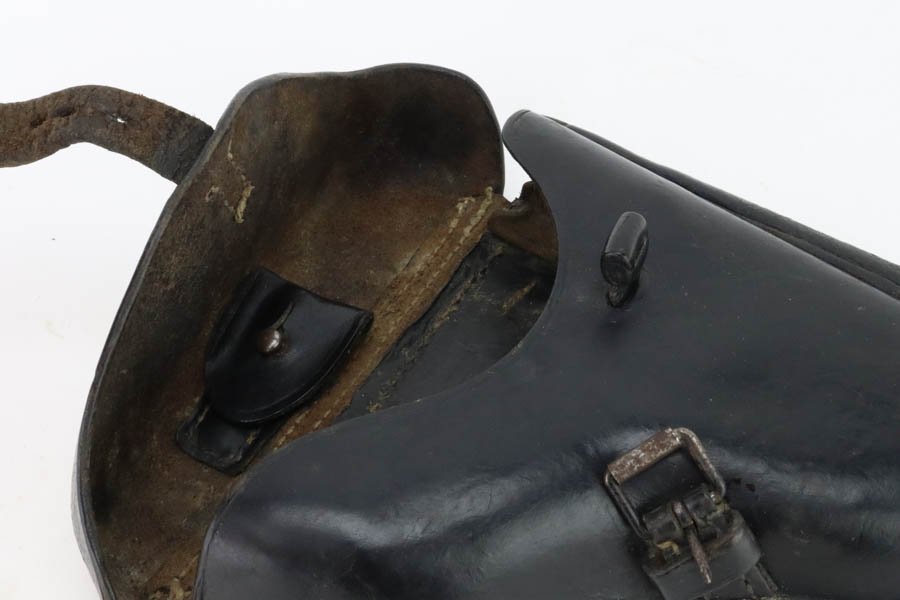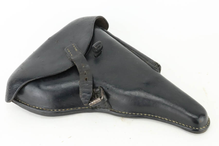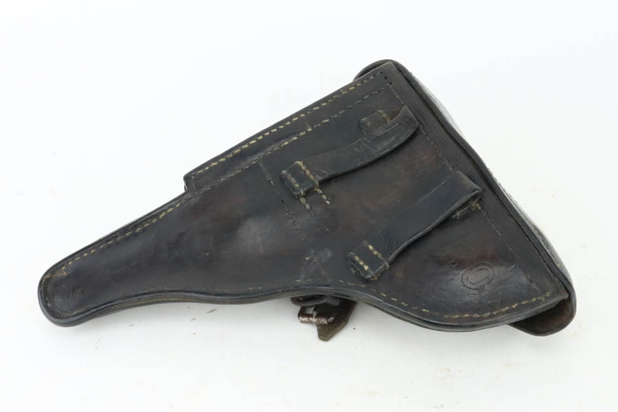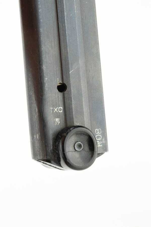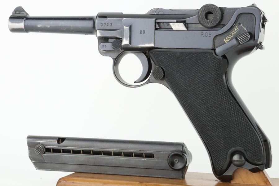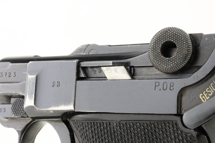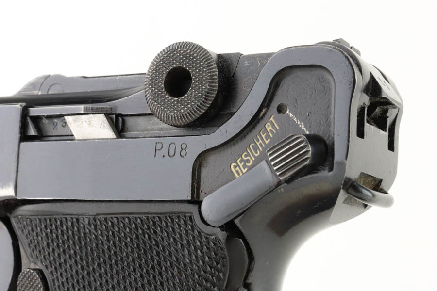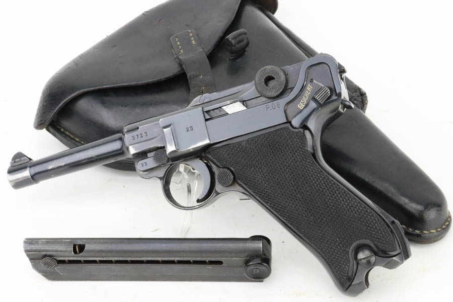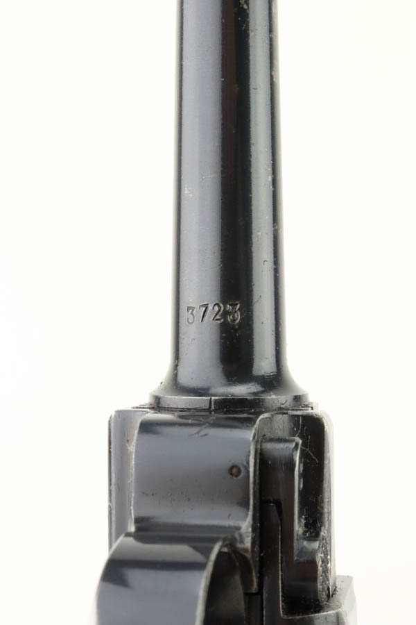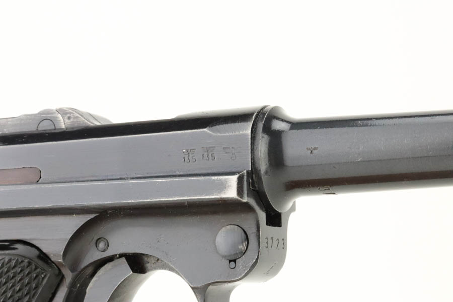 6/25/24 – This is a BYF 42 “Black Widow” Mauser Luger issued to the Nazi military in 1942. It is all matching, has the proper “Eagle 135” military acceptance proofs, and fitted with an excellent set of original “Black Widow” bakelite grips. It comes as a rig with one original “Black Widow” magazine and a nice 1941-dated holster. The gun has retained about 93% of its original finish with wear around the muzzle, high edges, and some small dots of discoloration along the left side of the barrel. Very nice bore with great rifling.