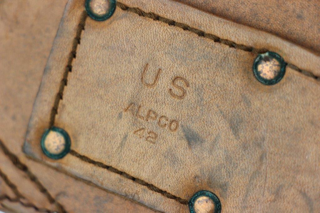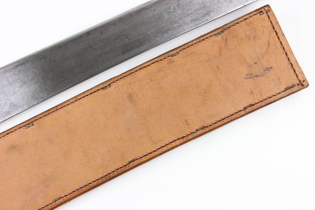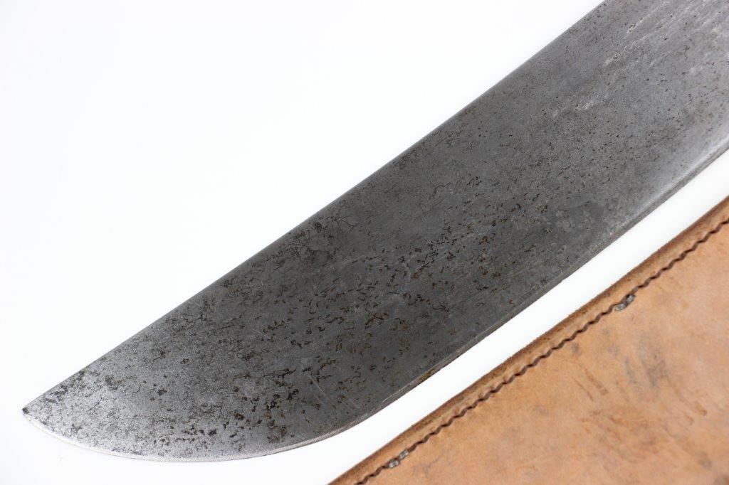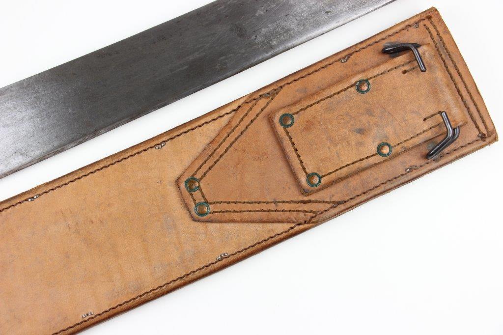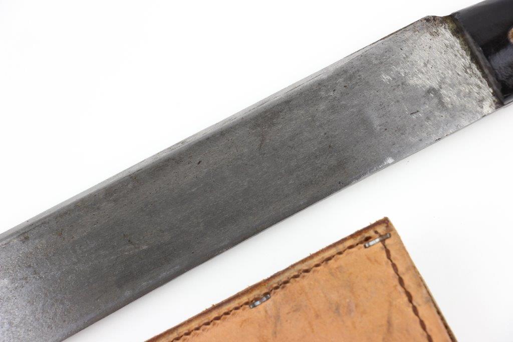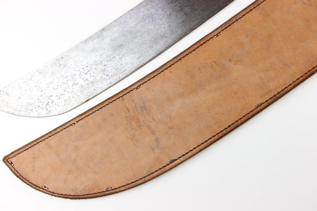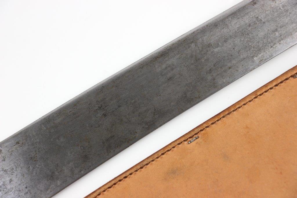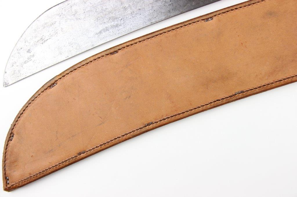 5/20/24 – This is an excellent example of an early WW2 US Military Machete with an early leather sheath. These machete’s were used in the Philippines and Japan during WW2 by the USMC. This example has a well marked blade that’s maker stamped and dated on one side. There’s spotty surface oxidation throughout the blade but no rust or pitting. The edge shows signs of use and sharpening, but there’s no excessive wear or damage. The original handle is in great shape, held together by 5 rivets. The blade measures about 22 inches long, with overall length around 27 inches. The highlight of this offering is the leather sheath, which is in minty condition and well marked with a maker and date on the backside. Most of these leather sheaths were worn and damaged in the humid climates they were often used in, making this an exceptional example.