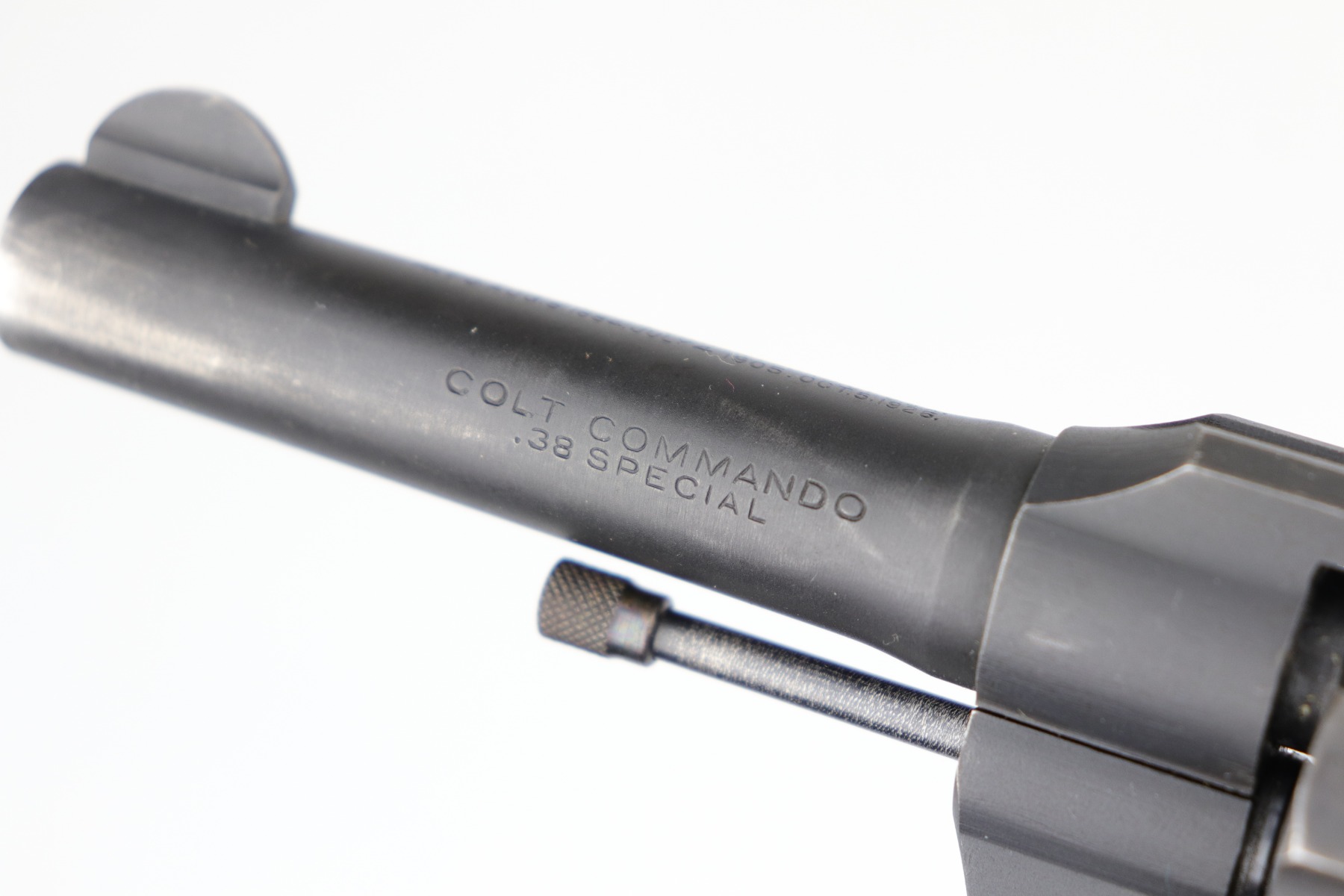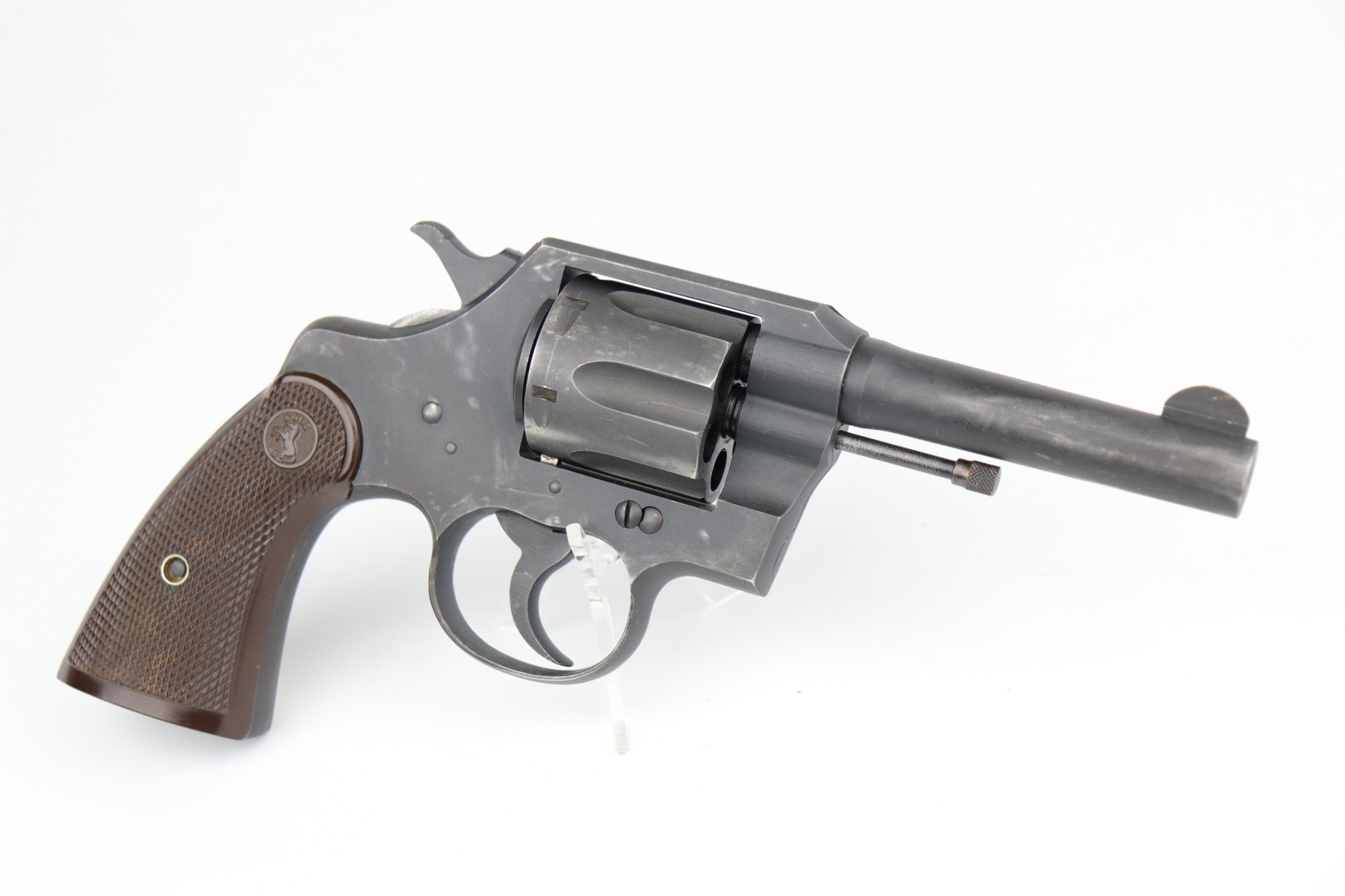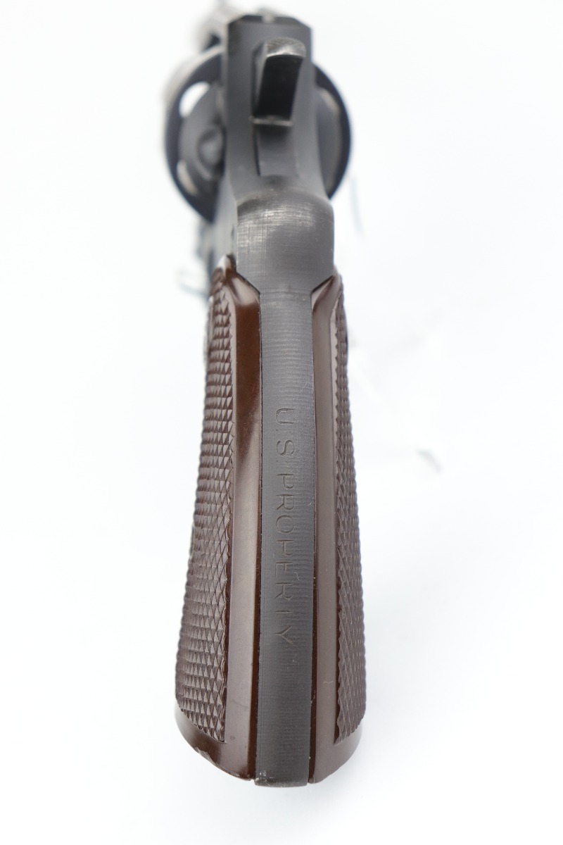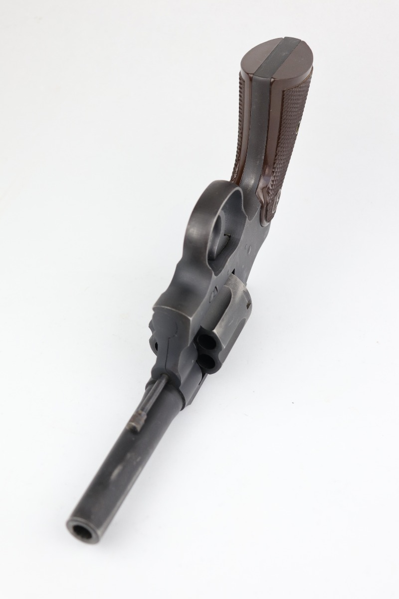 6/18/20 – This is a Colt Commando Revolver issued to the US Military during WW2, in 1942. It is chambered in .38 special. It has the proper flaming bomb proof on the left side of the frame. It is US Property-marked on the rear strap. It is all matching. This gun has retained about 92-94% of its original finish. Most of the wear is around the muzzle, discoloration on the right side of the barrel, and small spotty areas of wear on the cylinder, barrel, and frame throughout. The action is smooth and tight. Excellent bore – shiny with strong rifling. The grips are original and excellent. 4″ barrel.