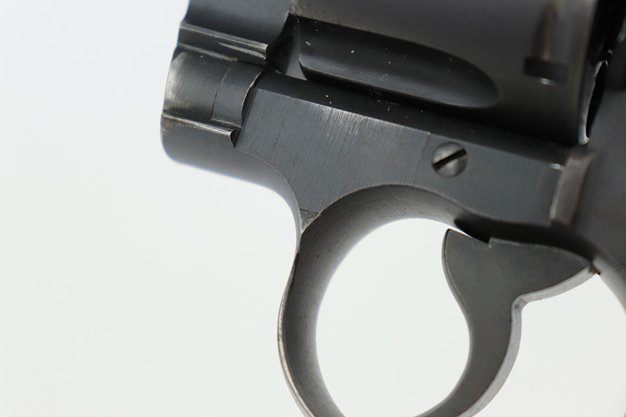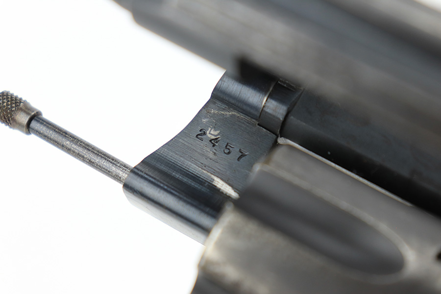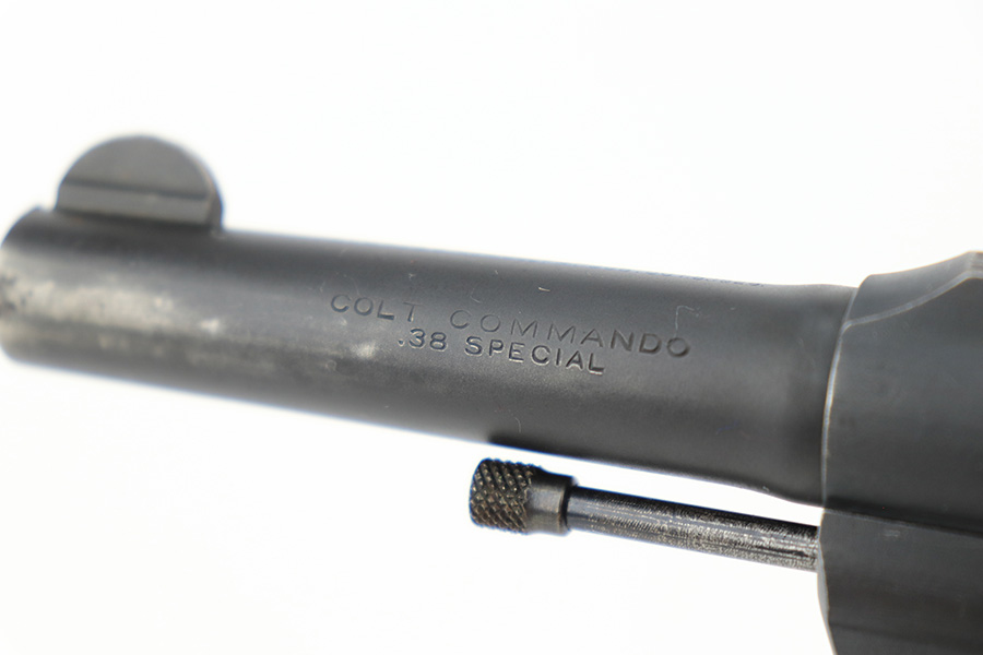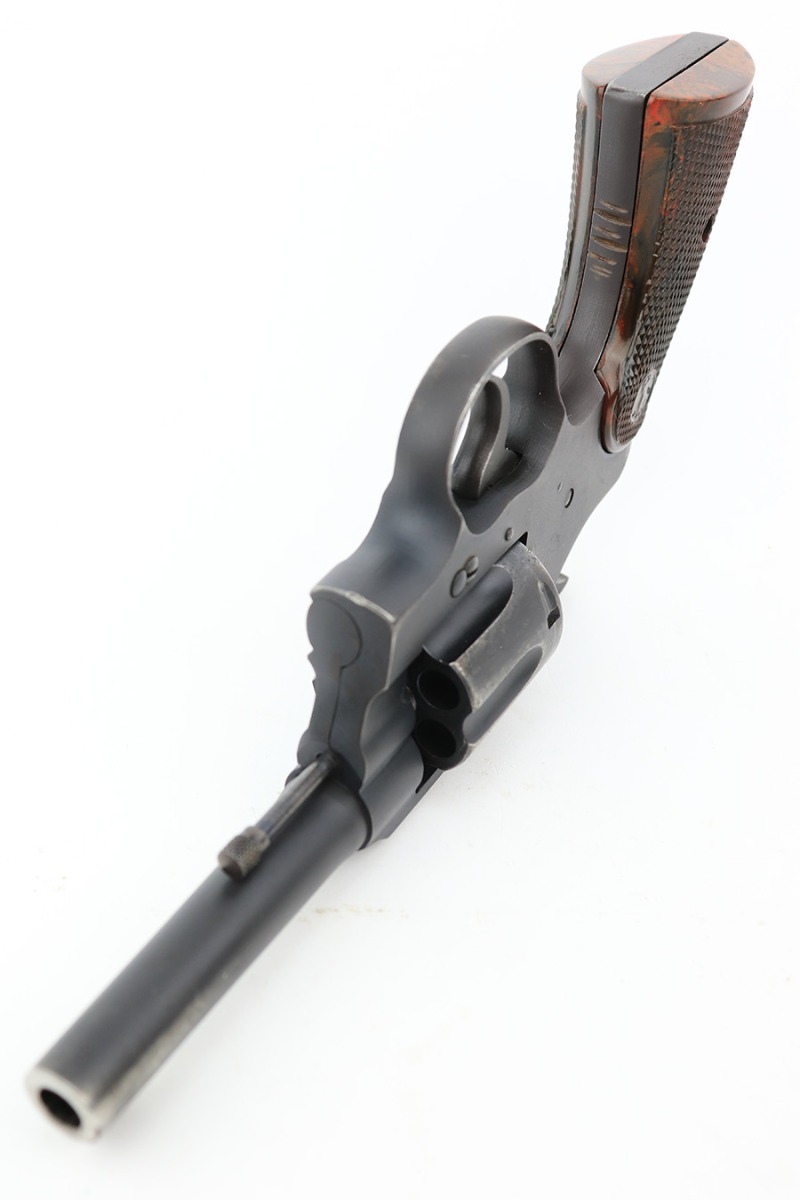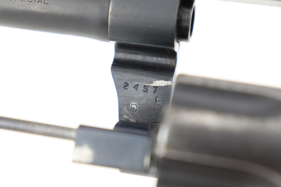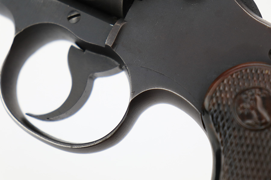 5/26/23 – This is a very nice example of a Colt Commando revolver, manufactured in 1942. It is all matching, and according to the included Colt Factory letter, it was delivered to an Andrew Charles at a City-County building in the Pittsburgh, PA on December 22, 1942. There is a small military flaming bomb proof on the left side of the frame. Since the gun was not initially delivered to the military, this marking was presumably added later. The gun itself has retained about 90% of its original parkerized finish with areas of wear and very light spotty oxidation around the muzzle, on the top strap, and on the high edges of the cylinder. There are several deep cut marks in the metal on the front strap. They appear to be intentional. The gun is fitted with excellent brown/black marbled plastic grips. Comes with an extra set of wood grips – they are numbered but do not match the gun. Near-mint bore.