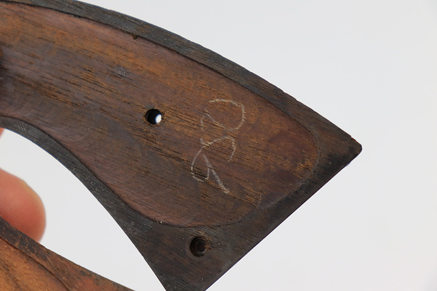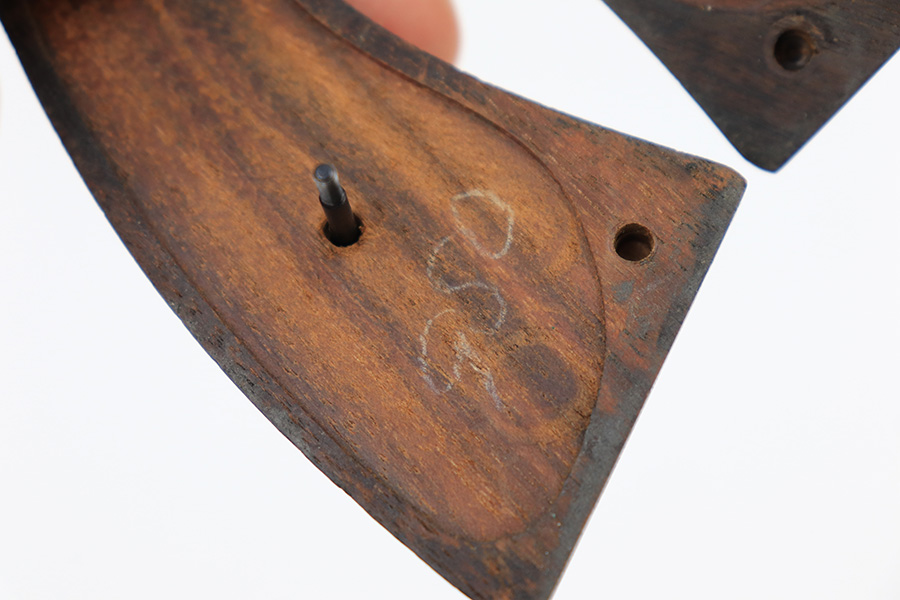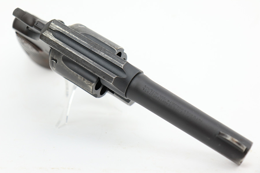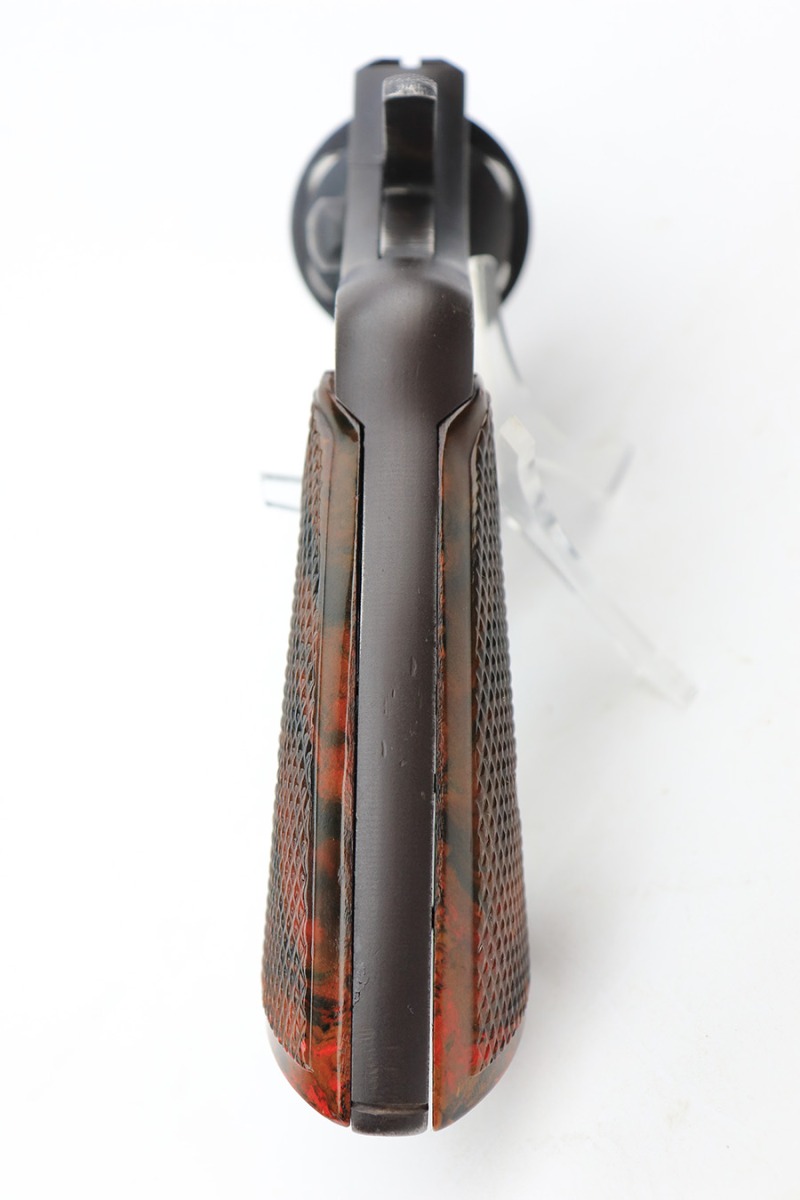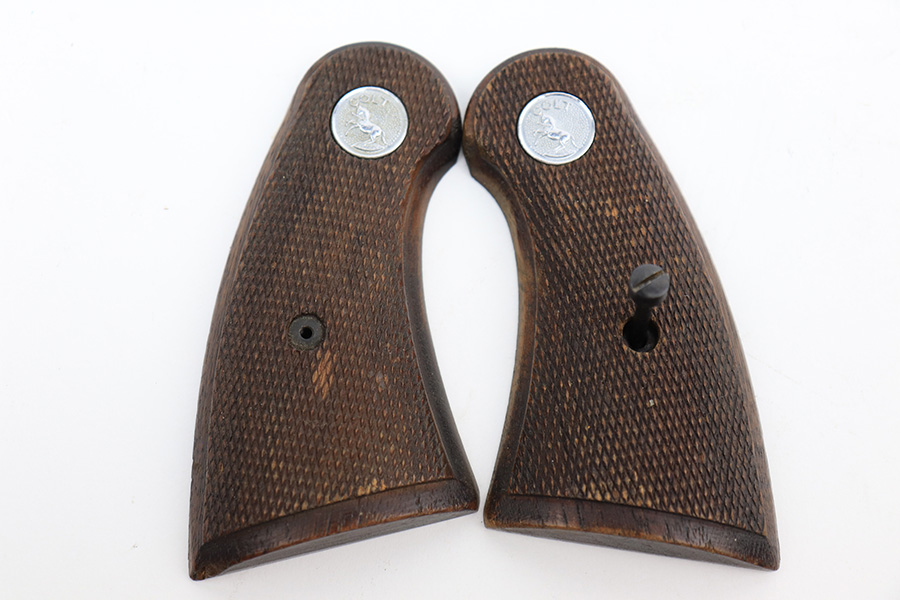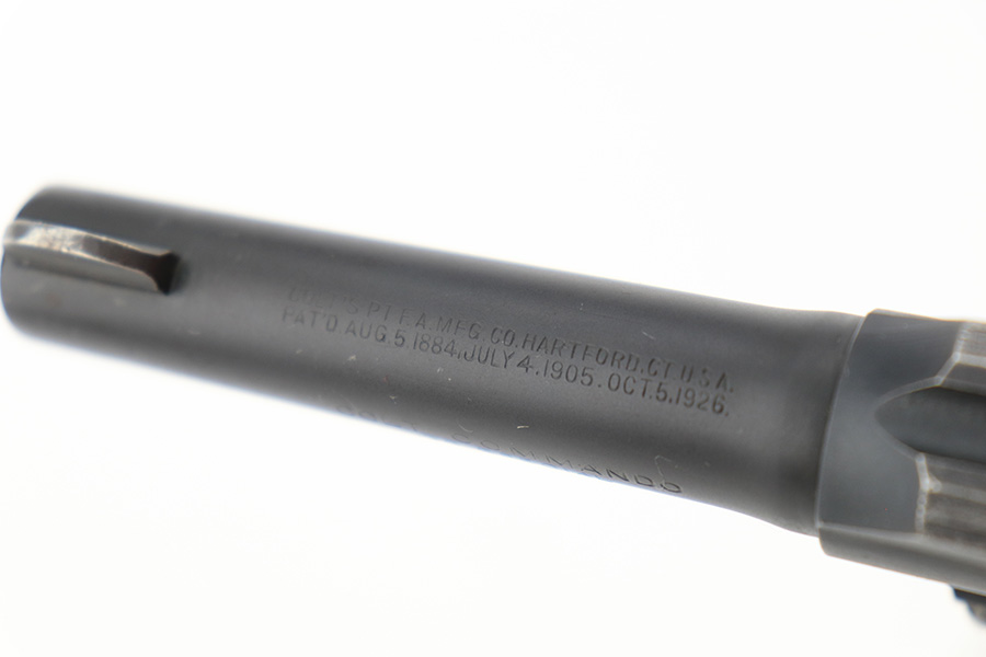5/26/23 – This is a very nice example of a Colt Commando revolver, manufactured in 1942. It is all matching, and according to the included Colt Factory letter, it was delivered to an Andrew Charles at a City-County building in the Pittsburgh, PA on December 22, 1942. There is a small military flaming bomb proof on the left side of the frame. Since the gun was not initially delivered to the military, this marking was presumably added later. The gun itself has retained about 90% of its original parkerized finish with areas of wear and very light spotty oxidation around the muzzle, on the top strap, and on the high edges of the cylinder. There are several deep cut marks in the metal on the front strap. They appear to be intentional. The gun is fitted with excellent brown/black marbled plastic grips. Comes with an extra set of wood grips – they are numbered but do not match the gun. Near-mint bore.