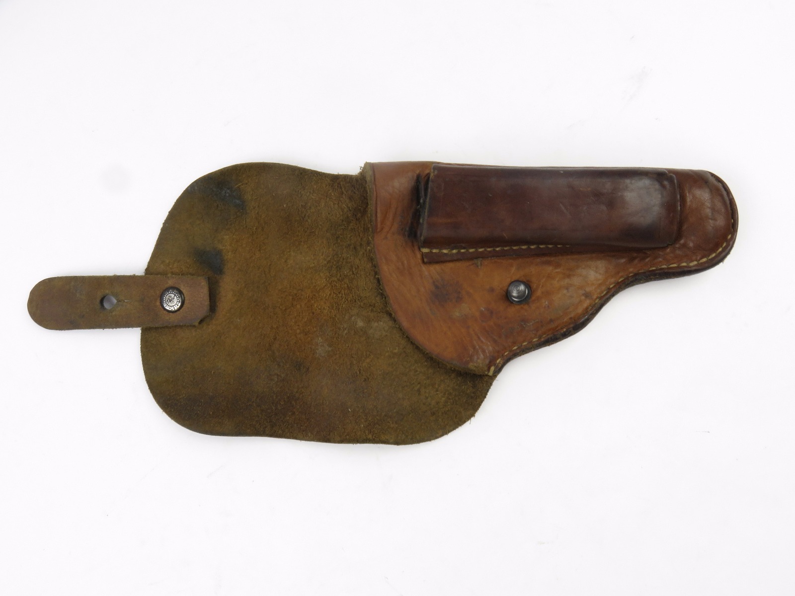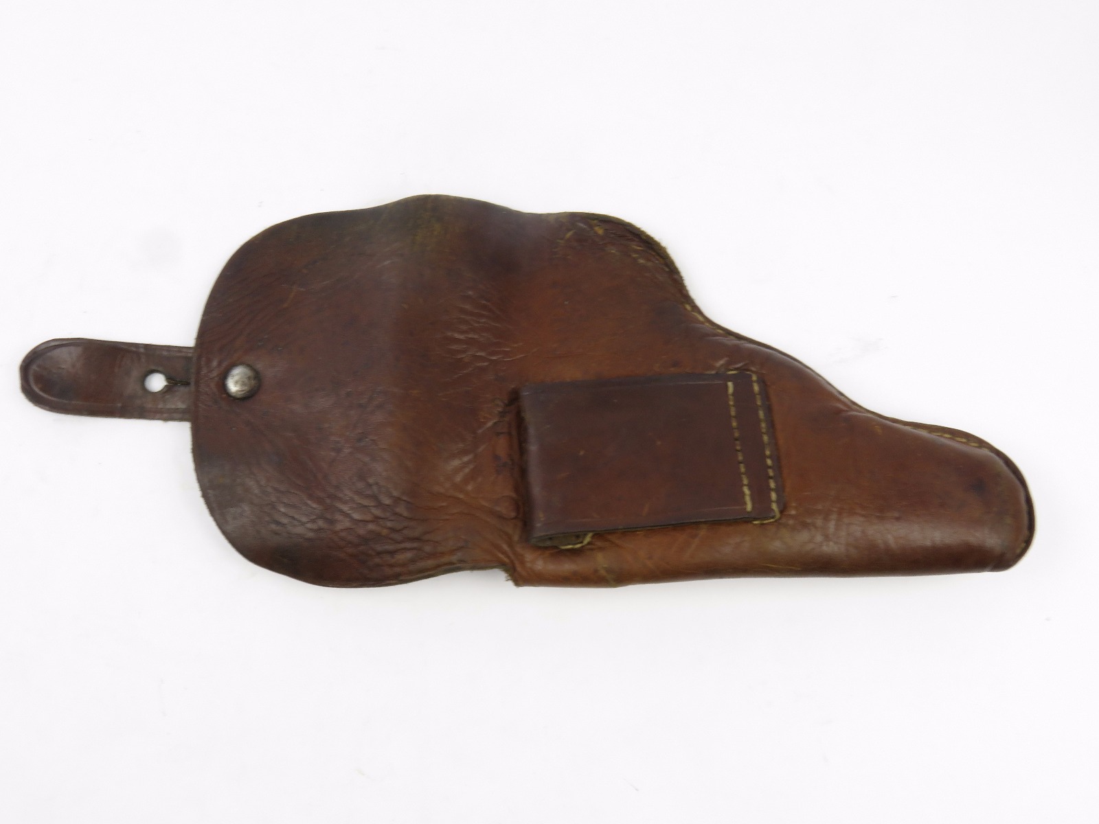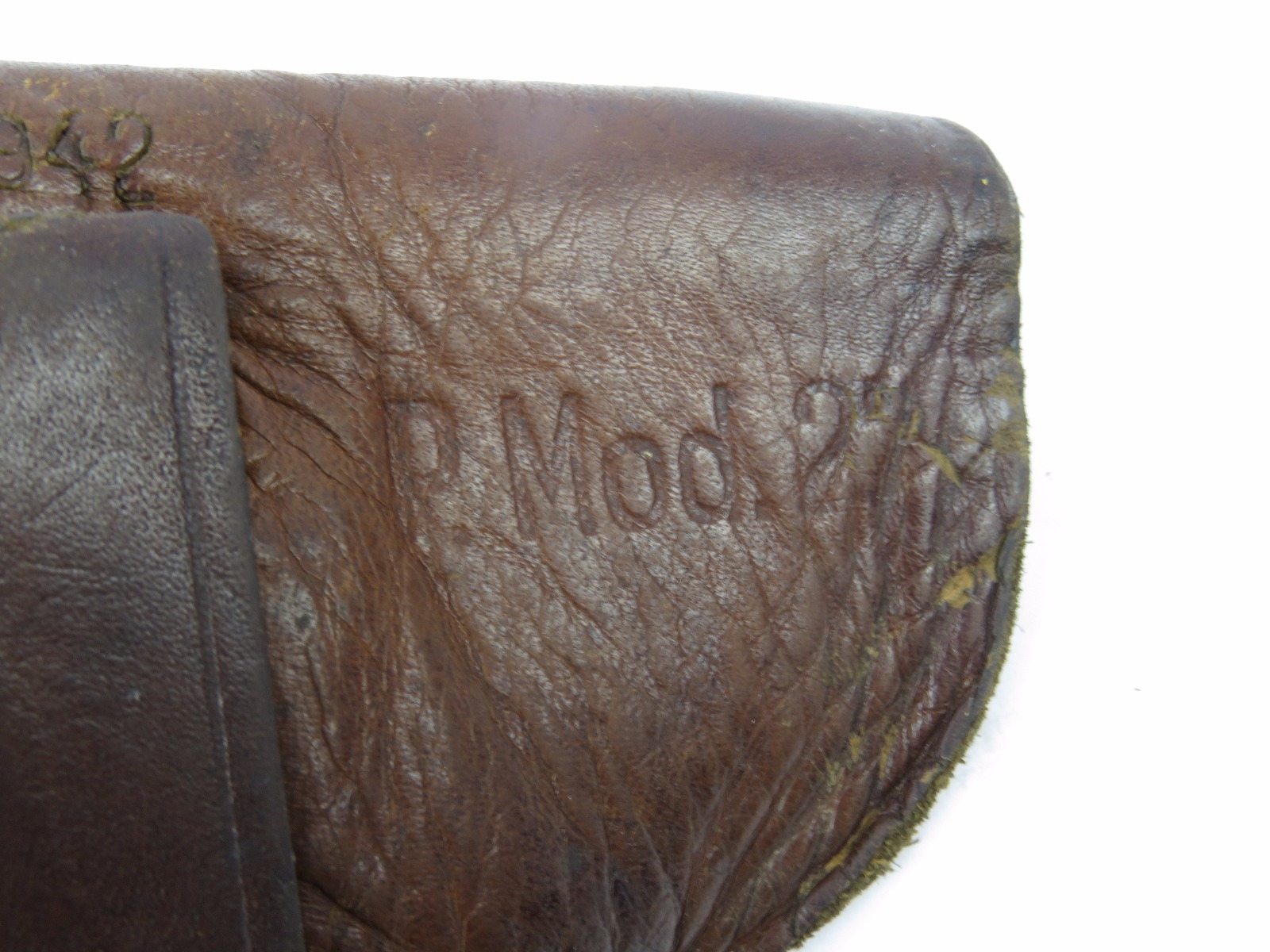8/9/17 – This is an original CZ model 27 holster from WW2. The back of the holster is 1942 dated, waffen stamped, and stamped with a CZ logo. The CZ logo appears to have raised out, because all that remains is the exterior circle of the stamp. The back leather is also P. Mod. 27 stamped. The leather is very soft and pliable. The leather is very worn with age and use, but completely in tact. The stitching is all in tact and original. No major issues, only normal use and aging signs.