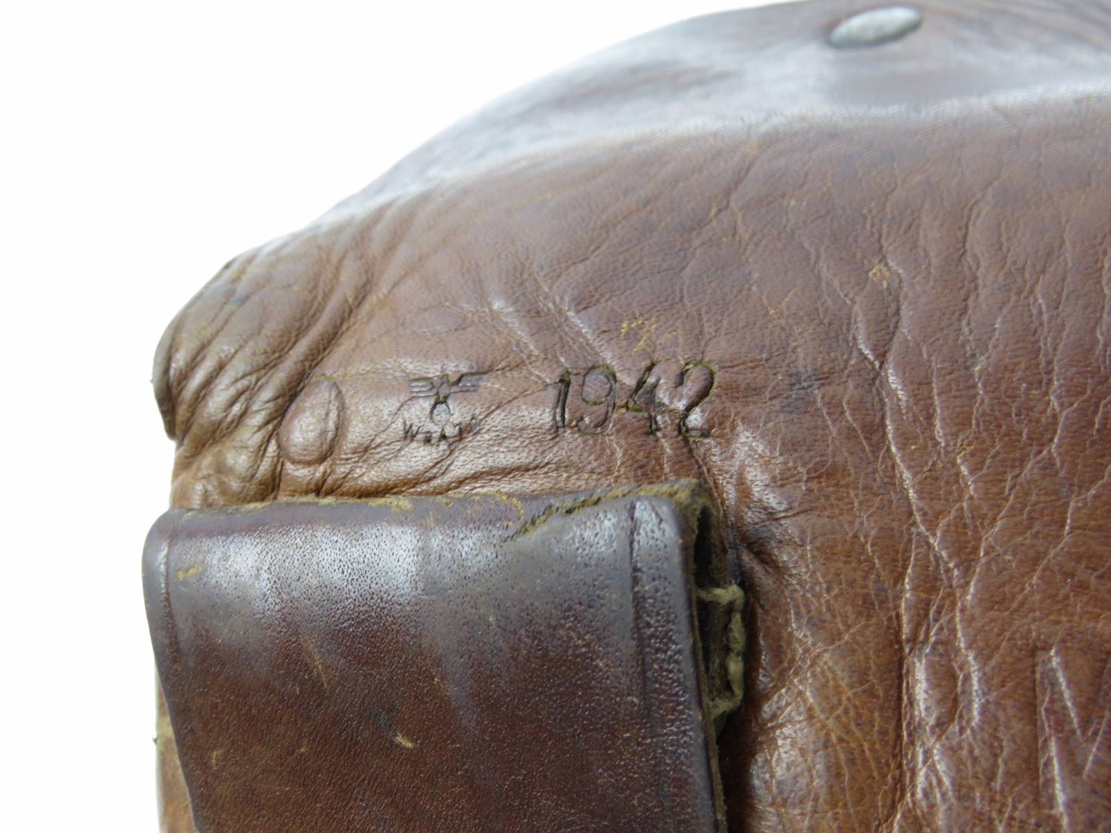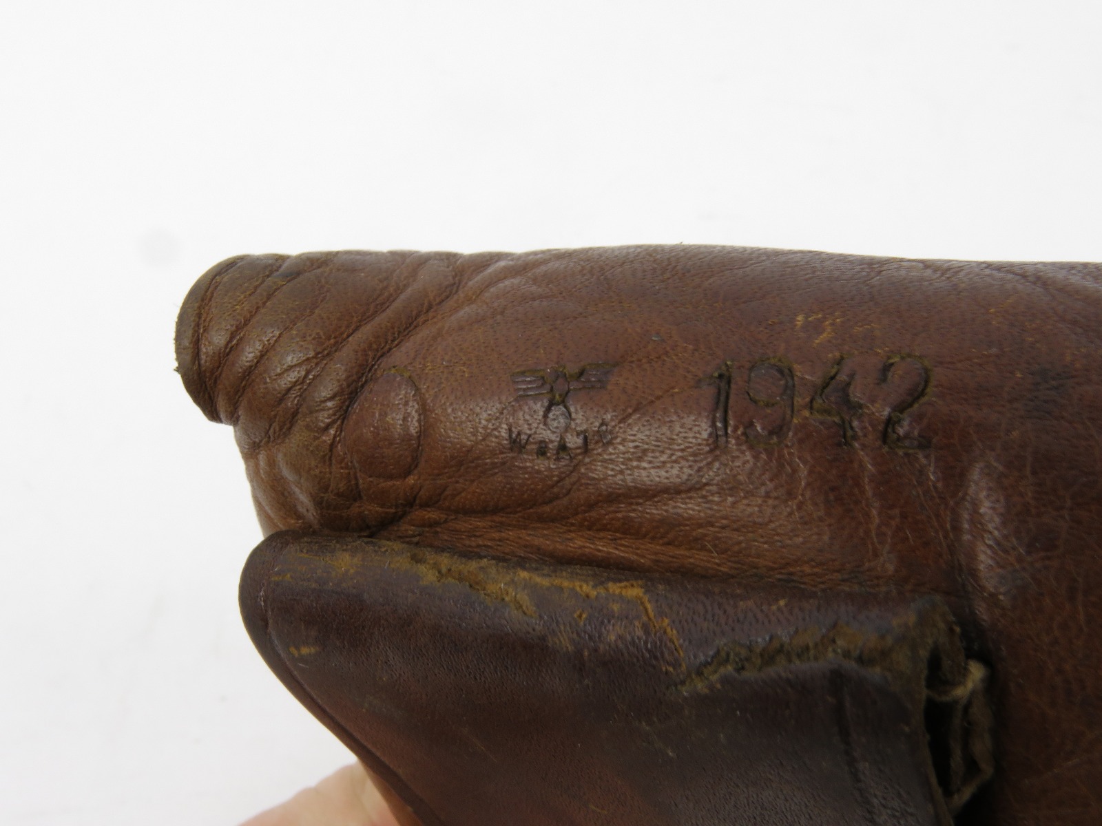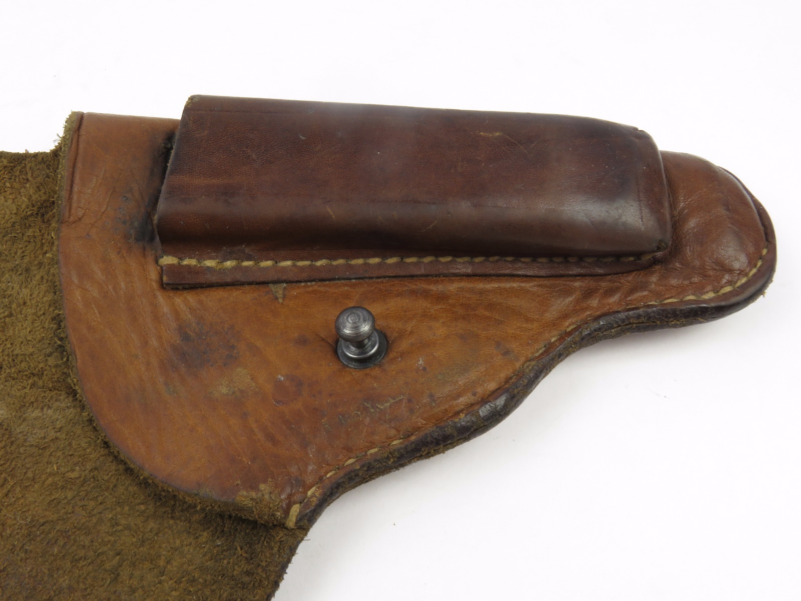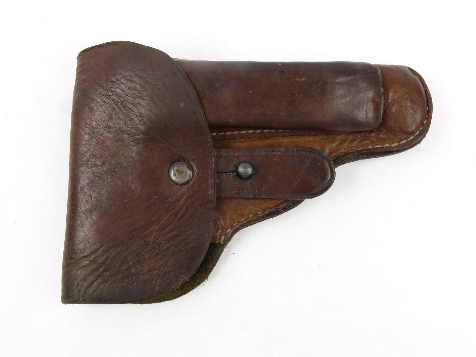 8/9/17 – This is an original CZ model 27 holster from WW2. The back of the holster is 1942 dated, waffen stamped, and stamped with a CZ logo. The CZ logo appears to have raised out, because all that remains is the exterior circle of the stamp. The back leather is also P. Mod. 27 stamped. The leather is very soft and pliable. The leather is very worn with age and use, but completely in tact. The stitching is all in tact and original. No major issues, only normal use and aging signs.