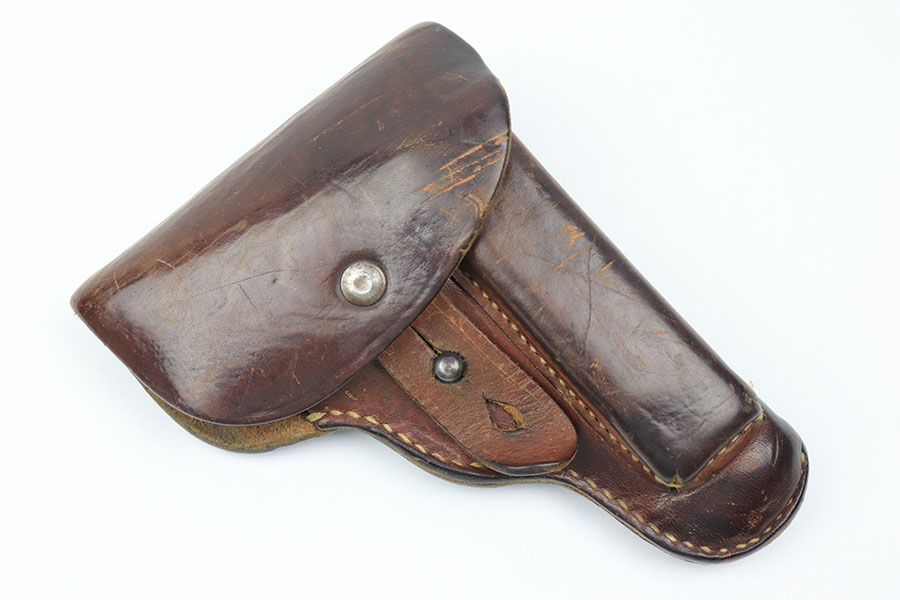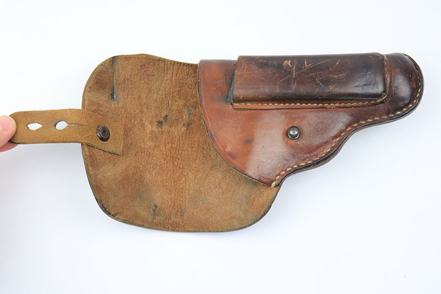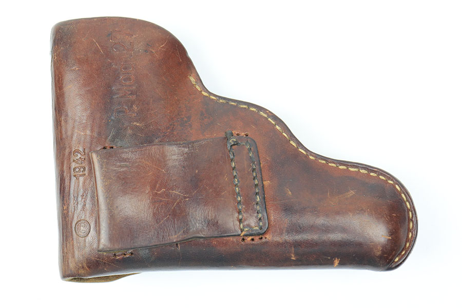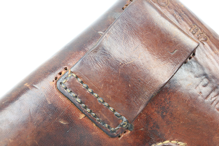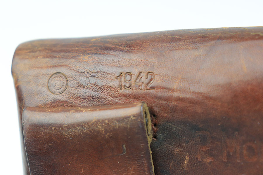 12/20/21 – This is an original 1942 dated CZ 27 holster. The holster has very nice leather and is well marked on the back with the CZ logo, a waffen military proof stamp, a 1942 date stamp, and a model identification stamp. The back belt loops look like they may be an old re-stitch. The leather is in great condition. The closure strap has an added “adjustment” hole – this was done post-factory.