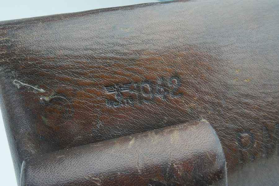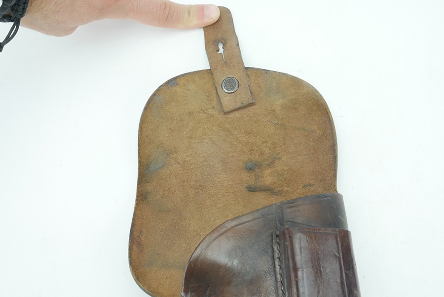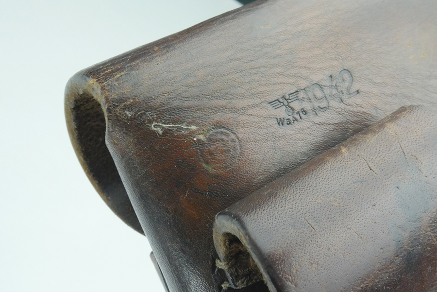 6/19/24 – This is an original WW2 CZ model 27 holster in great condition. The back of the holster is CZ stamped, Waffen “Eagle WaA76” military proof stamped, 1942 dated, and Model 27 stamped. The leather is completely intact, but there is some minor surface wrinkling along the flap, and some minor scuffing on the back leather. The stitching is original and intact. Nice clean interior. These are hard to find in this condition.