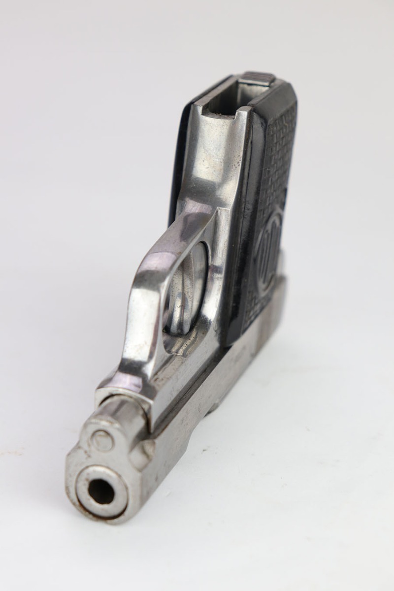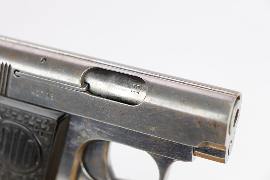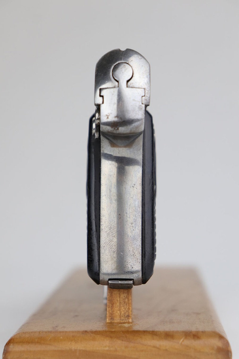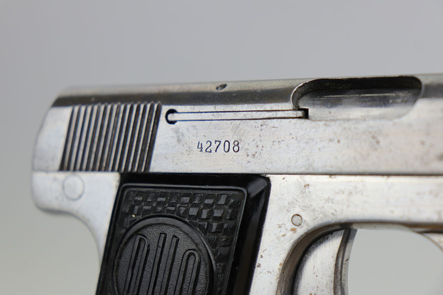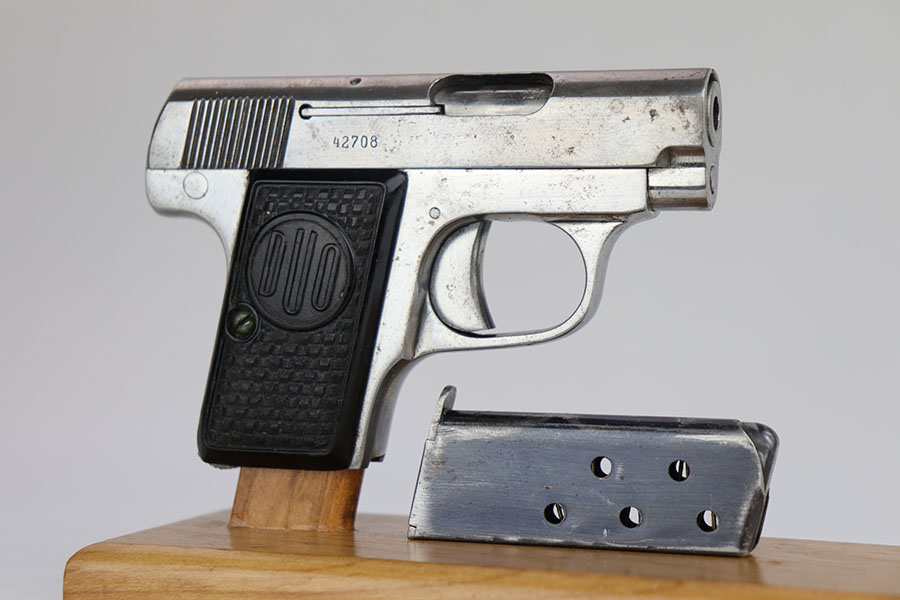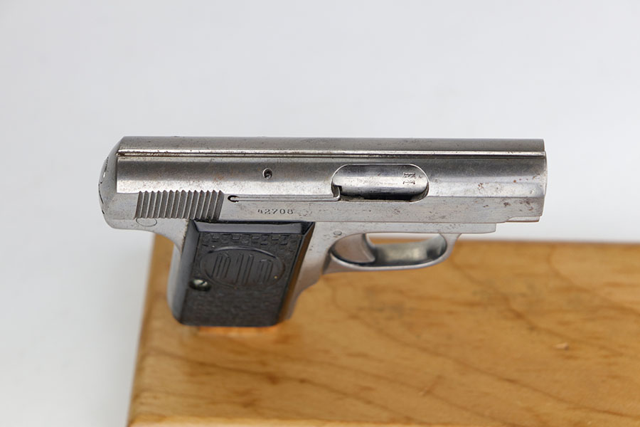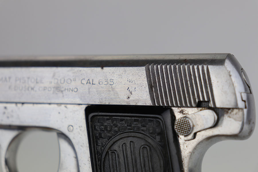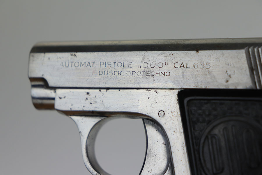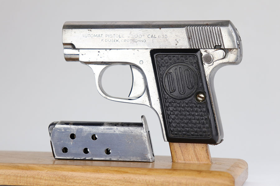The name ‘DUO’ comes from the combination of Dusek and Opocno, which is the last name of the original manufacturer and the city he gunsmithed in. Dusek’s first pistols bore the name Singer, and later Ydeal. However, by 1938, he was using the name DUO. When Dusek refused to coöperate with the Nazis during World War II, they took over his factory and proceded to produce over 110,000 DUO pistols. The DUO was also very popular with the Germans and was sold to the public at large through various sporting goods stores. From the first, Dusek’s pistols were very well made. His production standards were higher than those of the Spanish manufacturers whose pistols he imported, and his pistols were more expensive as well. The DUO is a single action pistol virtually identical to the original Browning-designed Colt .25 hammerless vest pocket model.