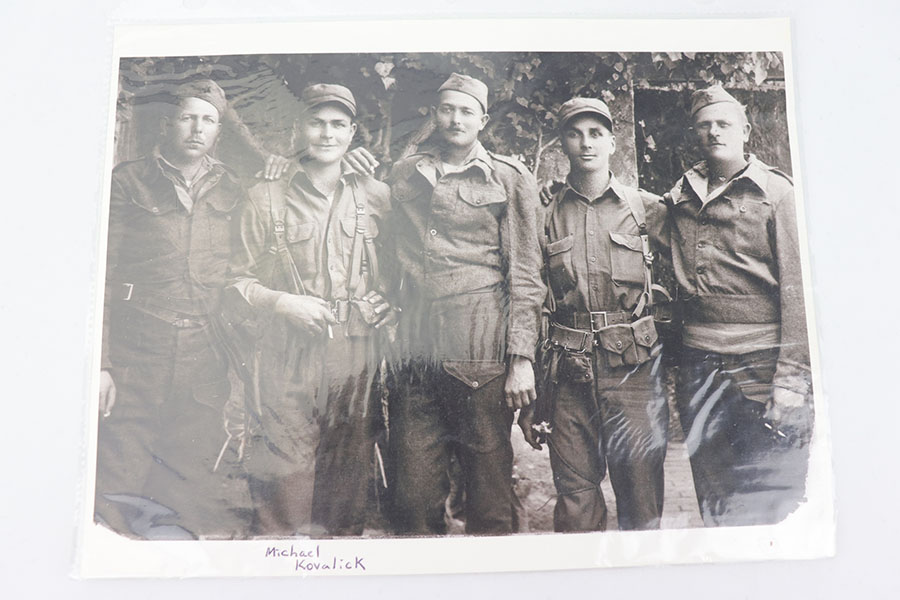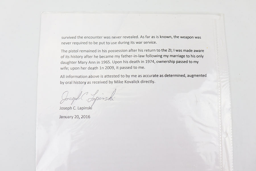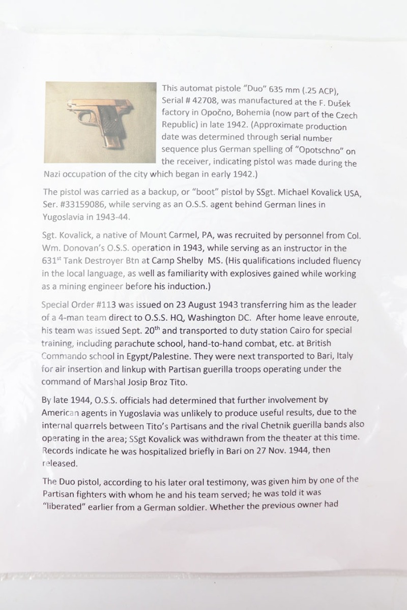 4/10/20 – This is a very interesting Czech Duo that has a rich history, with accompanying documentation of its story. The pistol was made in 1942 at the F. Dusek factory in Opocno, Bohemia. We originally thought this gun had been re-nickeled but after further inspection, believe that someone has deliberately put the gun ‘in the white’ and removed the bluing. Original grips are present and in good condition. Bore has good rifling but some frost and freckling. The pistol is accompanied by signed account of son-in-law of Ssgt. Michael Kovalick, who brought the pistol back. The story provides details about how Kovalick came to obtain the pistol while serving as an O.S.S. agent behind German lines in Yugoslavia. Also includes a photo of Kovalick during the war.