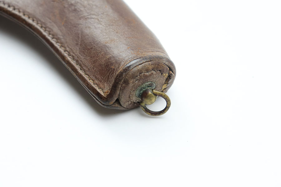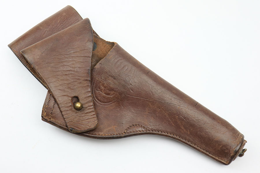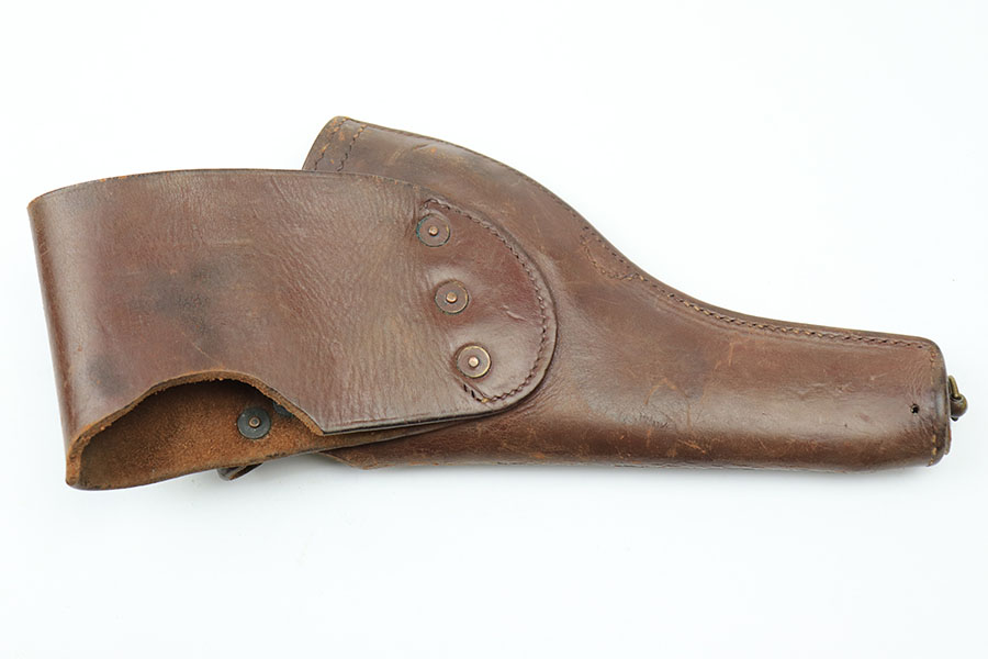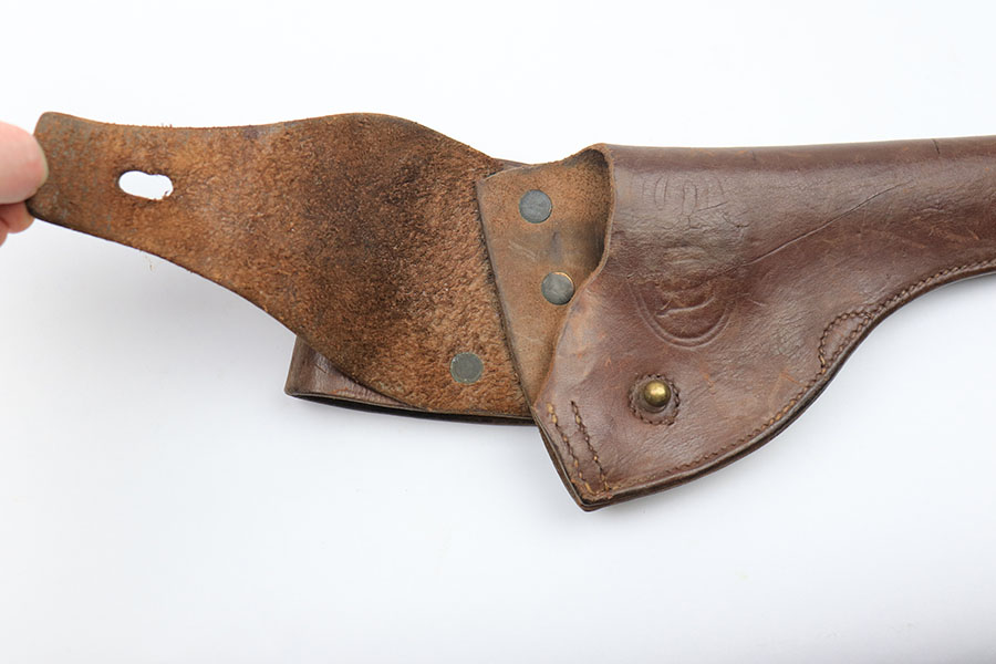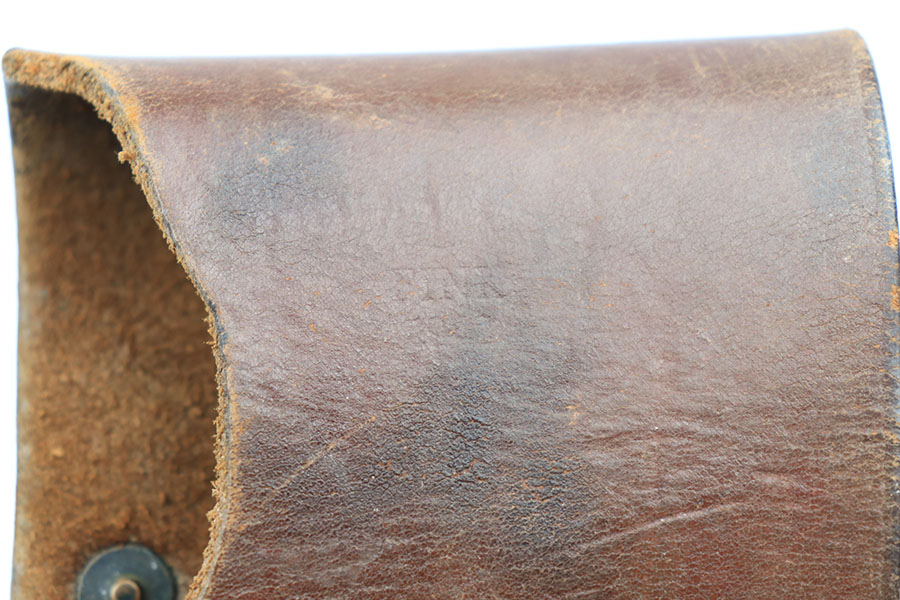 5/10/21 – This is a US military revolver holster for a Colt & Smith & Wesson used during the WW2 era. The holster is stamped on the back belt loop with a very faint “FINK 1942” stamp (have to look in the right light). The back belt loop also appears to be cut for whatever reason. The leather is in good overall condition with normal pliability and wear. Stitching is in great condition and all intact except for a few stitches in the toe. Priced accordingly.