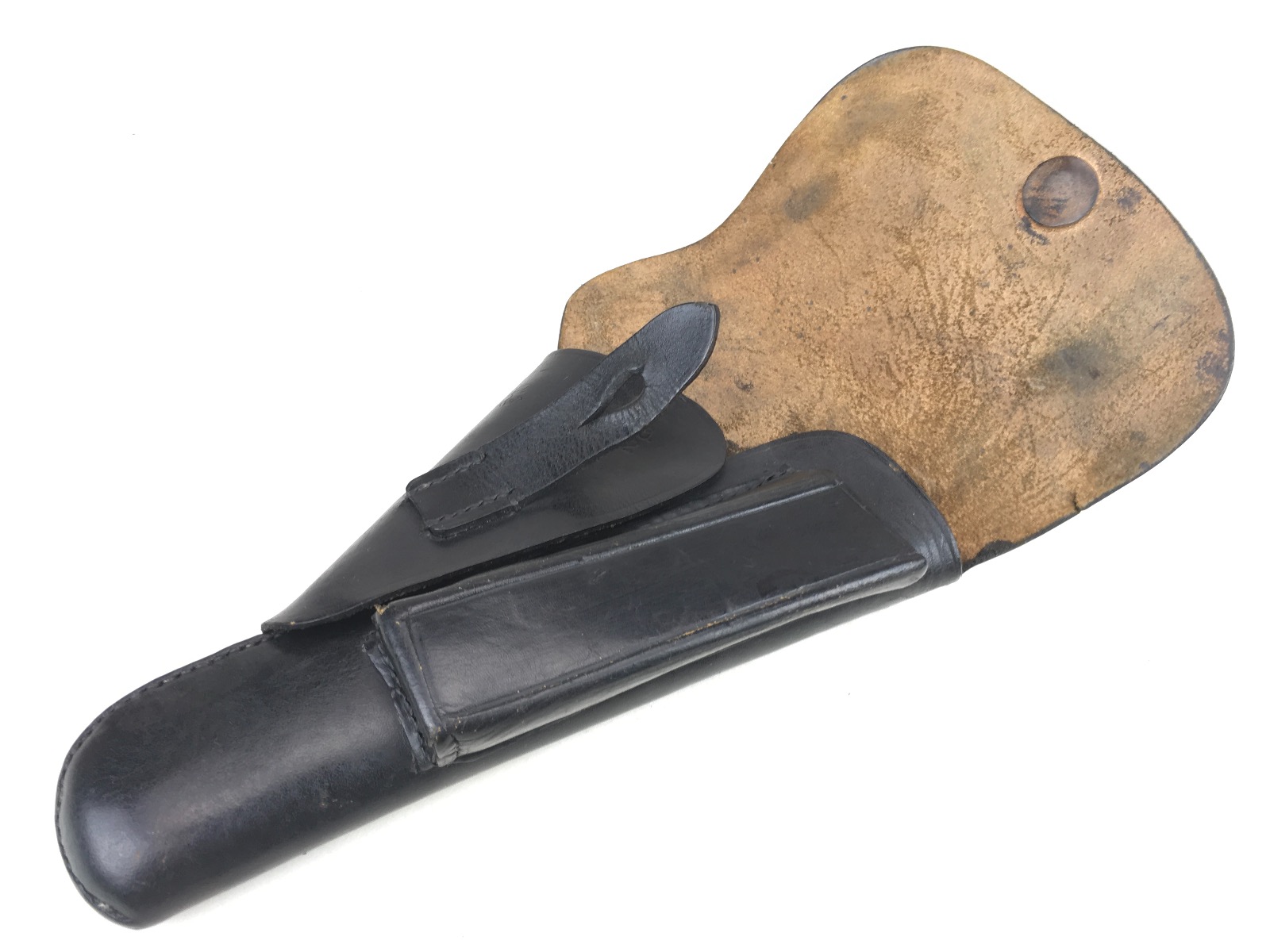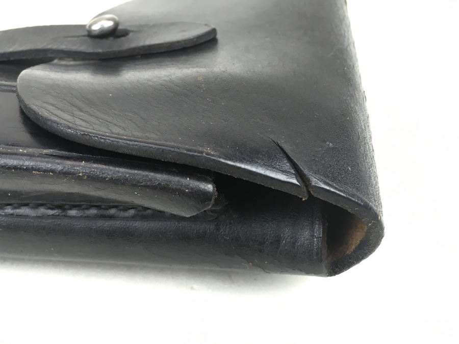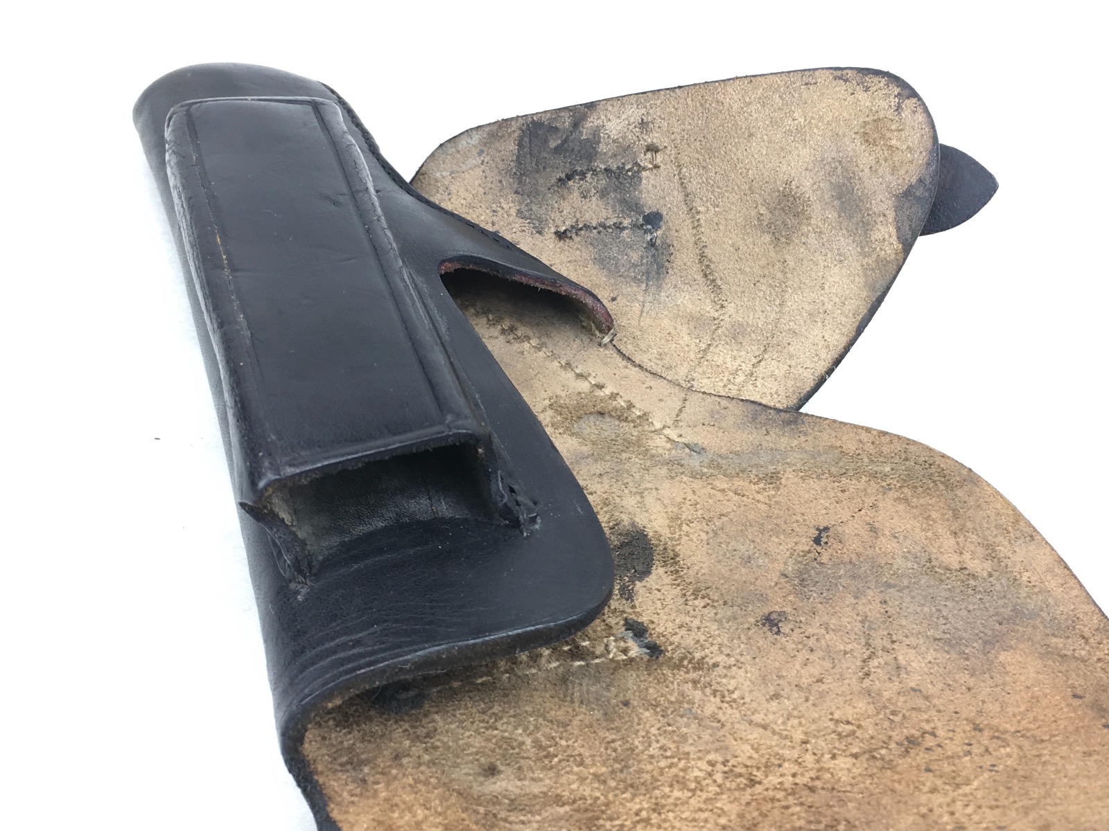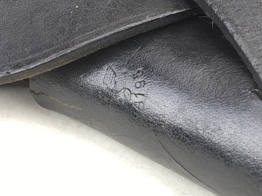 9/23/19 – This is a fairly early and scarce 1942 dated Hi Power holster. Most hi power holsters found today are 1943 or 1944 dated. This holster is dated under the closure strap along with an “dta” maker stamp and waffen WaA195 proof stamp. The black leather has some wrinkling and normal surface wear (signs of use and aging) throughout the leather. One very minor cut on the right side of the closure flap. The stitching is completely in tact and tight. Overall this is a great piece that shows some honest wear and use. Guaranteed original.