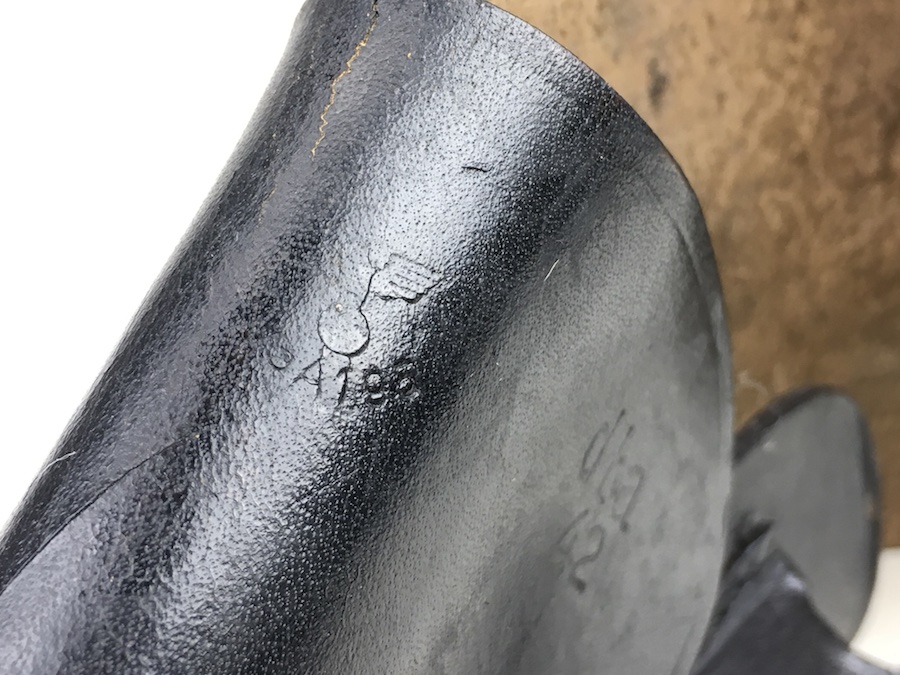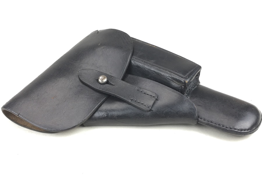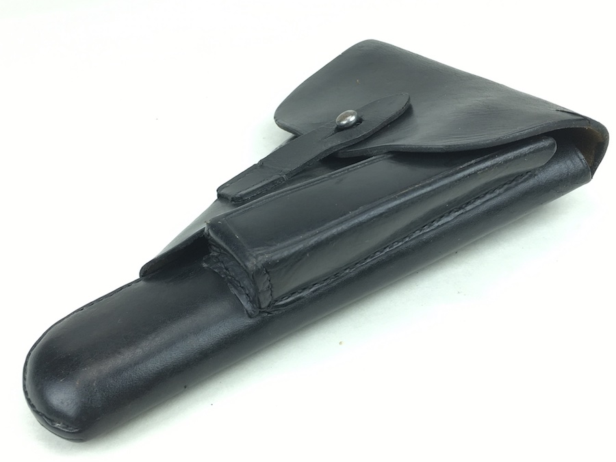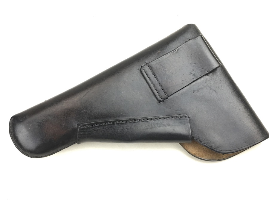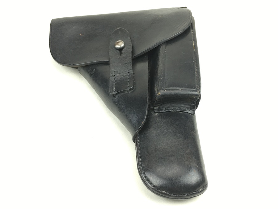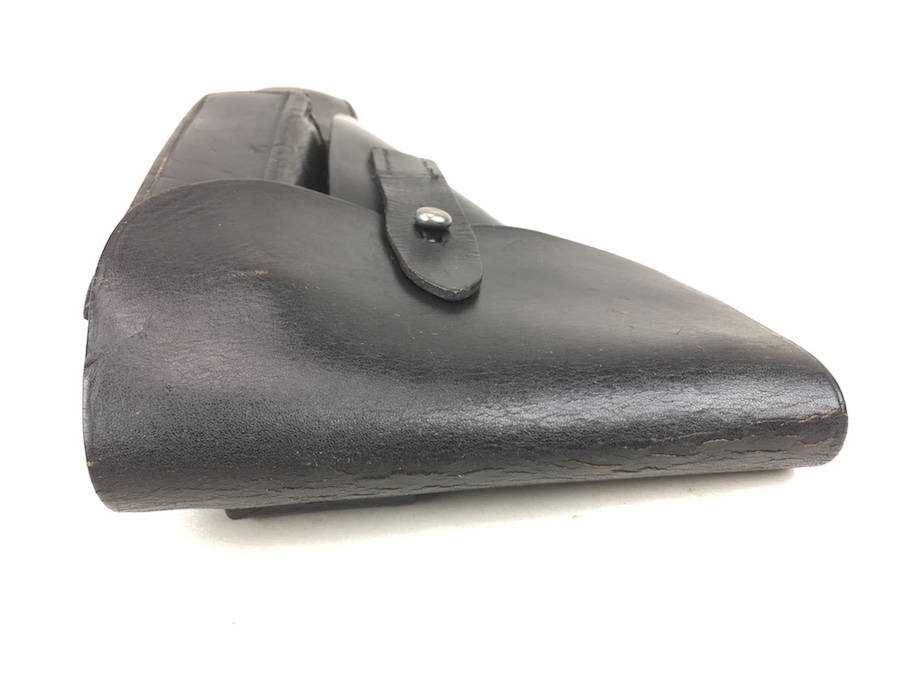 9/23/19 – This is a fairly early and scarce 1942 dated Hi Power holster. Most hi power holsters found today are 1943 or 1944 dated. This holster is dated under the closure strap along with an “dta” maker stamp and waffen WaA195 proof stamp. The black leather has some wrinkling and normal surface wear (signs of use and aging) throughout the leather. One very minor cut on the right side of the closure flap. The stitching is completely in tact and tight. Overall this is a great piece that shows some honest wear and use. Guaranteed original.