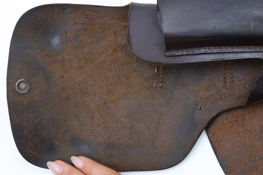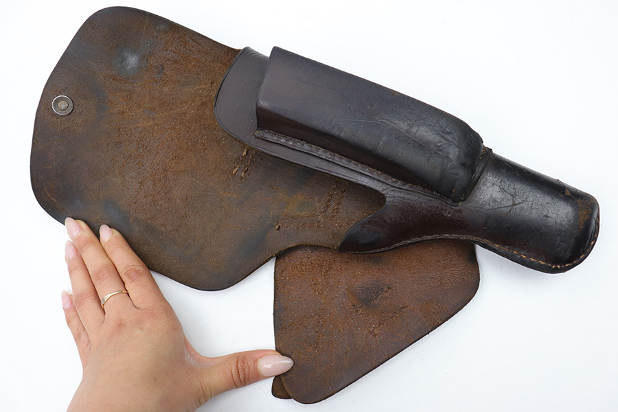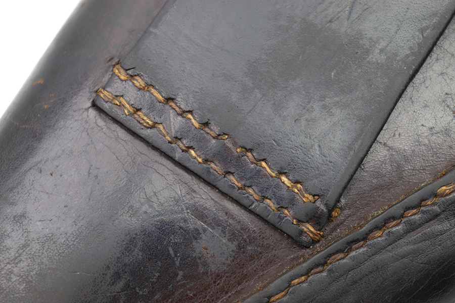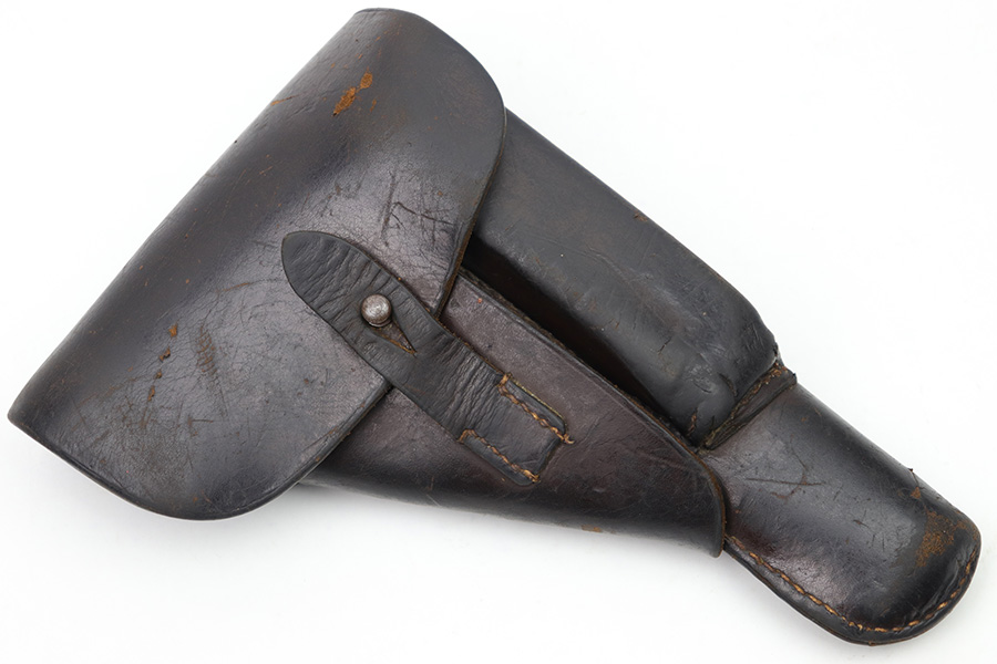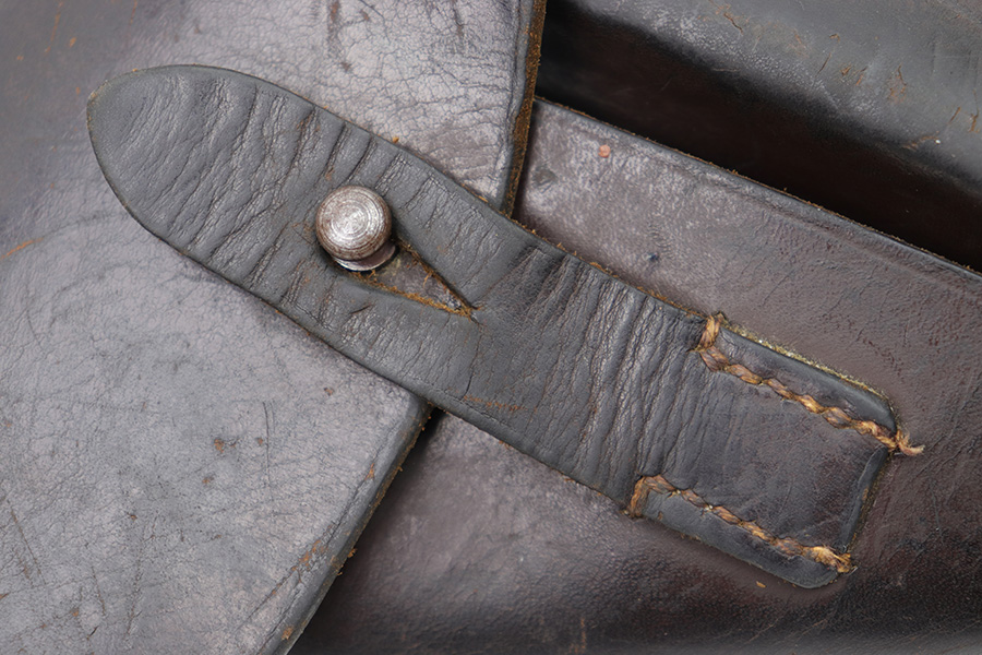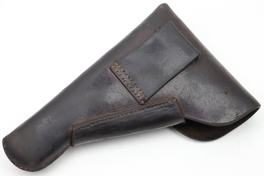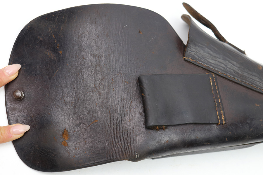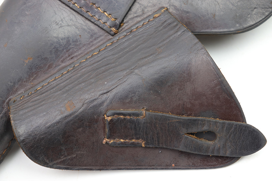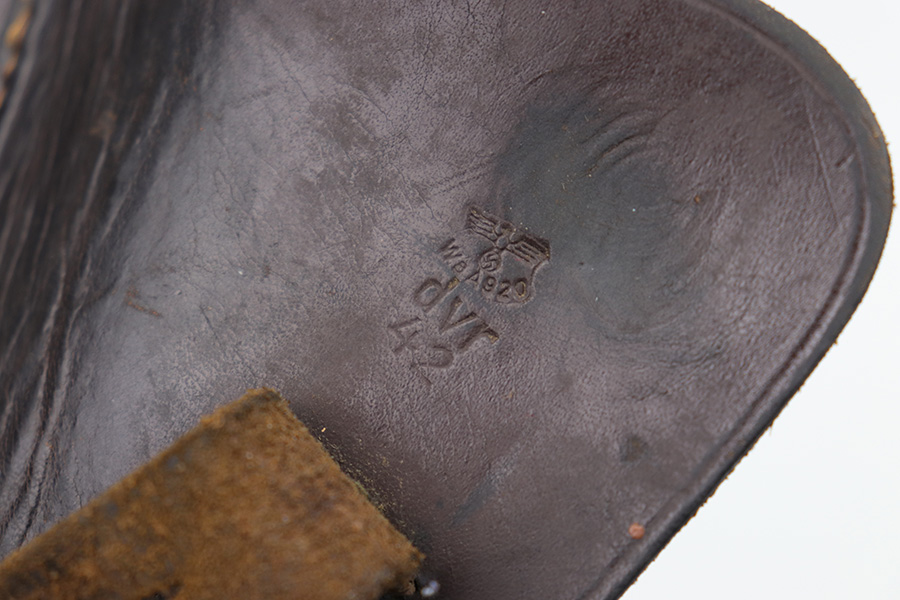 1/26/23 – This is an original 1942 dated Hi Power holster from WW2. The holster is maker stamped, dated, and waffen military proofed on the side flap under the closure strap. The markings are crisp and easily visible. The holster leather has normal surface wear and typical pliability. The exterior has a few light scuffs on the top leather and toe. There’s surface wrinkling around the top leather as well. The stitching is all original and intact except for a few loose stitches on the back belt loop. The belt loop is still secure however.