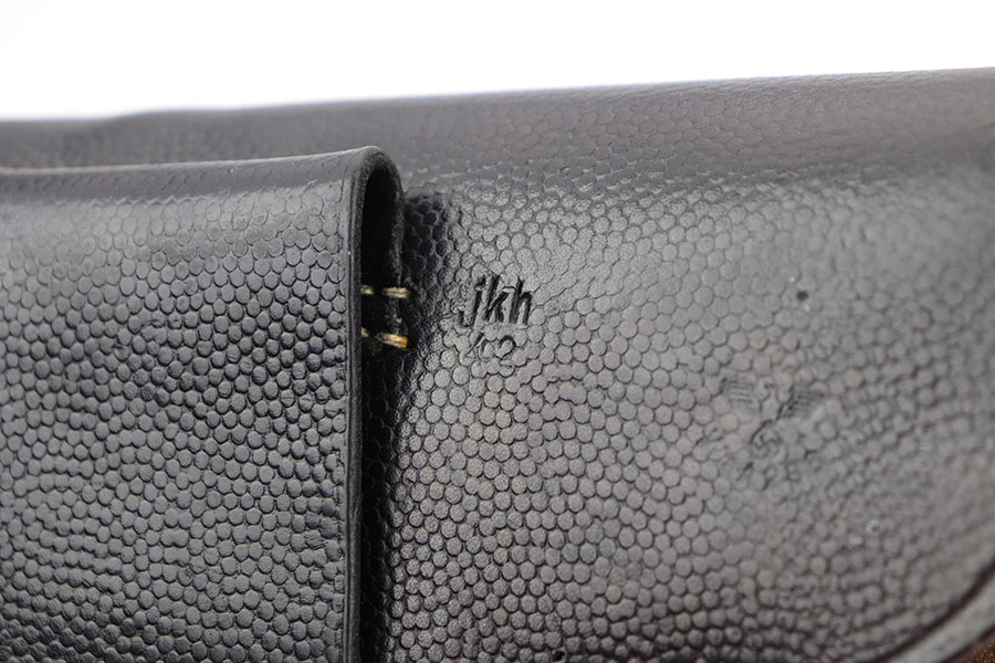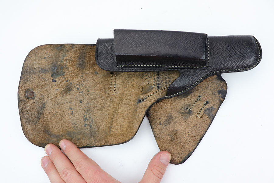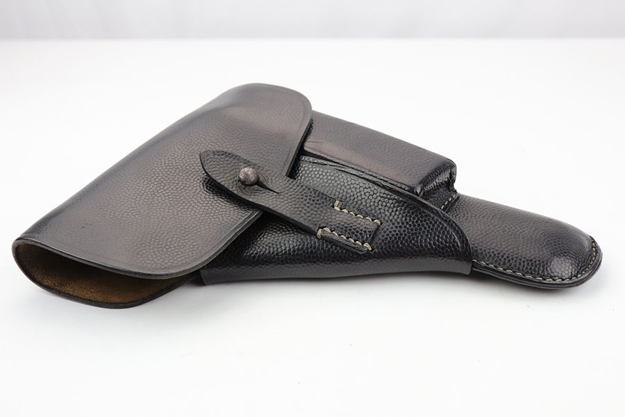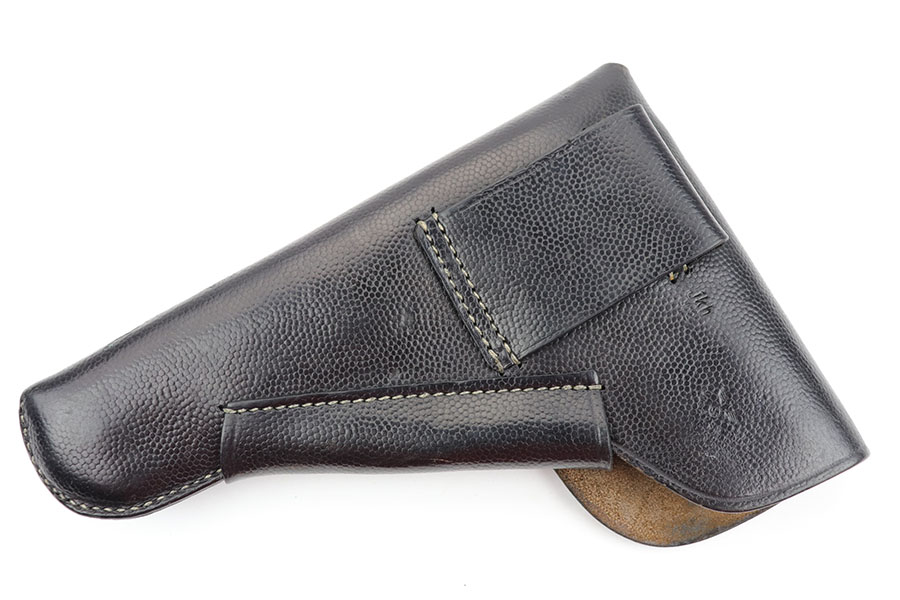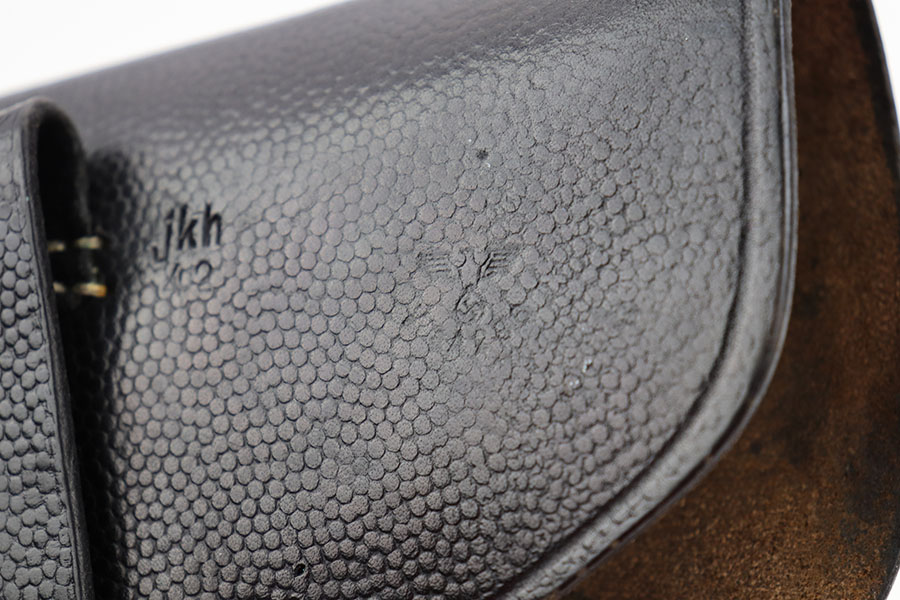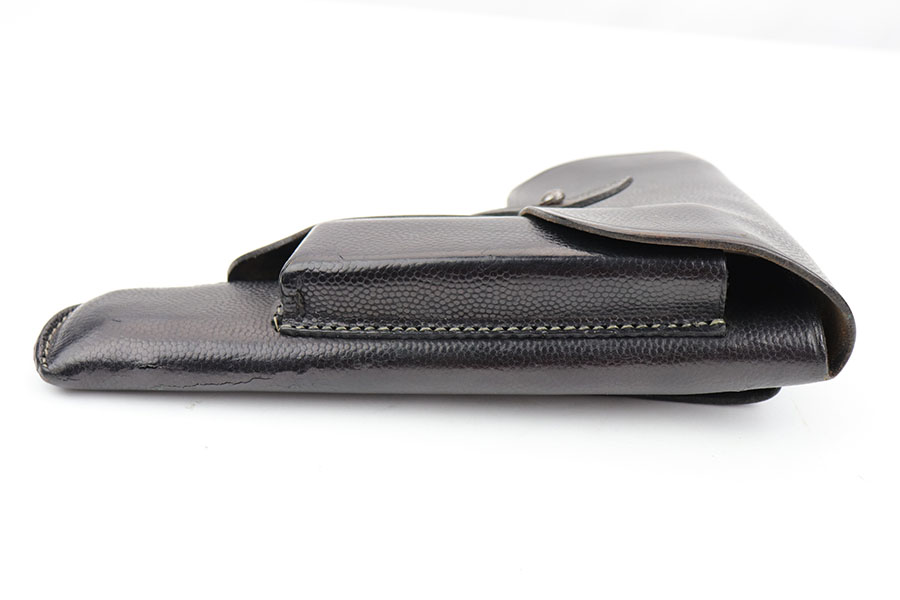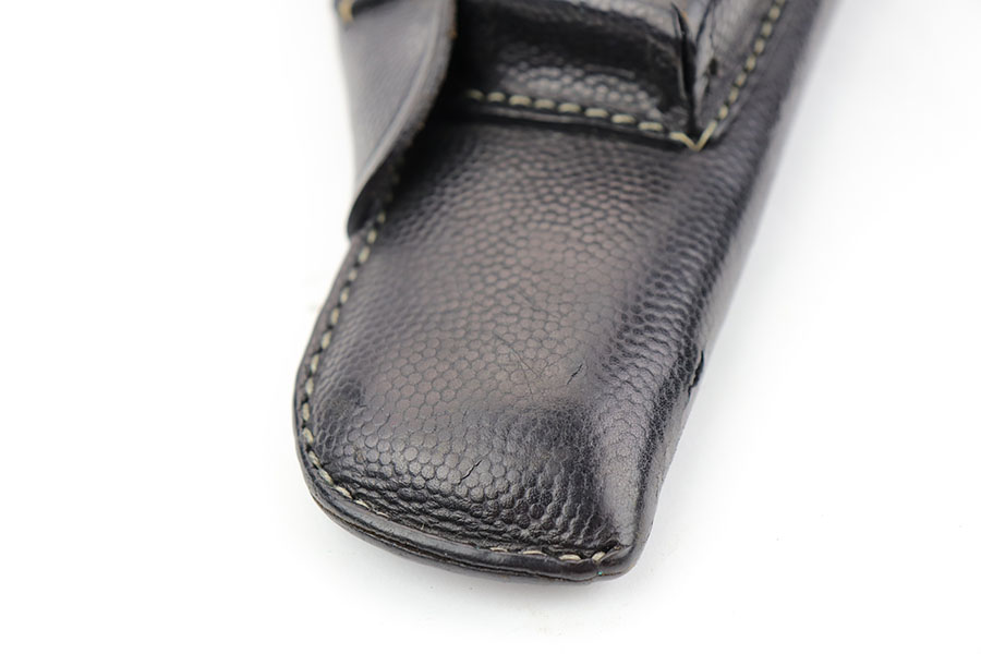 1/7/20 – This is an original 1942 dated Hi Power holster made for nazi Germany. The back of the holster is maker code stamped “jkh” and dated “42” with a waffen military proof eagle stamp. The black pebble grain style leather is in great overall condition with no major issues. Normal pliability and only shows signs of light use. Excellent all original stitching as well.