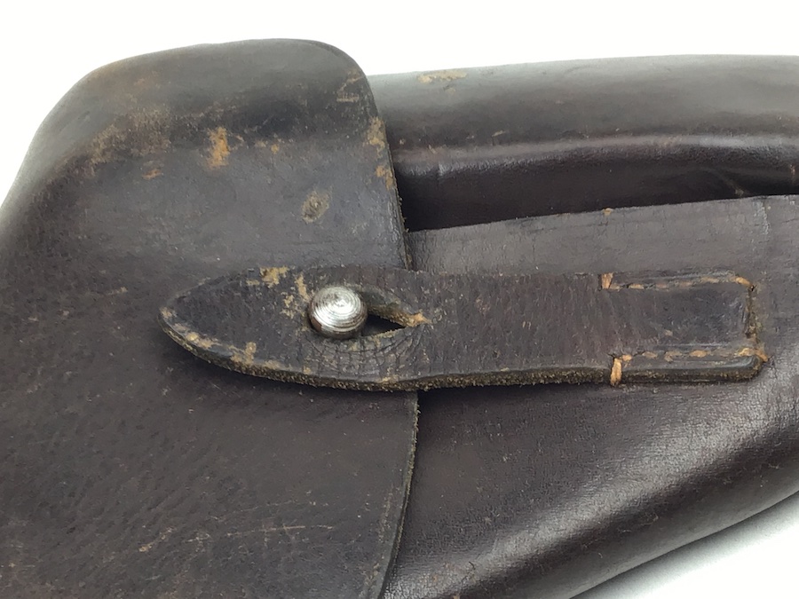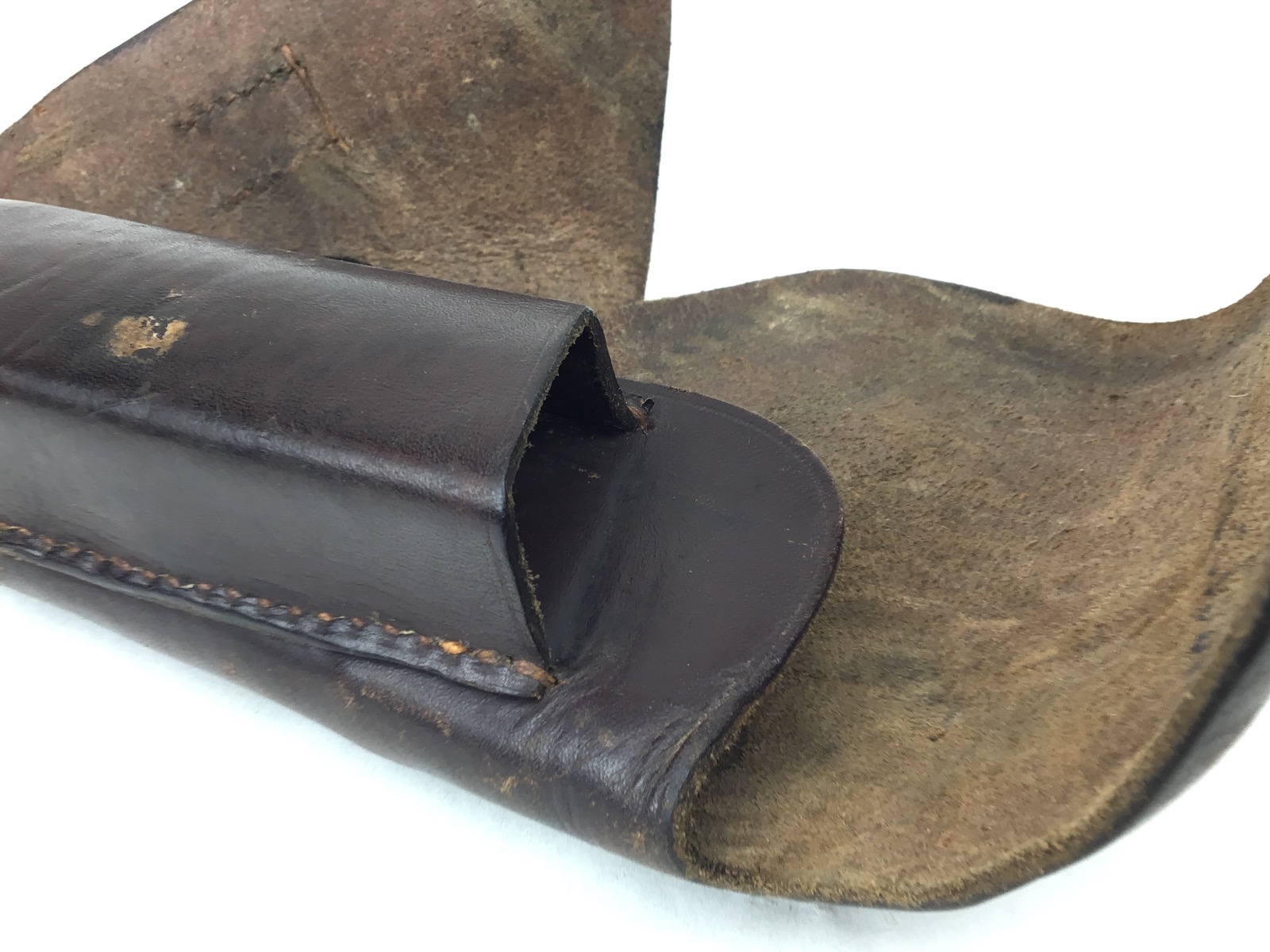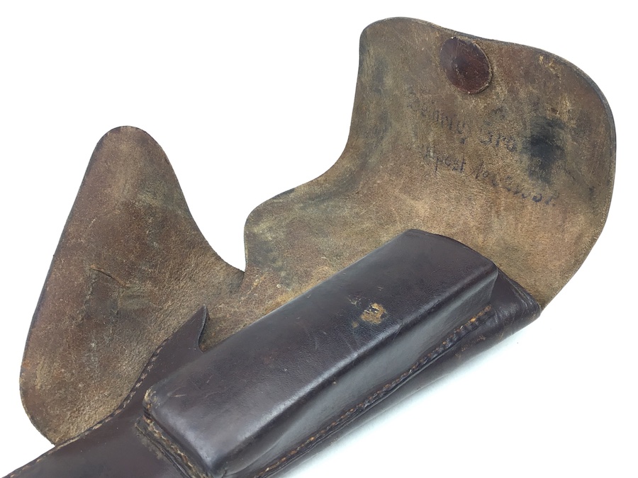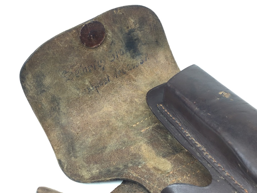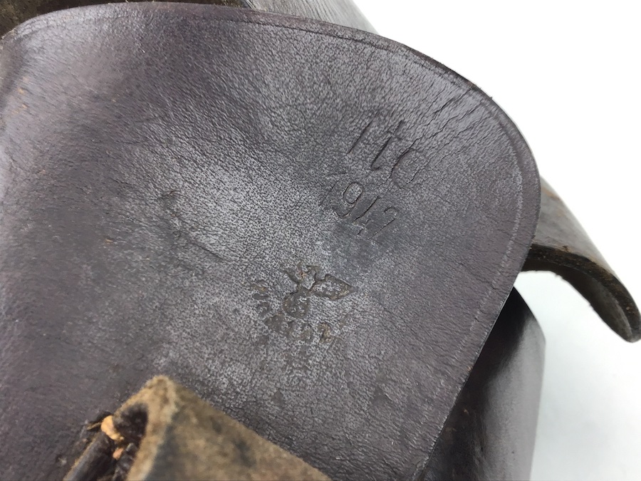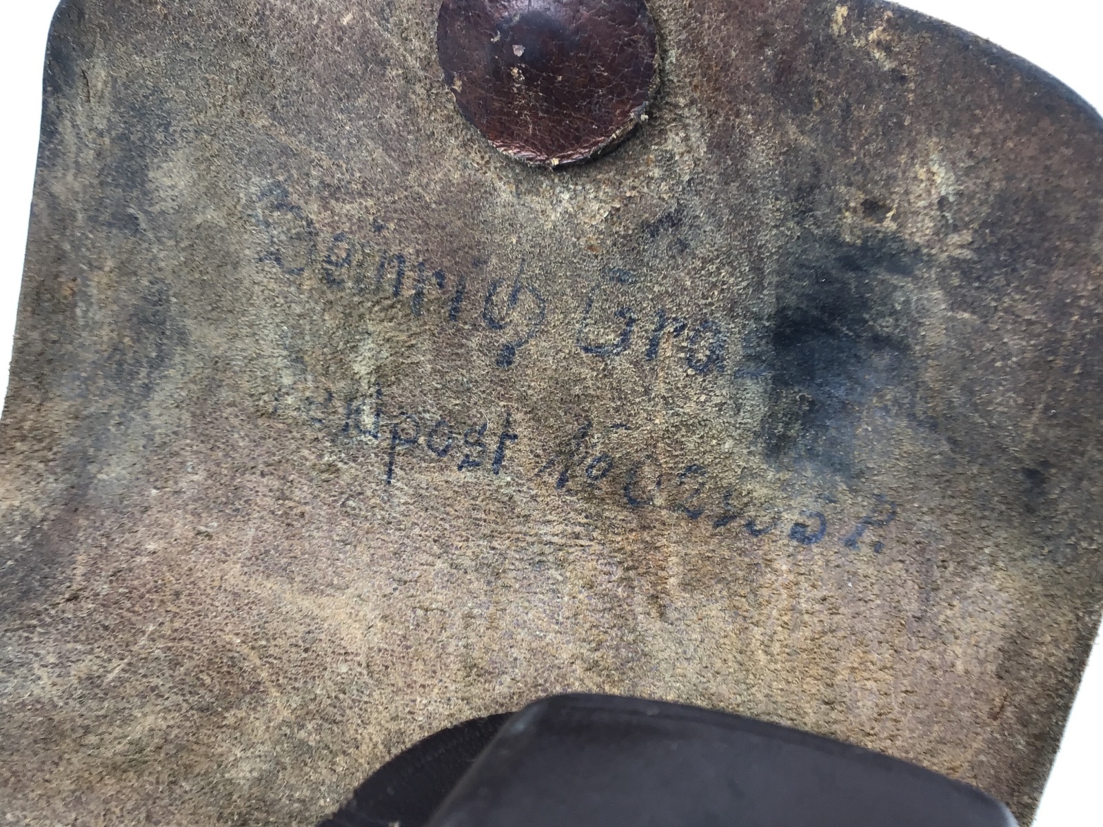 5/21/20 – This is a very good, all original WW2 Browning High Power holster. Under the closure strap is a waffen eagle WaA182 military proof stamp. Above that waffen stamp is a “itc” manufacturer code and 1942 date stamp. The holster leather is very firm and pliable. There are a few minor surface scuffs, but this is very minor, and normal wear. The interior leather has been personalized with a name and possible unit number. The stitching is all original and excellent as well.