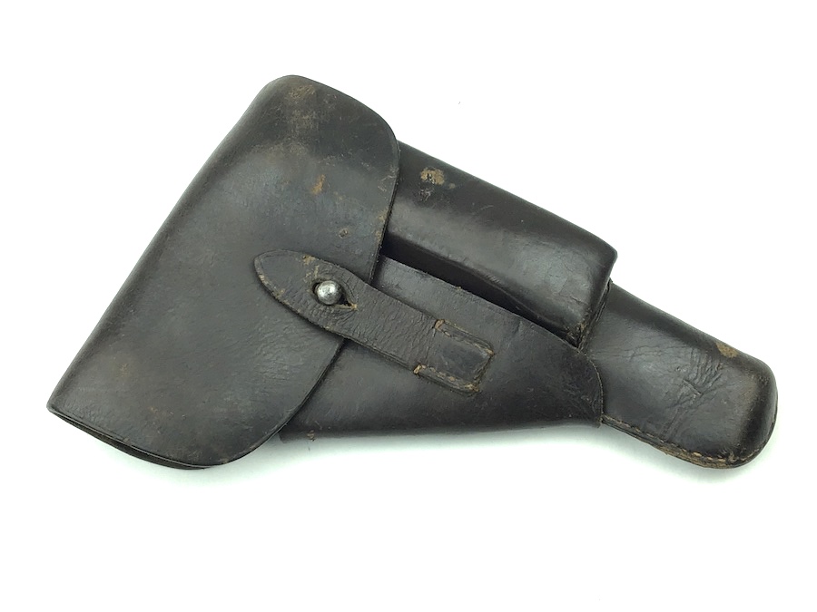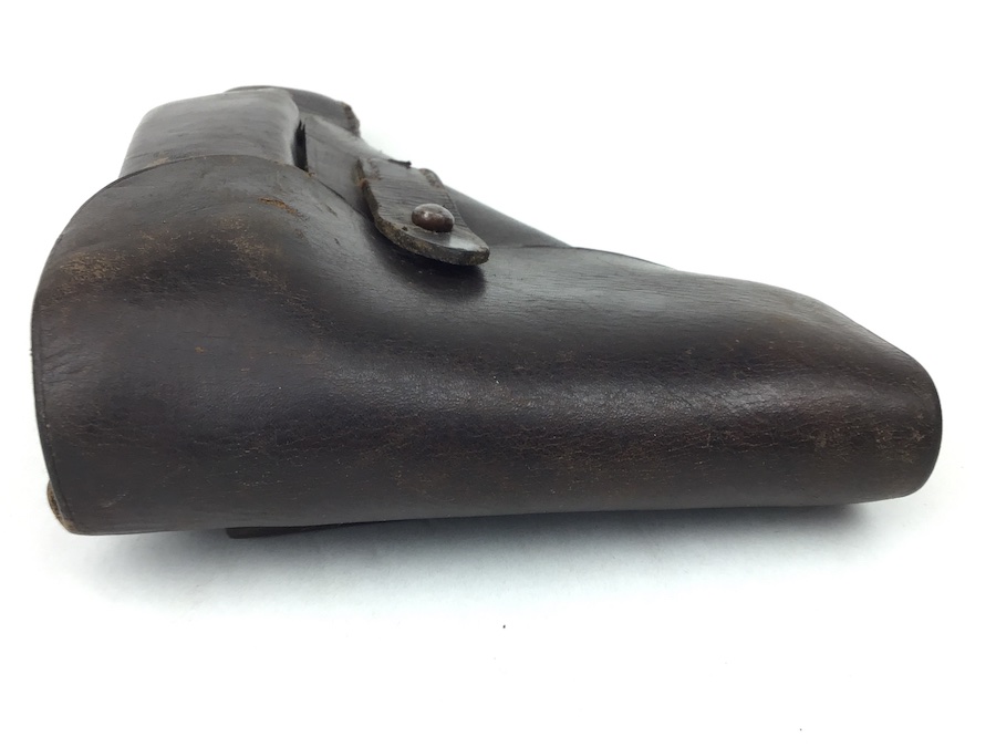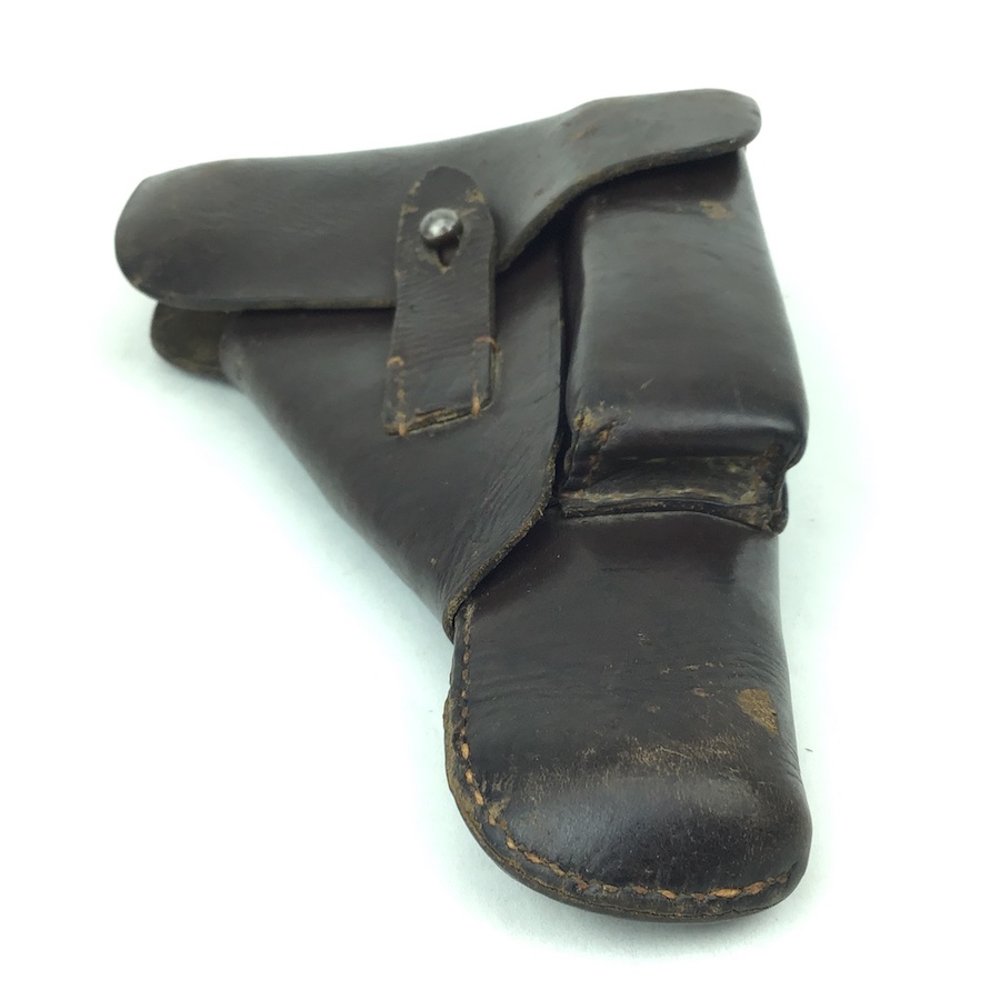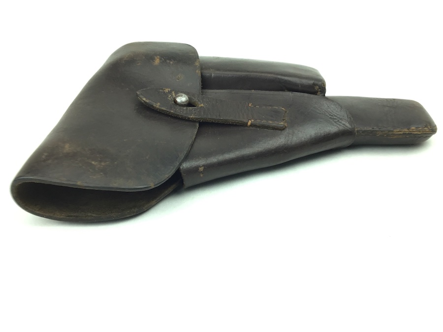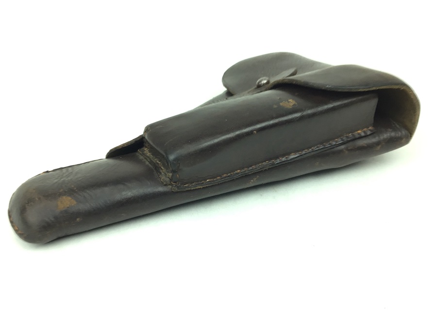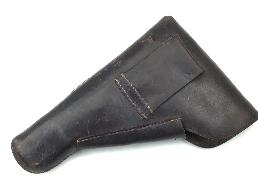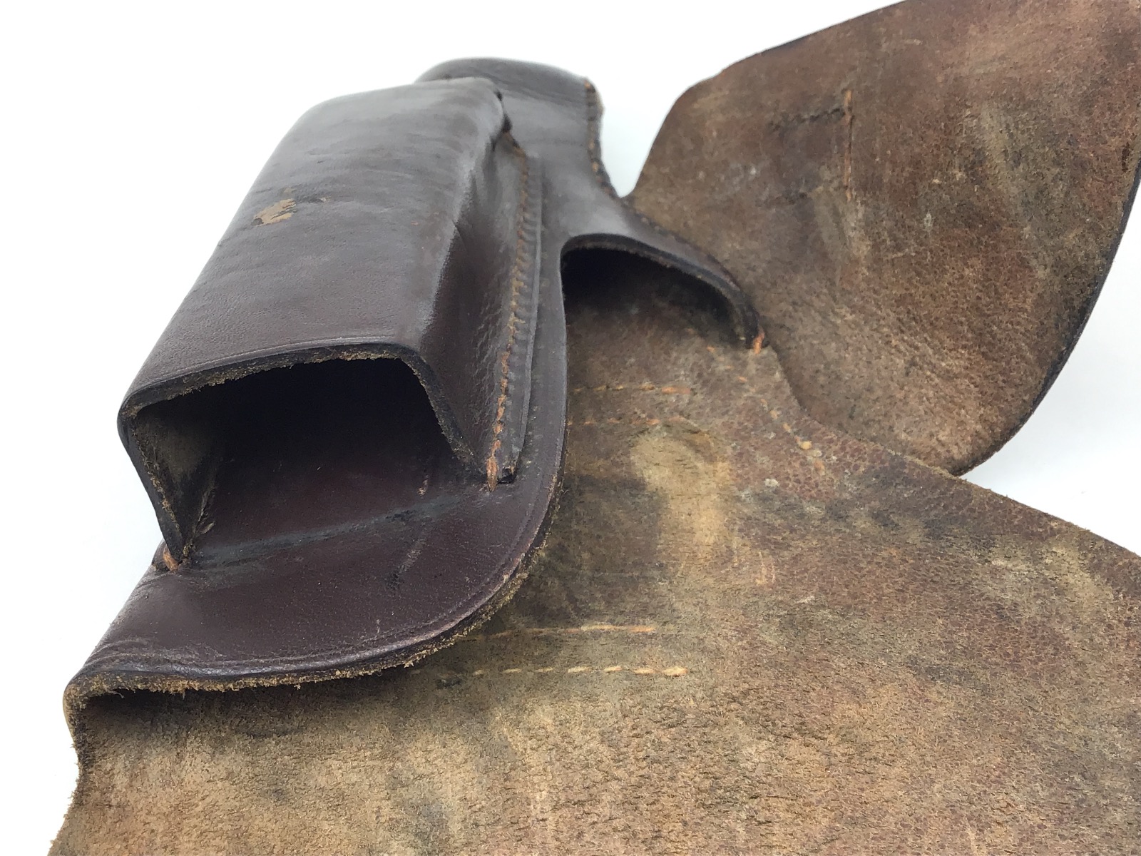 5/21/20 – This is a very good, all original WW2 Browning High Power holster. Under the closure strap is a waffen eagle WaA182 military proof stamp. Above that waffen stamp is a “itc” manufacturer code and 1942 date stamp. The holster leather is very firm and pliable. There are a few minor surface scuffs, but this is very minor, and normal wear. The interior leather has been personalized with a name and possible unit number. The stitching is all original and excellent as well.