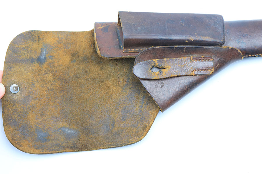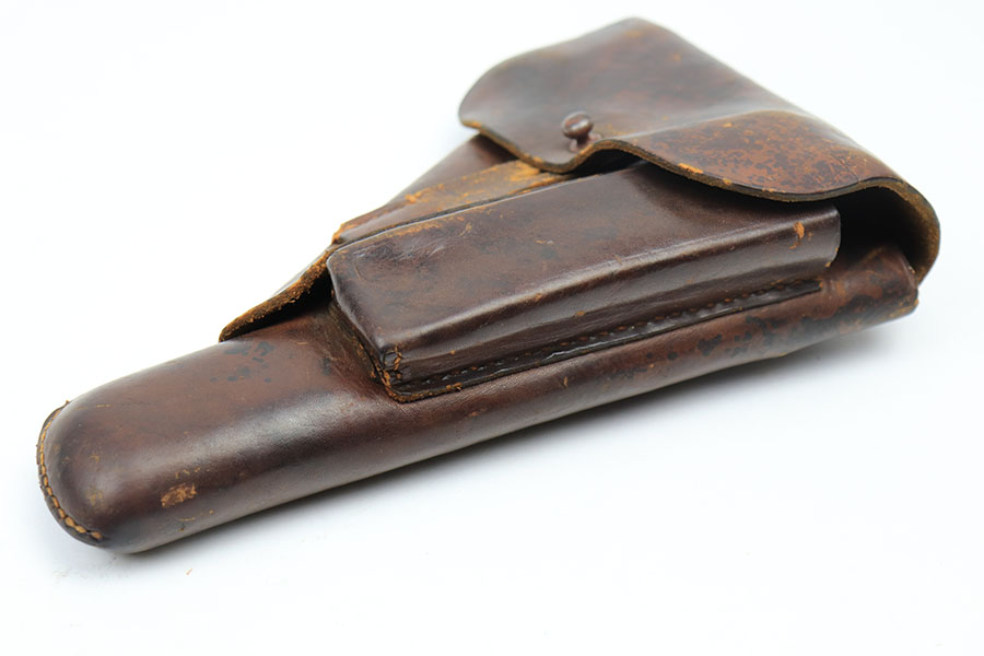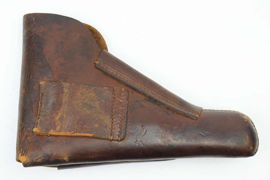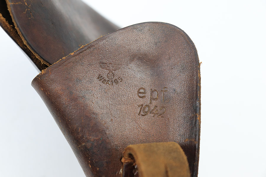 3/11/21 – This is an original 1942 dated high power holster. Maker stamped, dated, and waffen proof stamped under the closure strap. The leather is in good overall condition with some surface wear throughout. The leather is pliable and shows honest use wear. The stitching is all original and in tact.