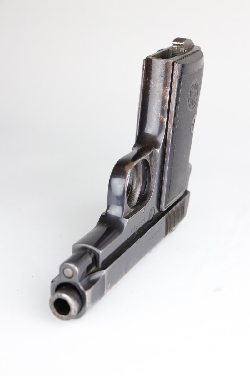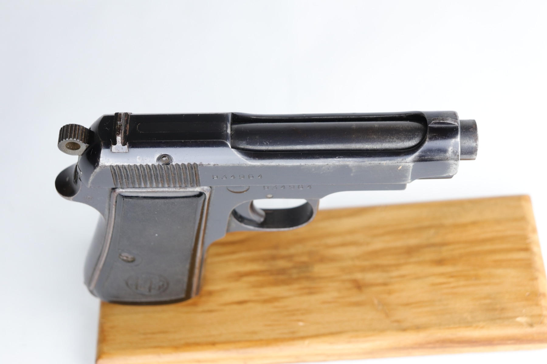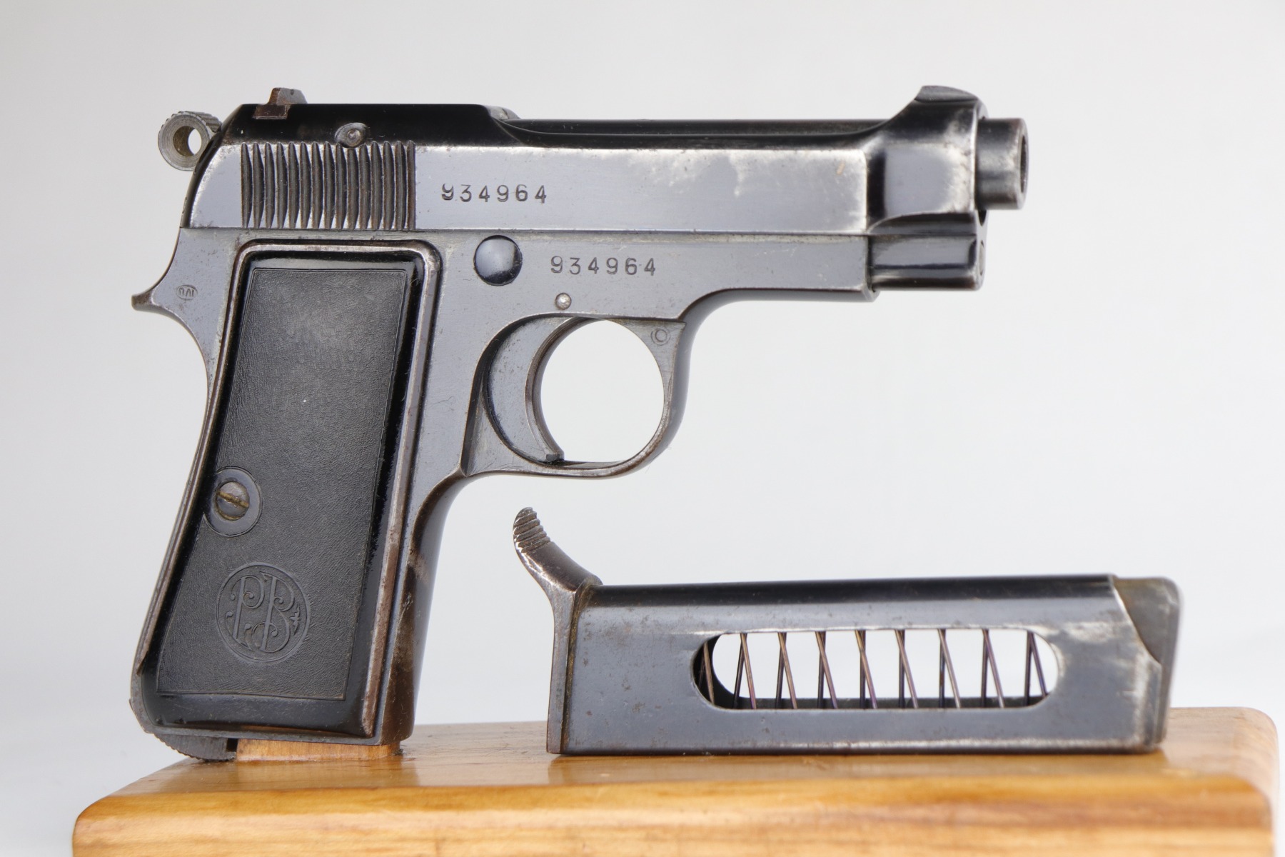 04/28/20 – This is an original WW2 Beretta Model 1934, manufactured in 1942. This pistol was issued to the Italian Army. It has the proper “RE” military proof on the left side of the gun, on the tang. All numbered parts are matching. No import marks. Overall, the gun is in very nice condition. It has retained ~85% of its original bluing. Most of the wear is on the high edges of the slide and muzzle. There are also one or two areas of wear on the front strap. There is minor pin-pricking on the straps. There are also a few small areas of discoloration here and there. The gun functions properly. It comes with a proper magazine. The bore is nice – decent rifling, but there is some minor frosting. The grips are excellent – no major chips or scratches.