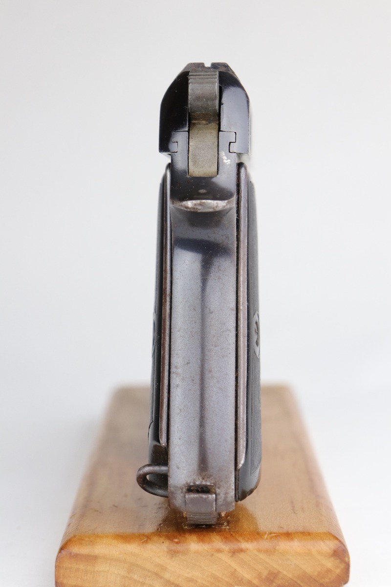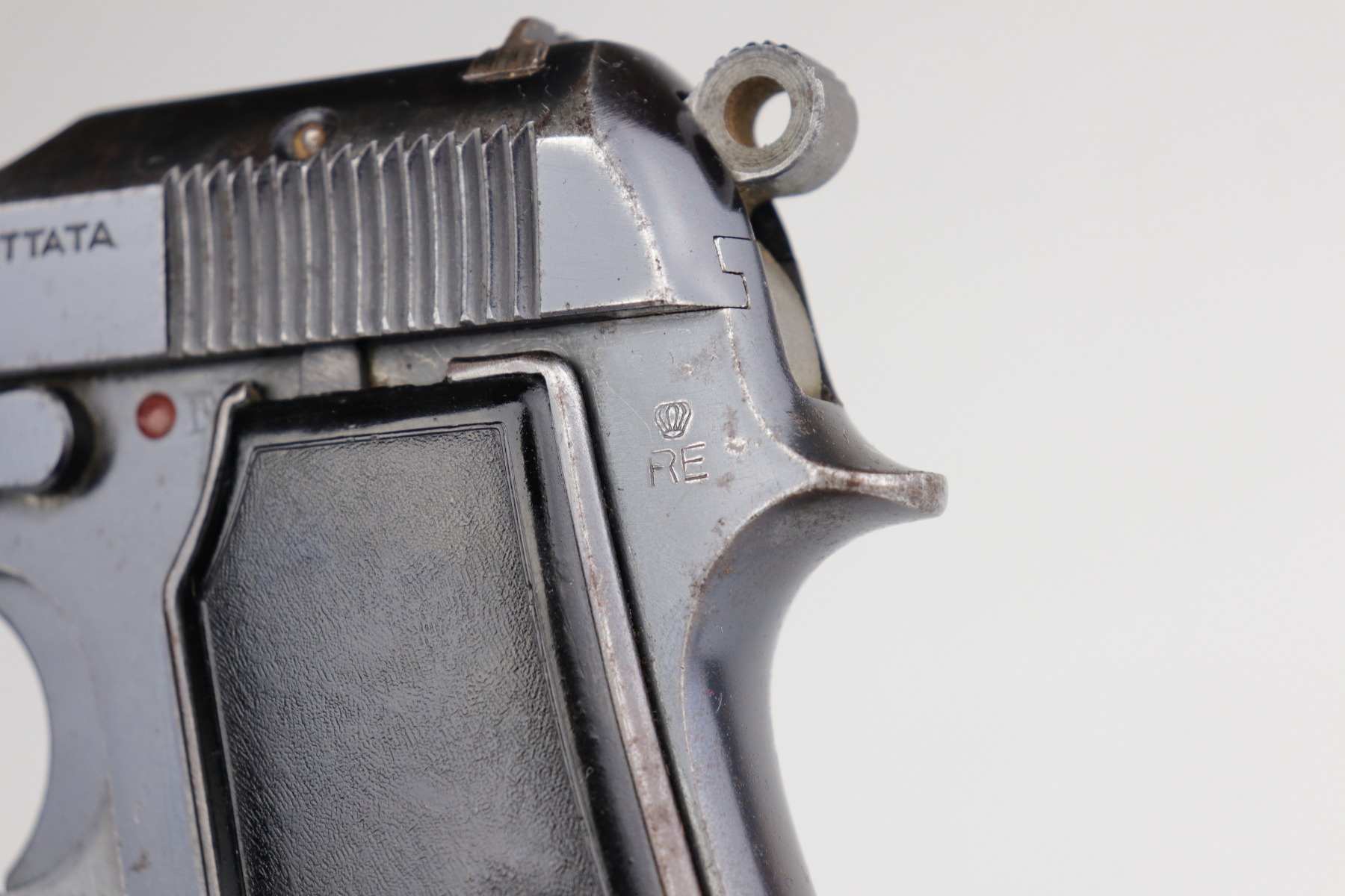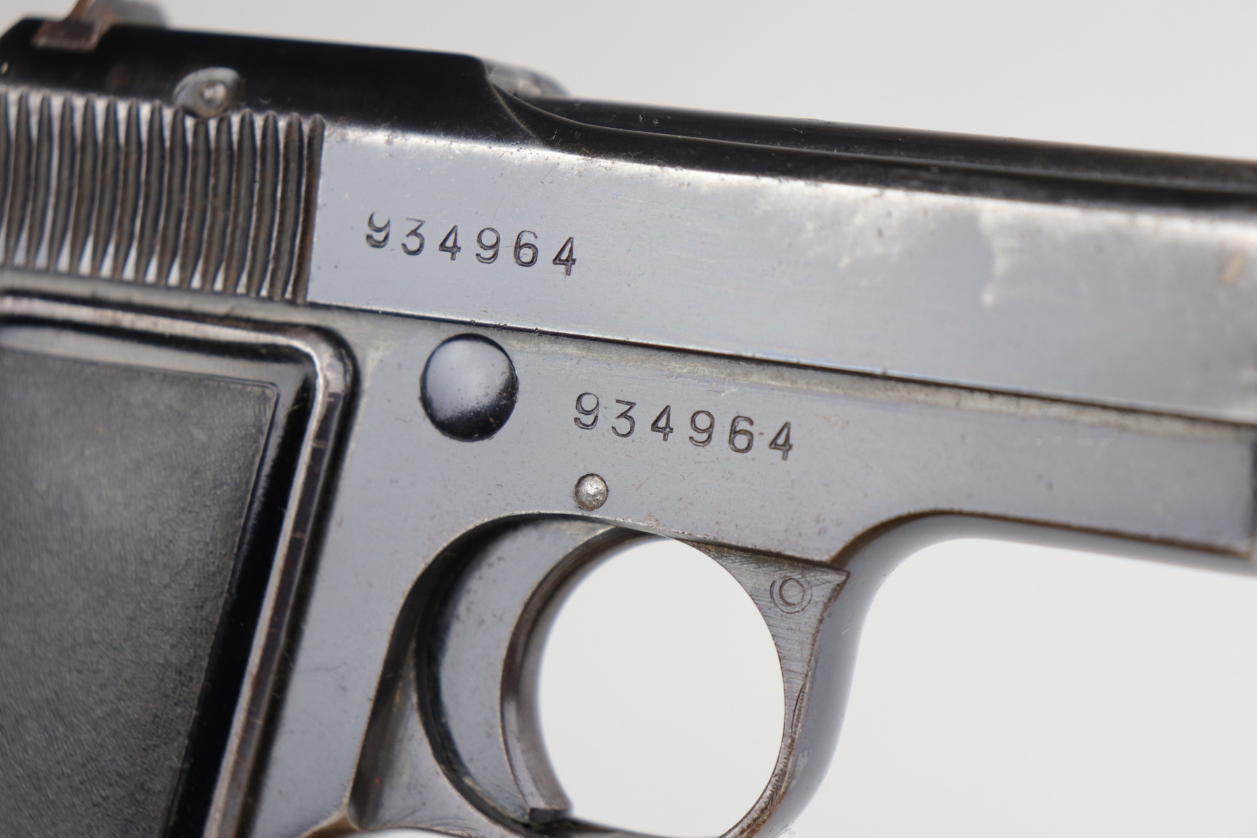 04/28/20 – This is an original WW2 Beretta Model 1934, manufactured in 1942. This pistol was issued to the Italian Army. It has the proper “RE” military proof on the left side of the gun, on the tang. All numbered parts are matching. No import marks. Overall, the gun is in very nice condition. It has retained ~85% of its original bluing. Most of the wear is on the high edges of the slide and muzzle. There are also one or two areas of wear on the front strap. There is minor pin-pricking on the straps. There are also a few small areas of discoloration here and there. The gun functions properly. It comes with a proper magazine. The bore is nice – decent rifling, but there is some minor frosting. The grips are excellent – no major chips or scratches.