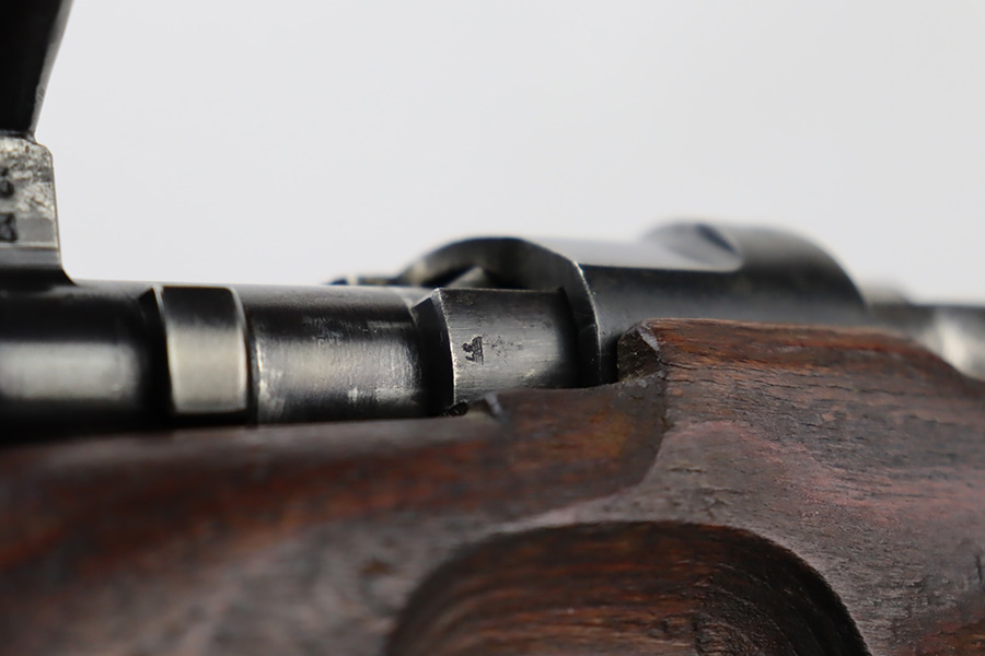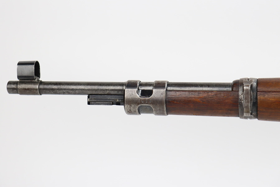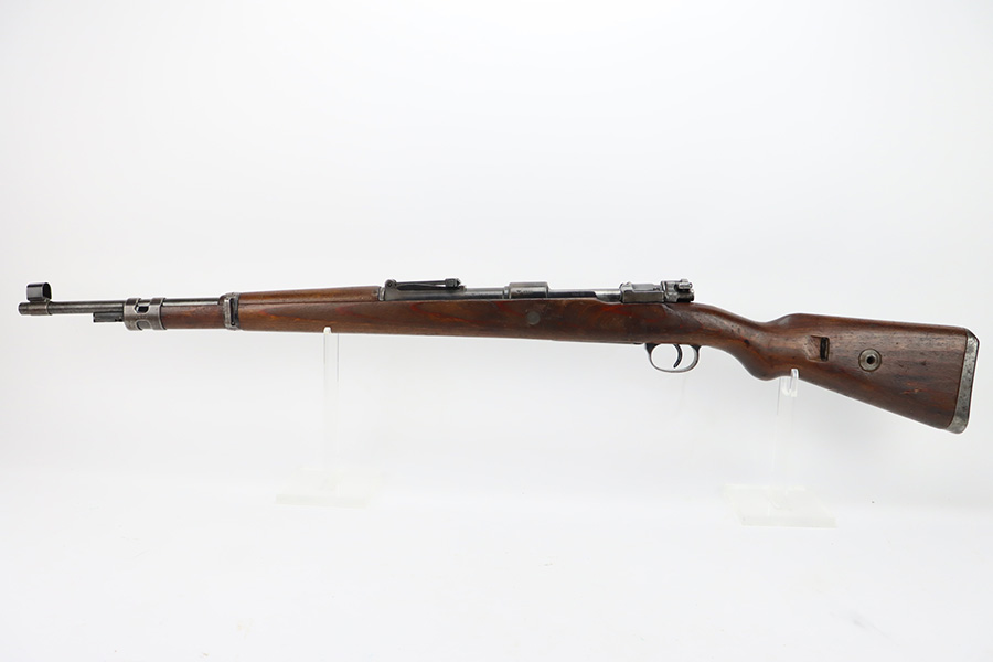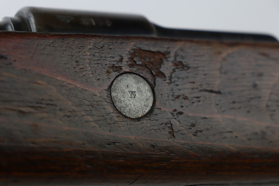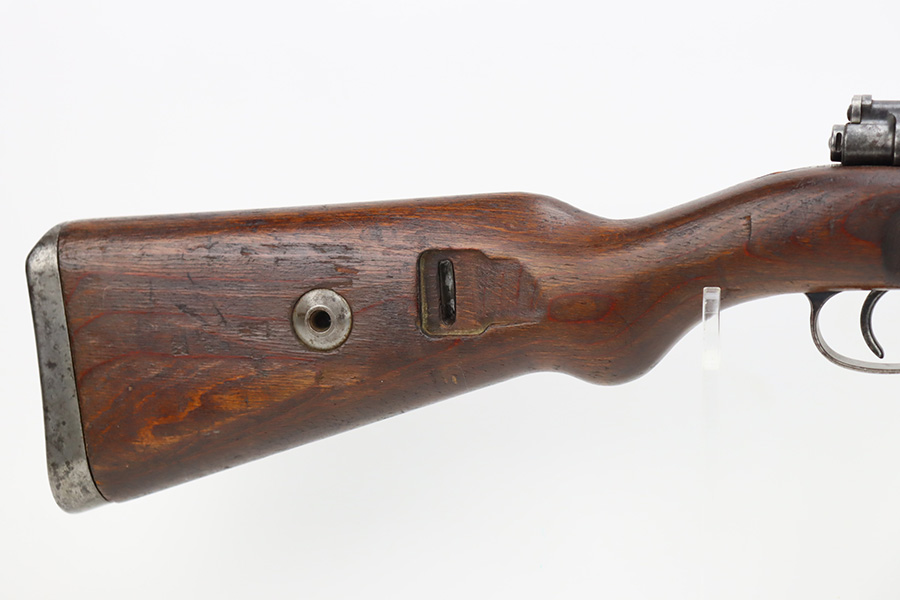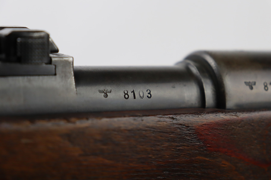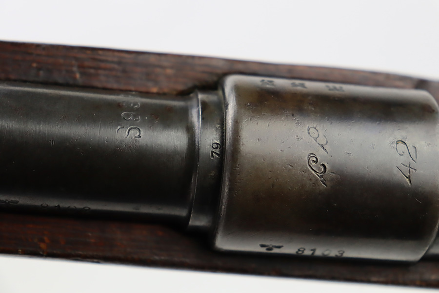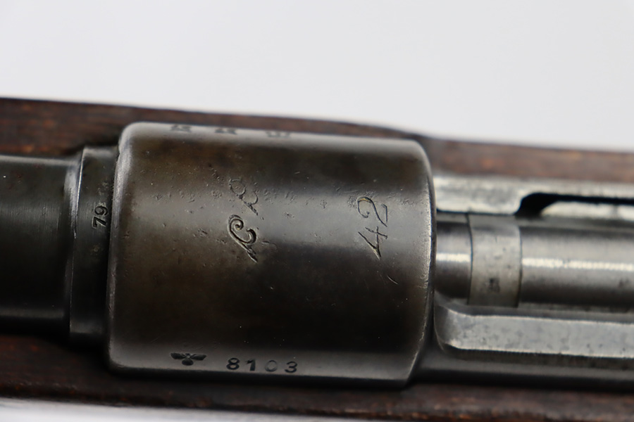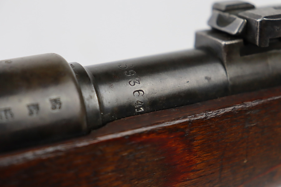 10/5/23 – This is a “ce 42” code JP Sauer K98 issued to the Nazi military in 1942. It is mostly matching, but a couple of the small parts of the bolt are mismatched. Stock is matching and has the proper proofs. The metal parts have lost most of their finish with spotty oxidation throughout and some discoloration on the receiver. No major damage to the wood, but it shows the typical signs of wear. The bore has good rifling, but there are areas of pitting and oxidation here and there.