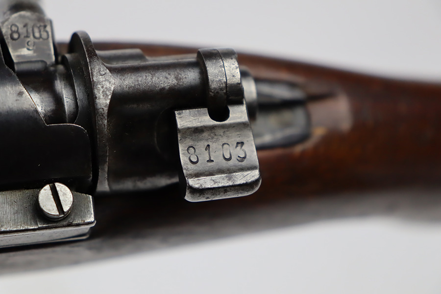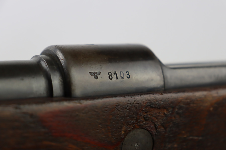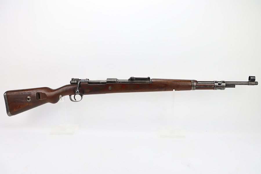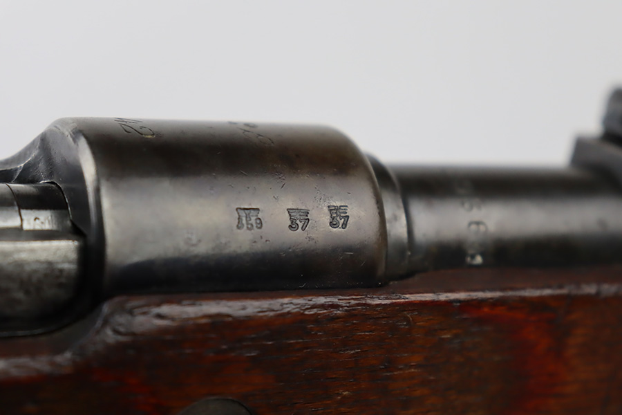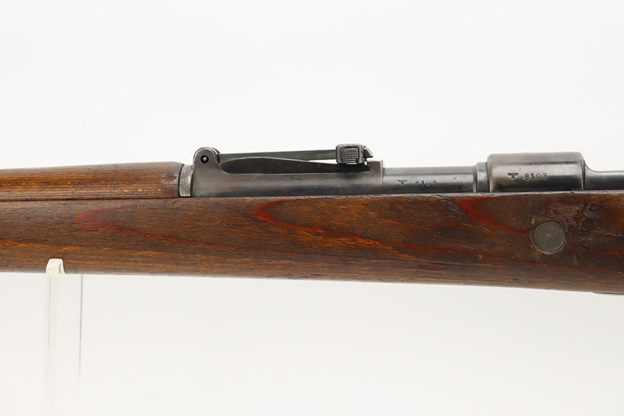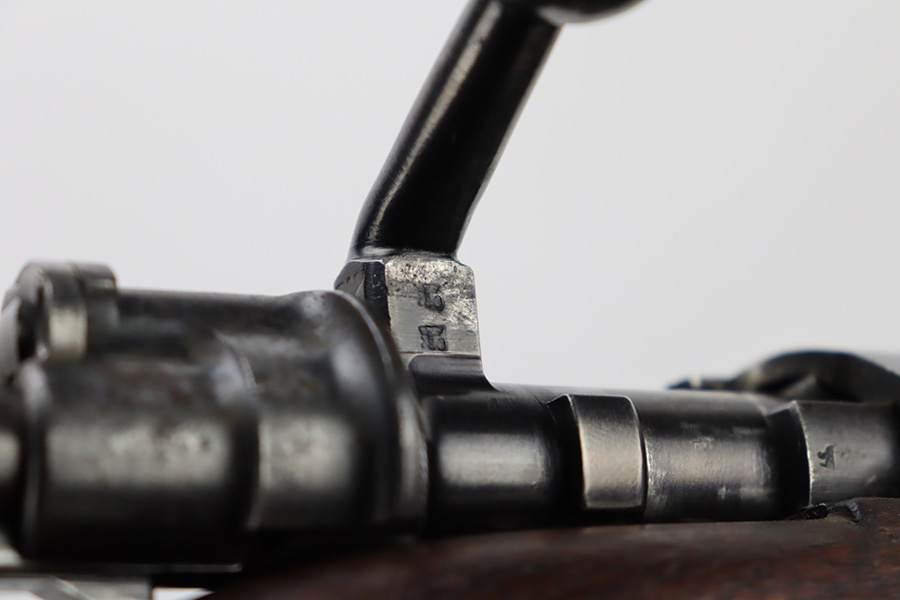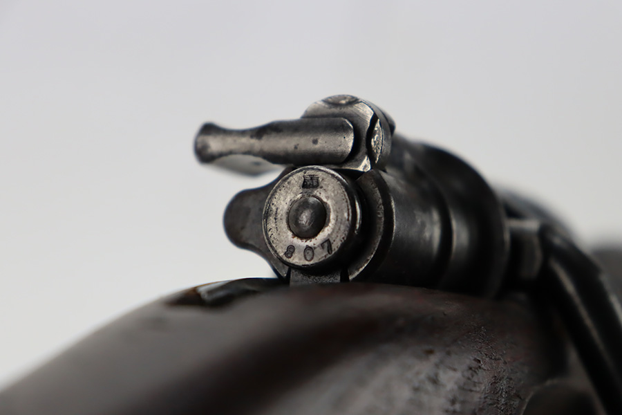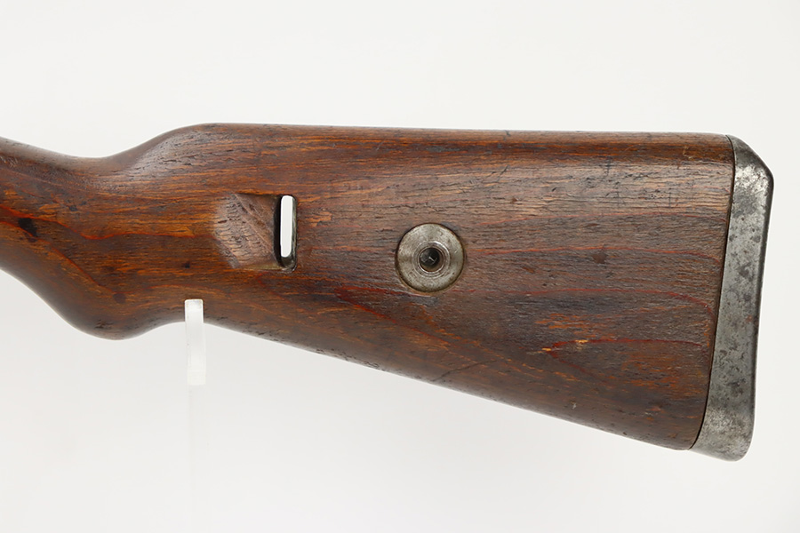 10/5/23 – This is a “ce 42” code JP Sauer K98 issued to the Nazi military in 1942. It is mostly matching, but a couple of the small parts of the bolt are mismatched. Stock is matching and has the proper proofs. The metal parts have lost most of their finish with spotty oxidation throughout and some discoloration on the receiver. No major damage to the wood, but it shows the typical signs of wear. The bore has good rifling, but there are areas of pitting and oxidation here and there.