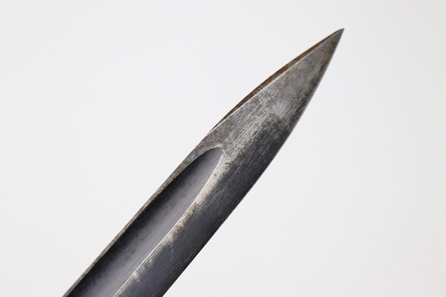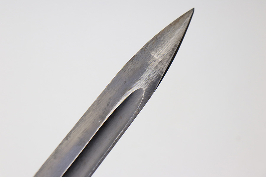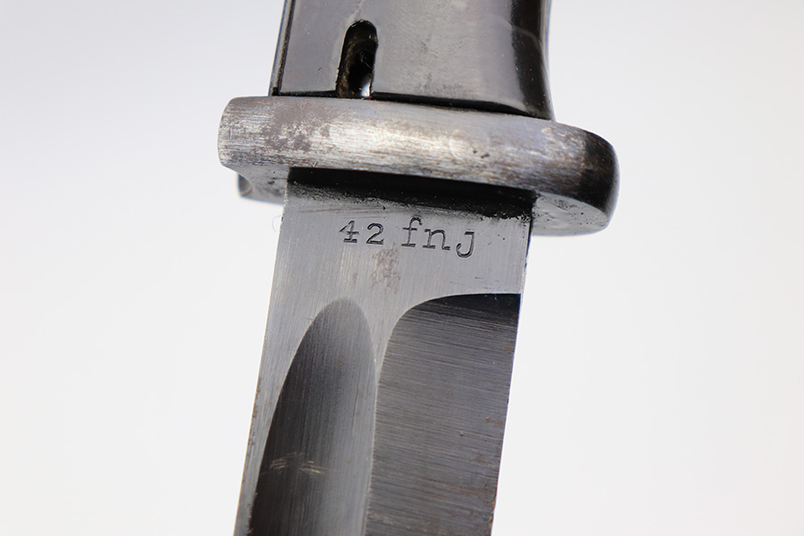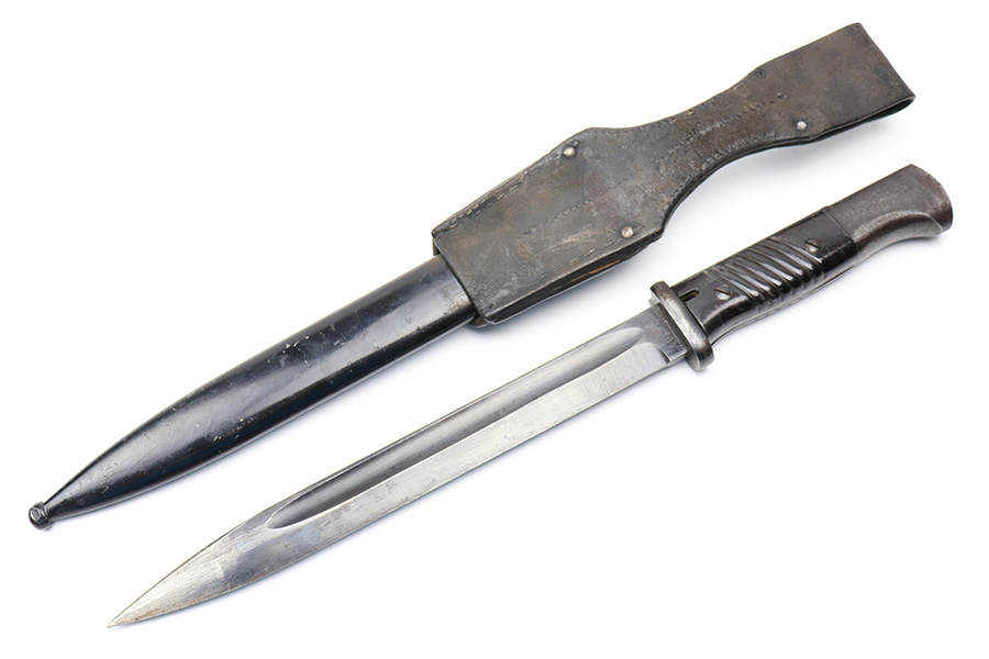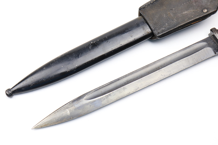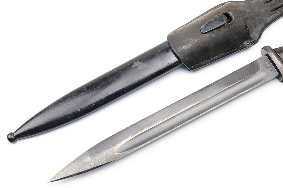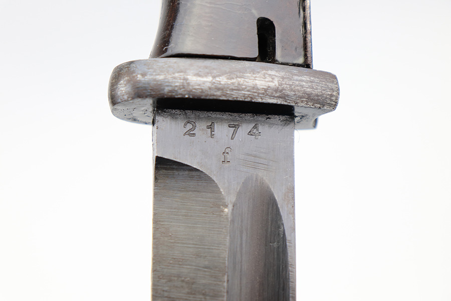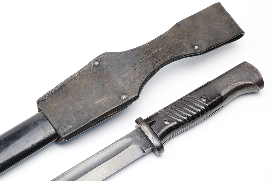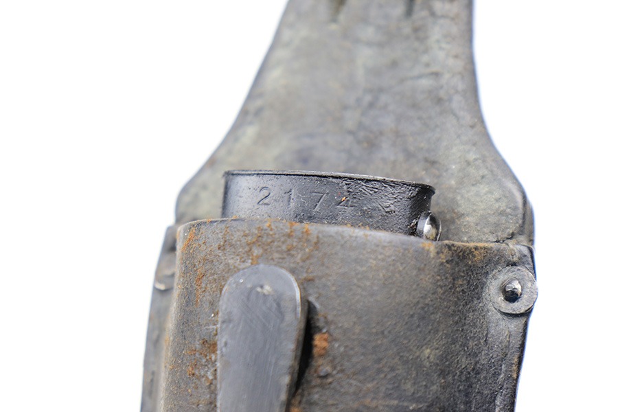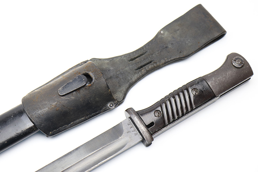 3/28/22 – This is an original 1942 dated K98 bayonet with an original matching numbered scabbard and a leather frog. The bayonet blade is dated and maker stamped on one side of the ricasso, and serial numbered on the other. The blade has some mild surface discoloration throughout but no signs of sharpening and excellent bluing throughout. The hilt has some surface patina and finish loss as well, but no rust or pitting. The scabbard has a black painted finish, but is matching numbered to the blade. The frog has no markings or stamps.