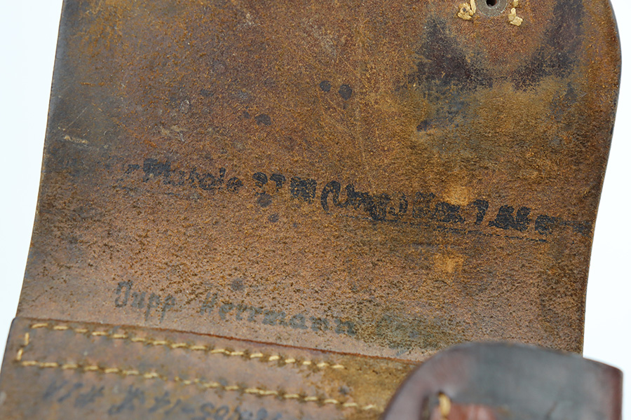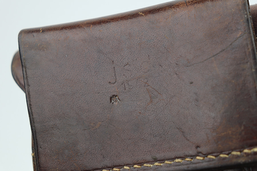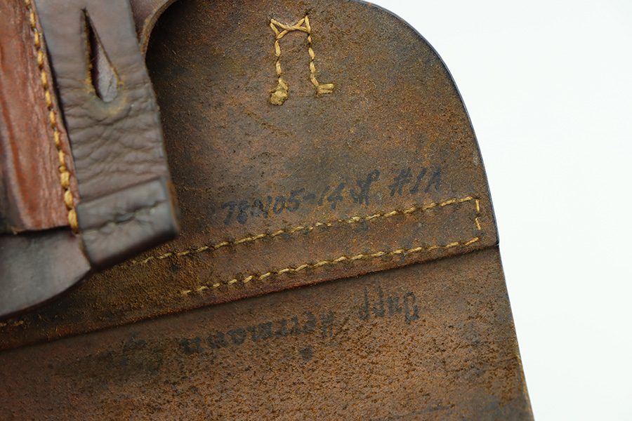 11/10/23 – This is a very nice holster for a Femaru Model 37. The back has a “jsd” maker mark, 1942 date, and an “Eagle L2” Luftwaffe acceptance proof. There is a nice ink stamp on the inside. Also, handwritten on the inside is a name “Jupp Herrmann” and a number. Overall, the leather is very nice with just some light scuffs here and there and some minor creasing in the leather around the inflection points.
