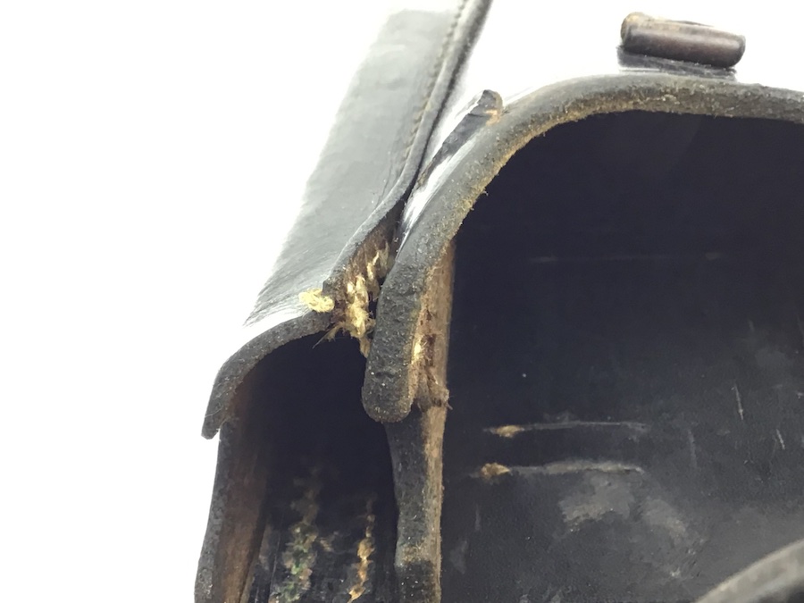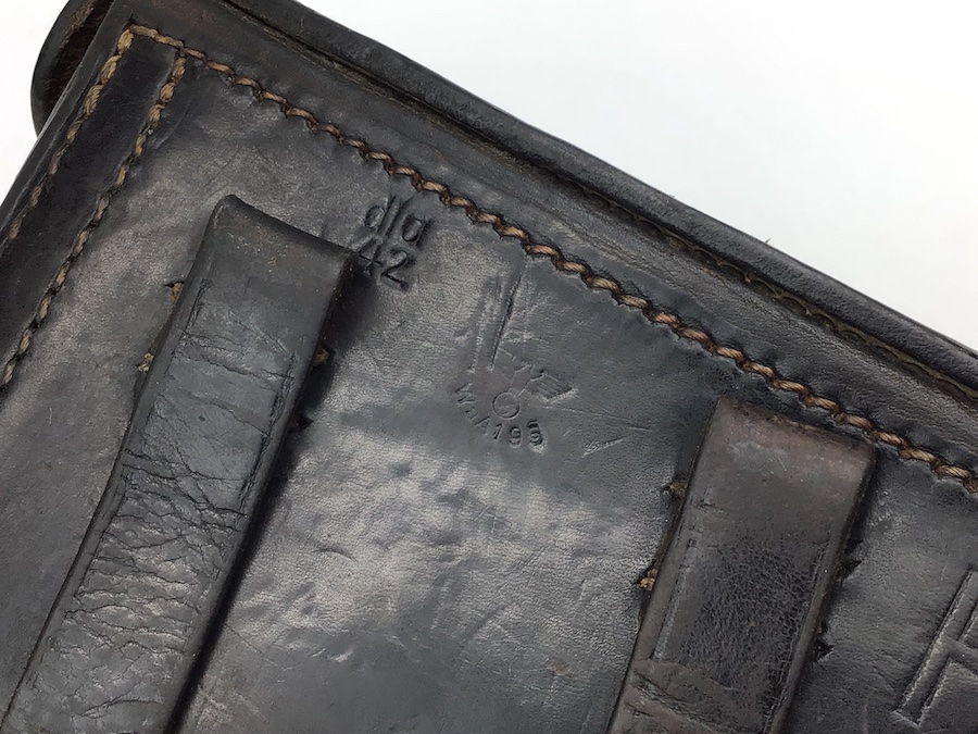 11/23/20 – This is an original 1942 dated Luger holster from WW2. The back of the holster is dated, maker code stamped “dla” and waffen WaA195 proof stamped. The holster has black leather completely in tact. The stitching is all original and in tact, except for a small portion at the top of the magazine pouch. The initials “FS” are etched into the front of the closure flap, but still a nice piece.