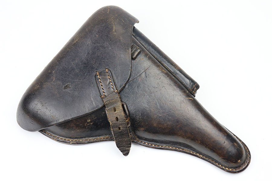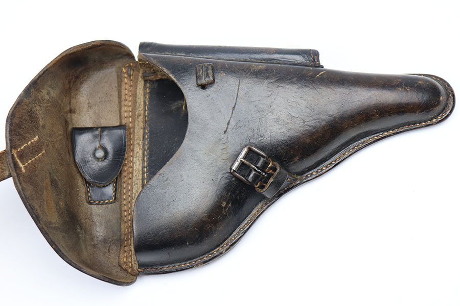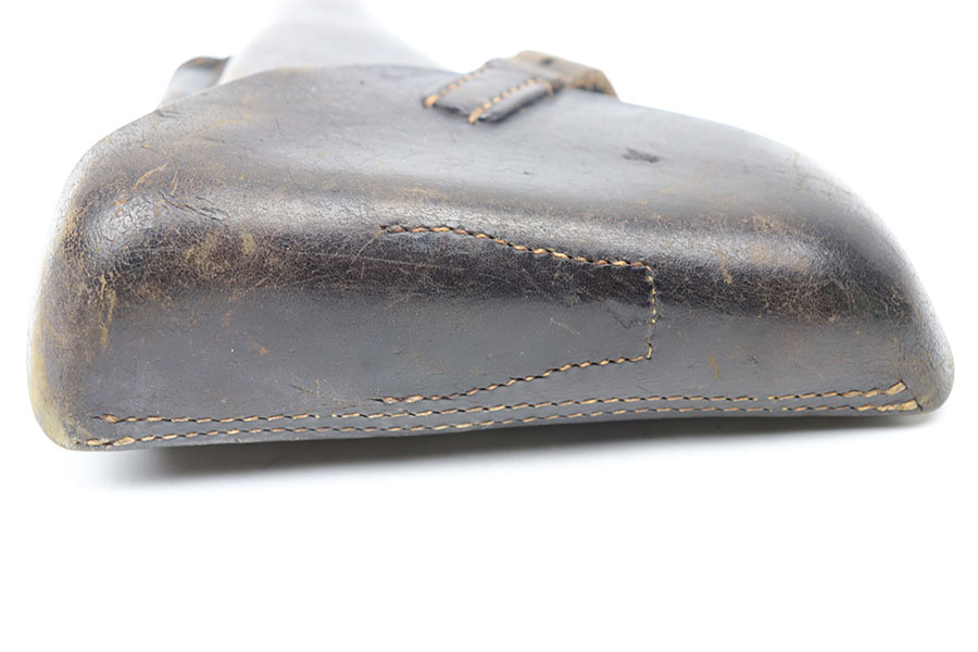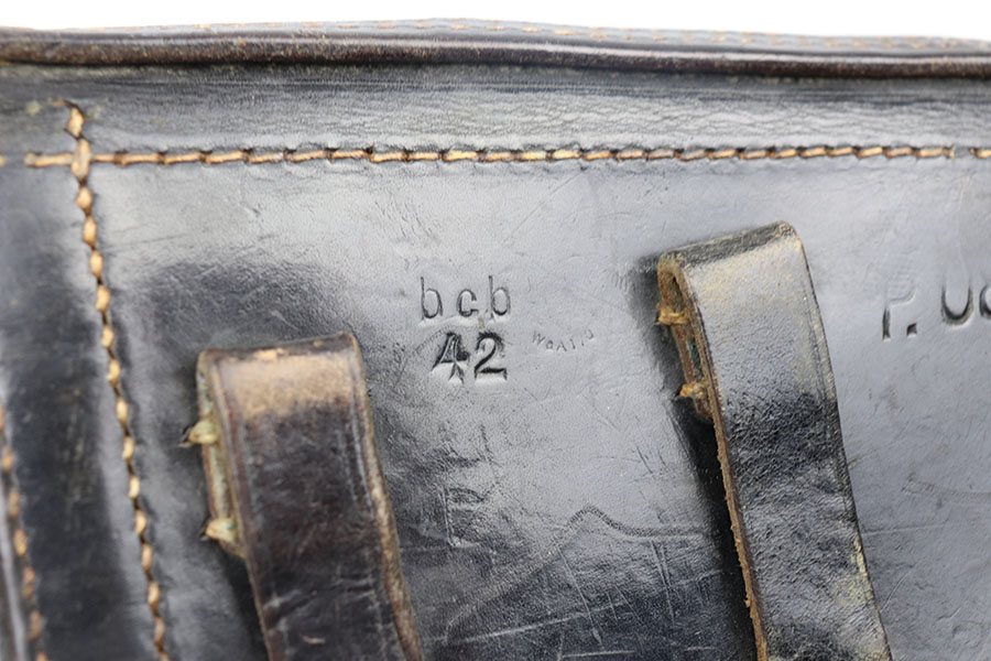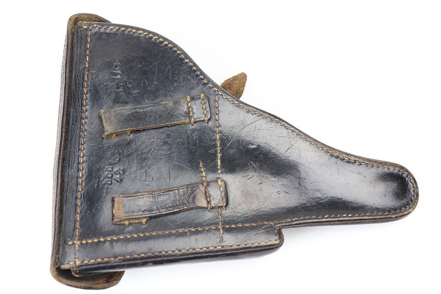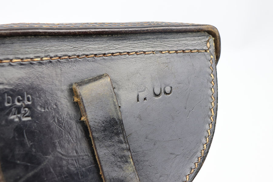 4/5/21 – This is an original 1942 dated Luger holster from WW2. The holster has nice black leather that’s completely in tact. There’s some light surface wear in a few areas and normal signs of aging. The front lid has a small scuff that goes into the leather but not all the way through. The stitching is in tact and original. The back leather is dated, maker stamped, waffen proofed, and P.08 stamped.