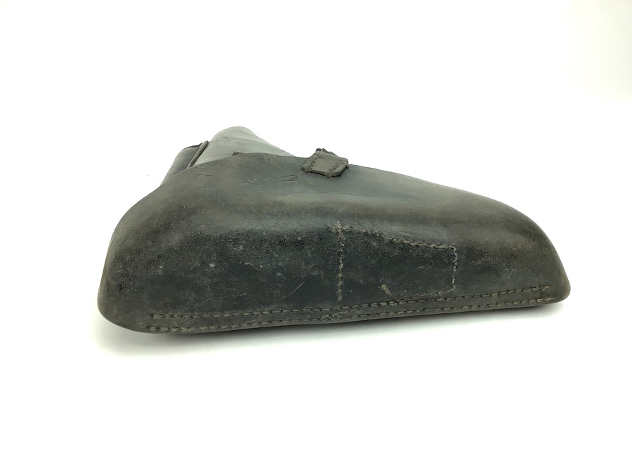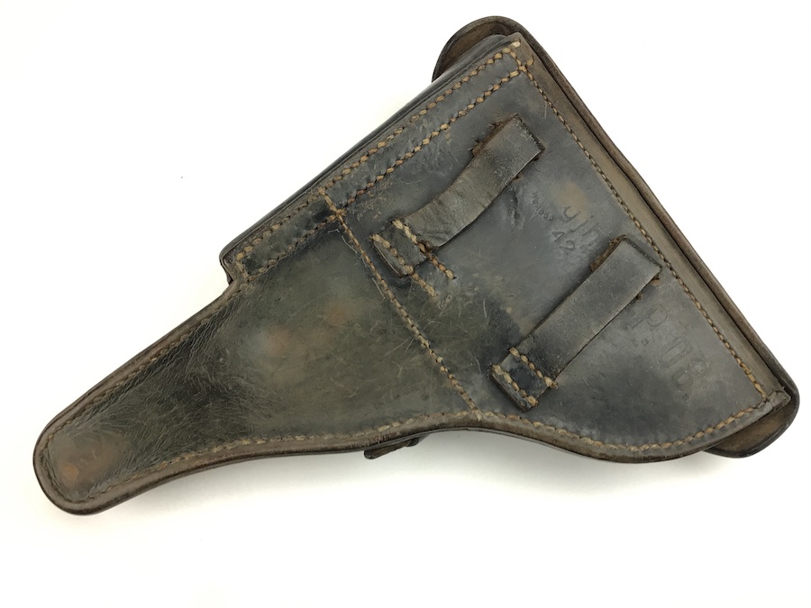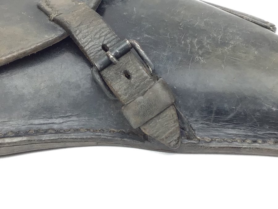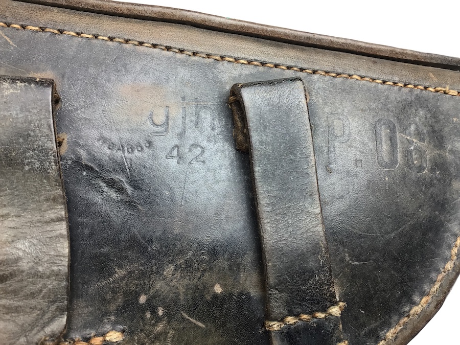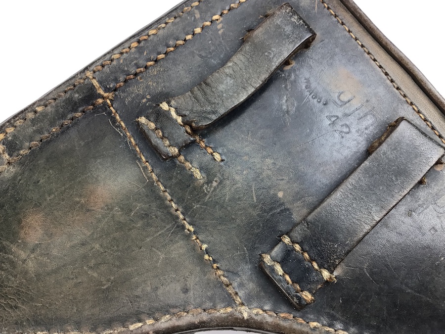 11/29/21 – Very good and original condition 1942 Luger holster. Maker stamped and dated on the back along with military proof stamp WaA668. Although the maker stamp and date are somewhat faint, they are still visible. Surface has a few scuffs and wear marks, as well as finish wear. This is still a collectible piece. All the stitching is original and intact, except for a small loose area on the left bottom belt loop. Clean interior with a secure lift strap.