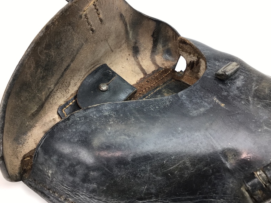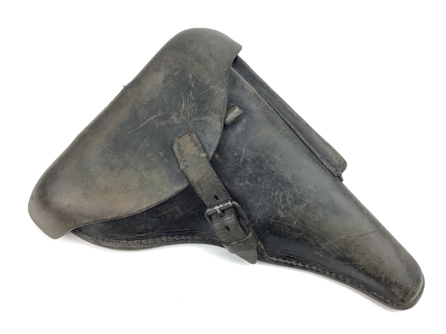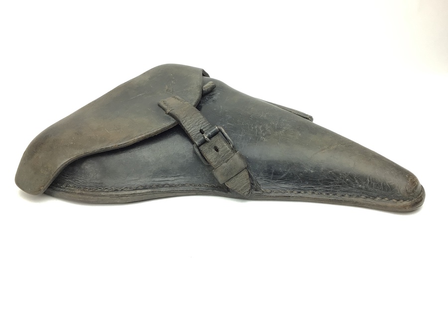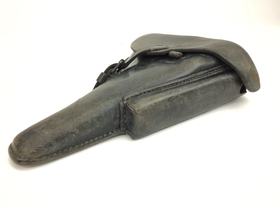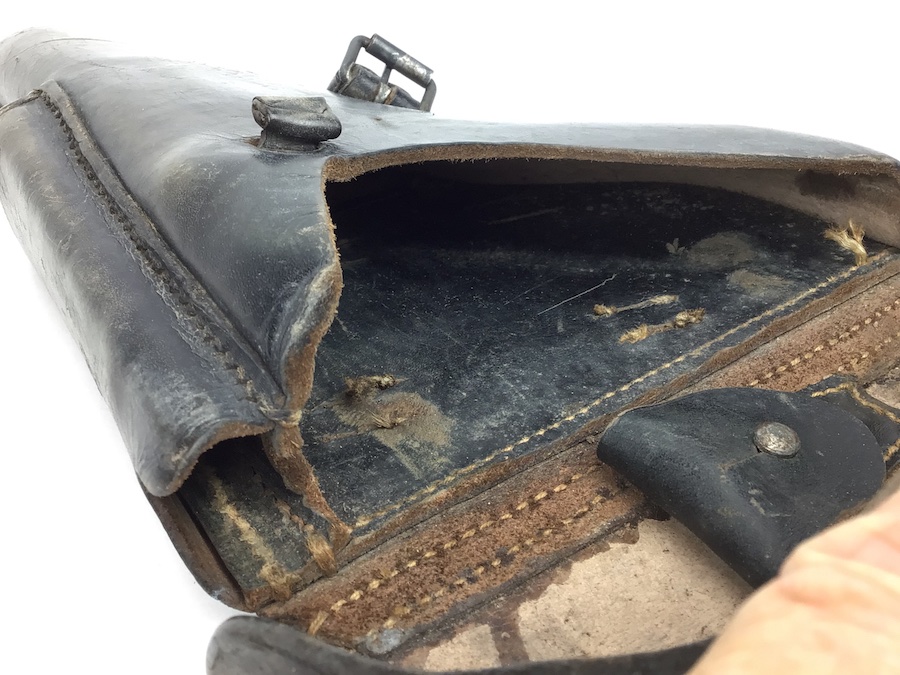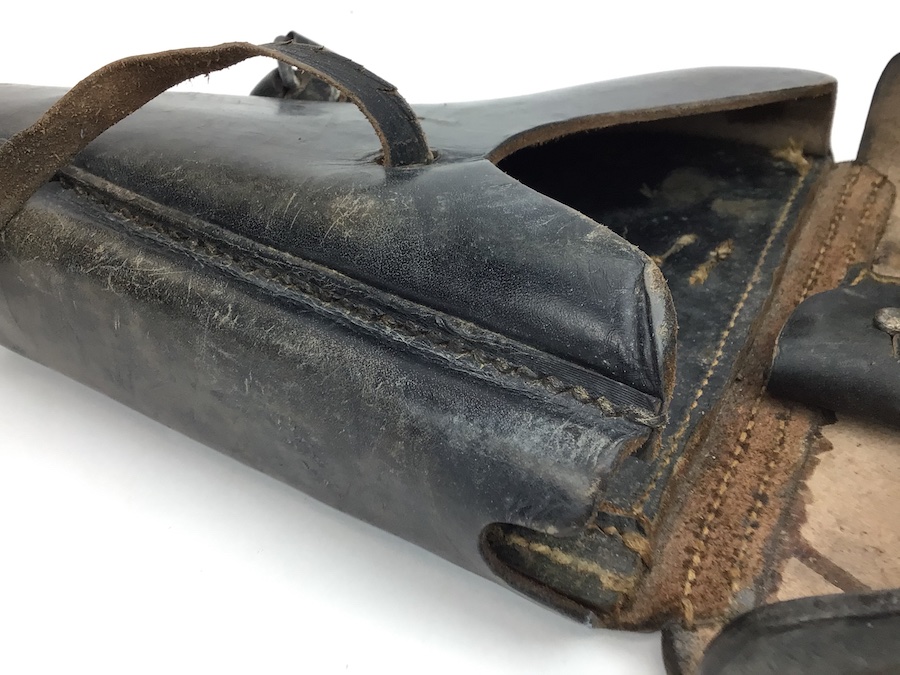 11/29/21 – Very good and original condition 1942 Luger holster. Maker stamped and dated on the back along with military proof stamp WaA668. Although the maker stamp and date are somewhat faint, they are still visible. Surface has a few scuffs and wear marks, as well as finish wear. This is still a collectible piece. All the stitching is original and intact, except for a small loose area on the left bottom belt loop. Clean interior with a secure lift strap.