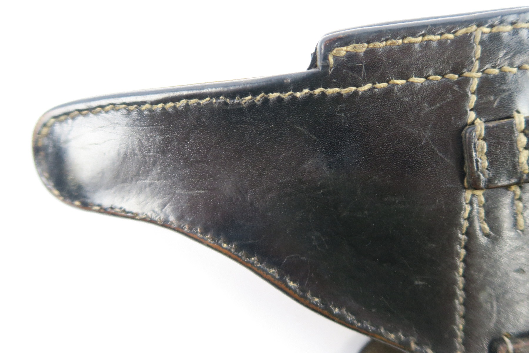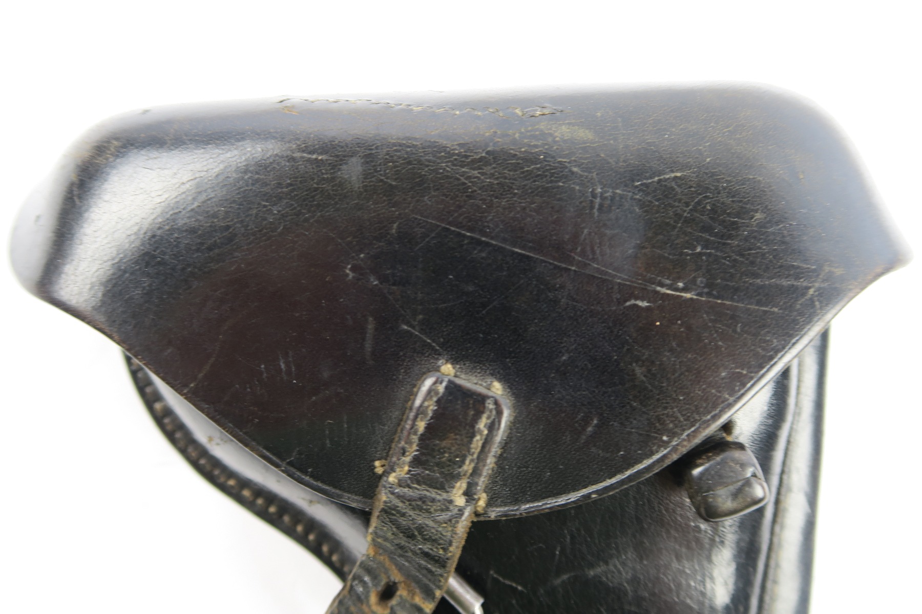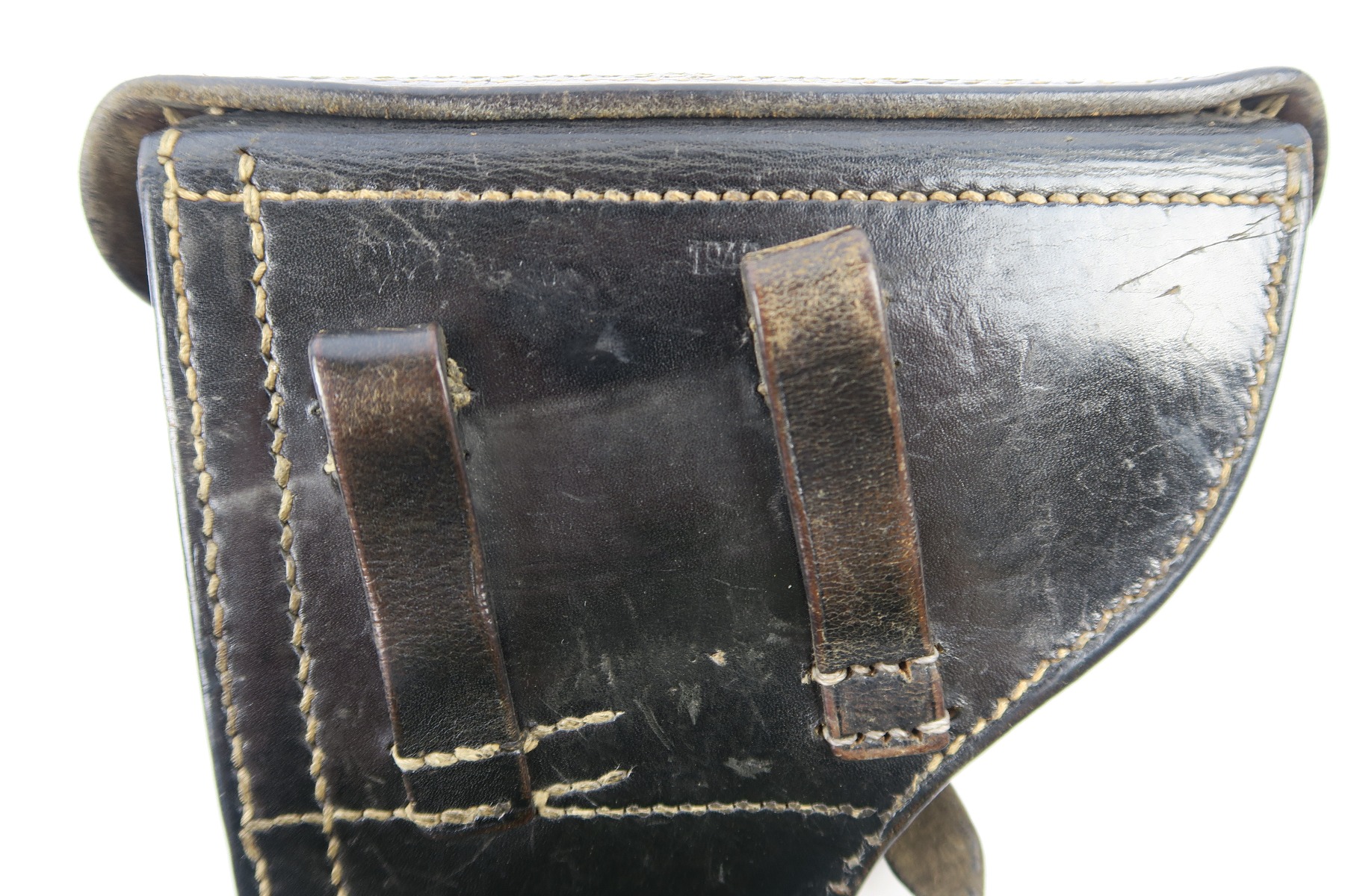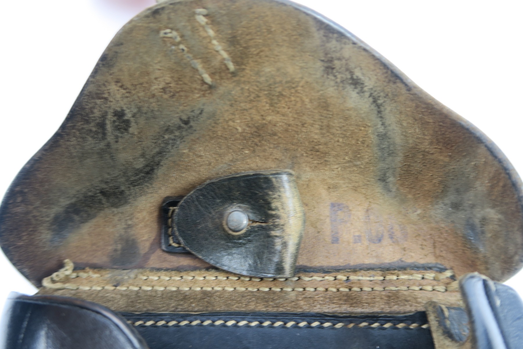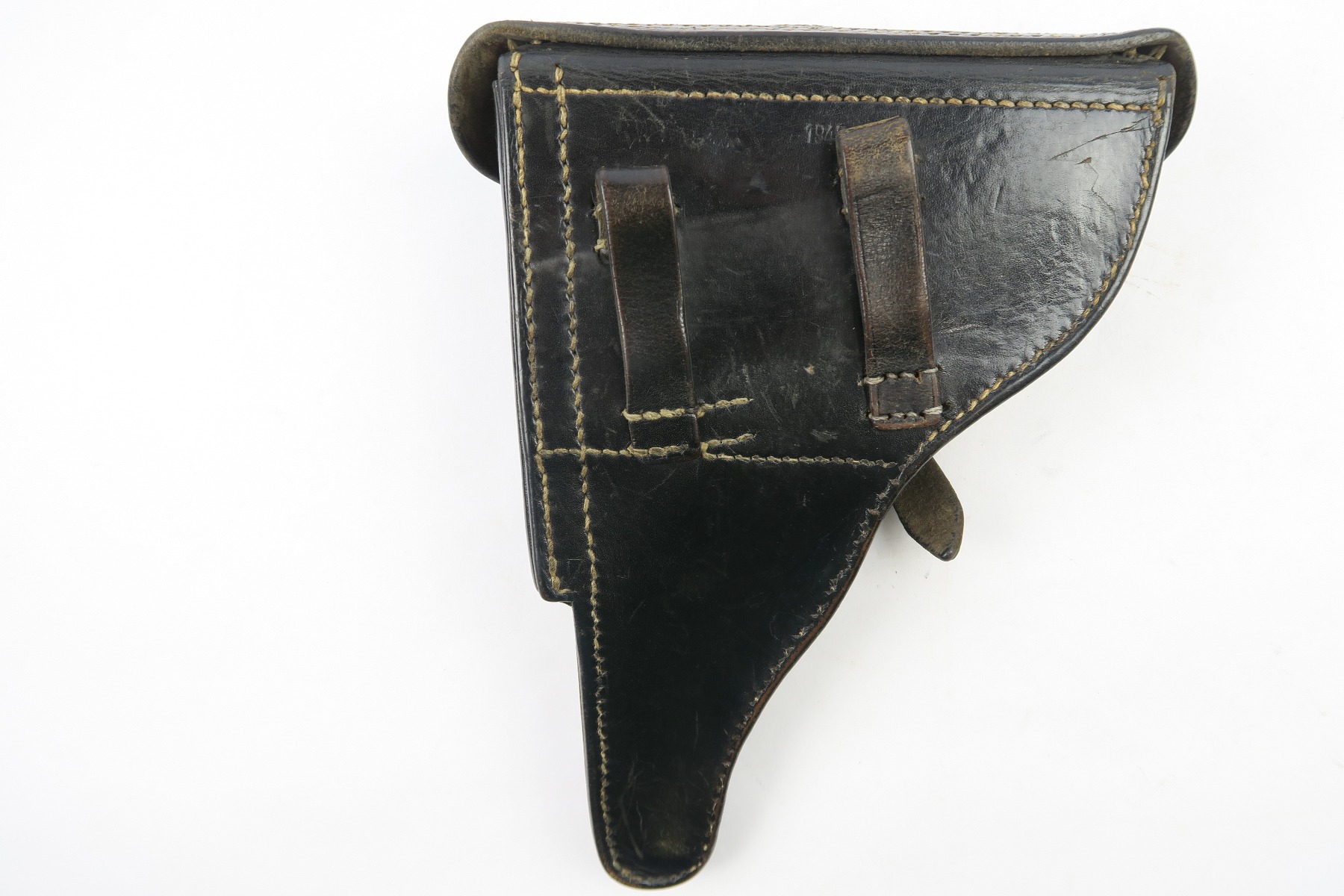 5/2/18 – This is an original Luger holster from WW2. The holster is dated 1942 on the back with a “CWW” maker stamp and waffen eagle military proof. The stamps are very light on the back leather, but still visible. The black leather is completely in tact, with minor pliability. The exterior leather has light wrinkling and surface scratches throughout, but this is normal wear. The interior leather is clean and has a P.08 ink stamp on the interior lid. Guaranteed original and authentic. No stitching issues.