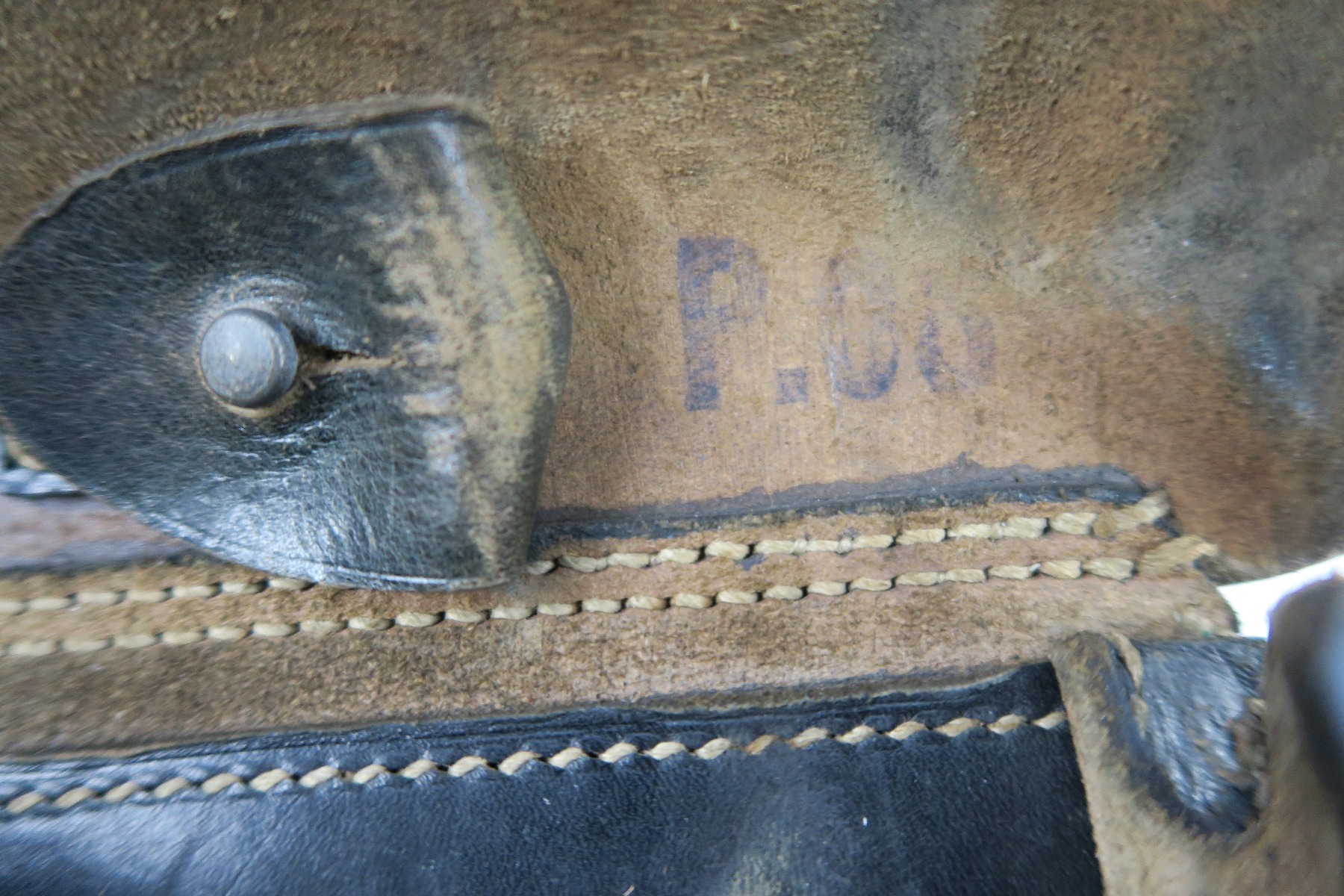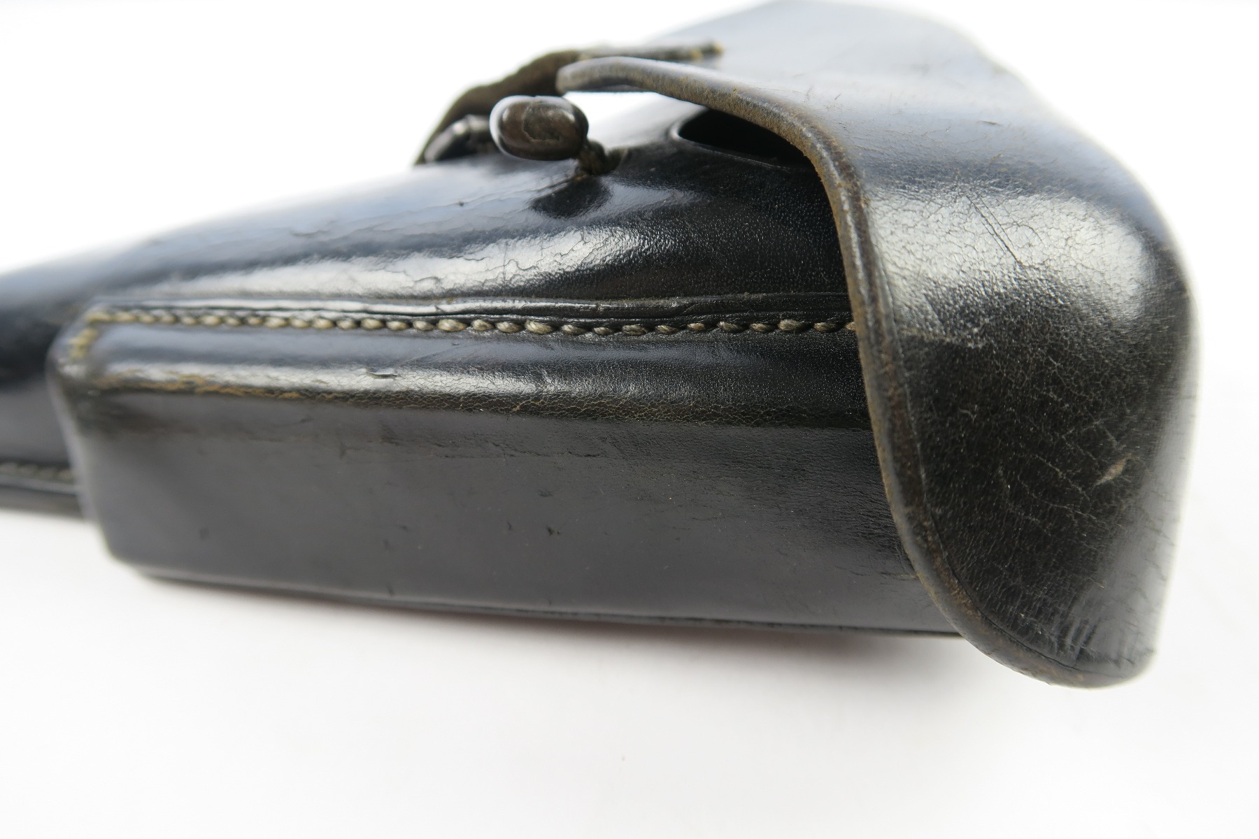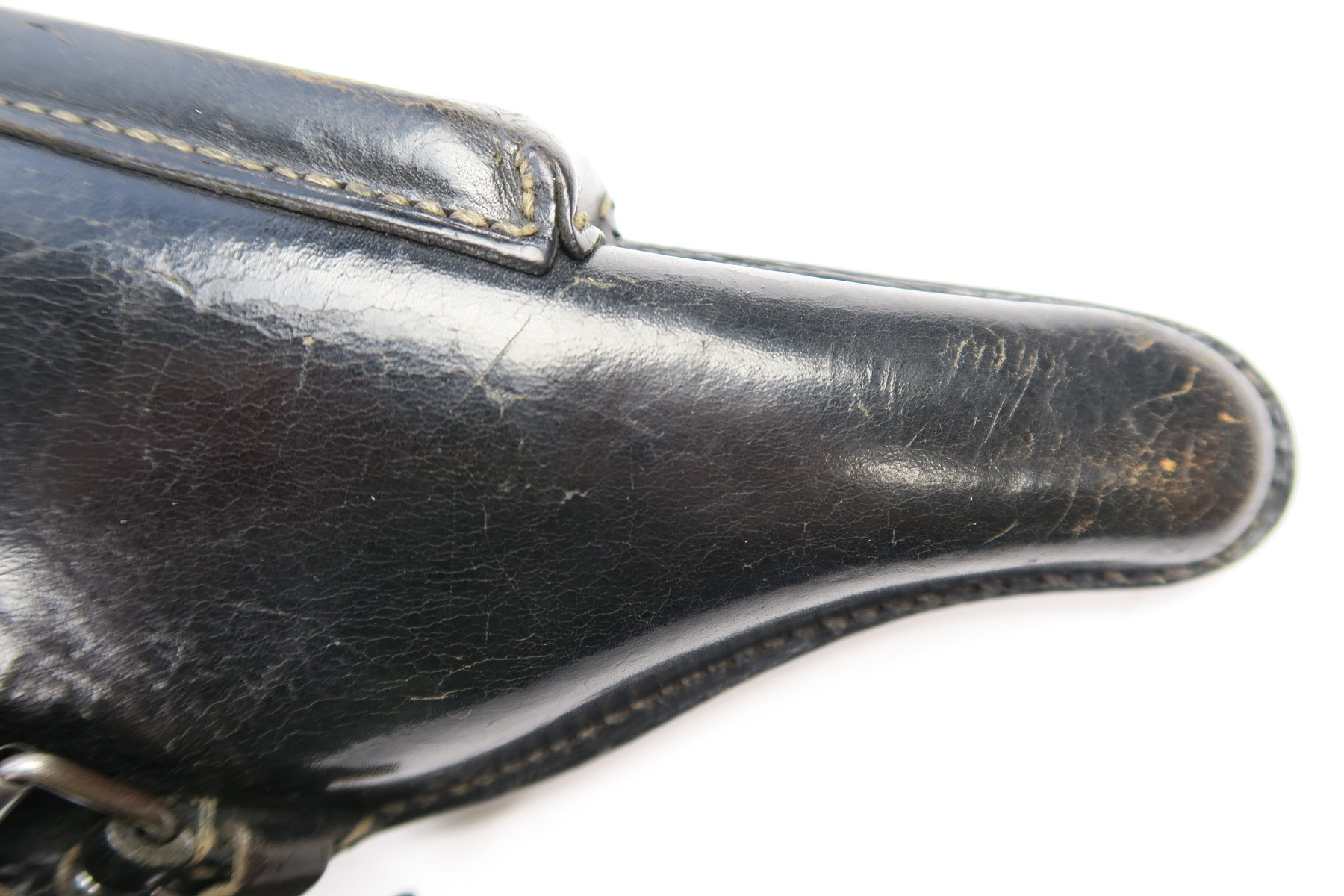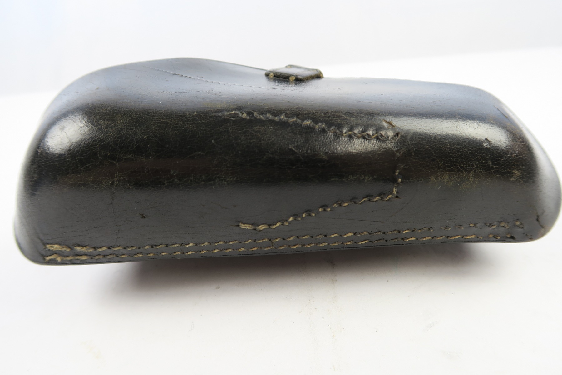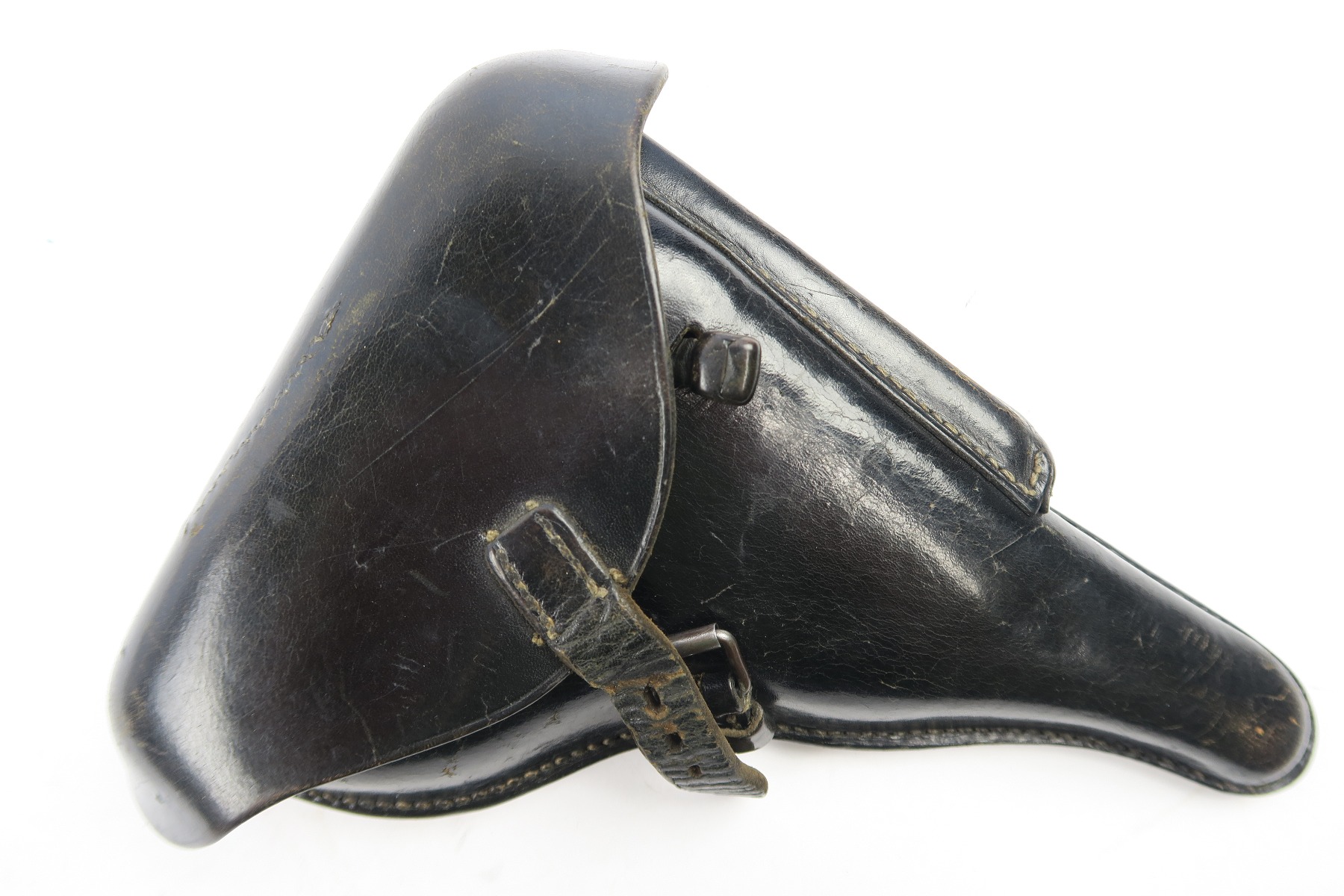5/2/18 – This is an original Luger holster from WW2. The holster is dated 1942 on the back with a “CWW” maker stamp and waffen eagle military proof. The stamps are very light on the back leather, but still visible. The black leather is completely in tact, with minor pliability. The exterior leather has light wrinkling and surface scratches throughout, but this is normal wear. The interior leather is clean and has a P.08 ink stamp on the interior lid. Guaranteed original and authentic. No stitching issues.