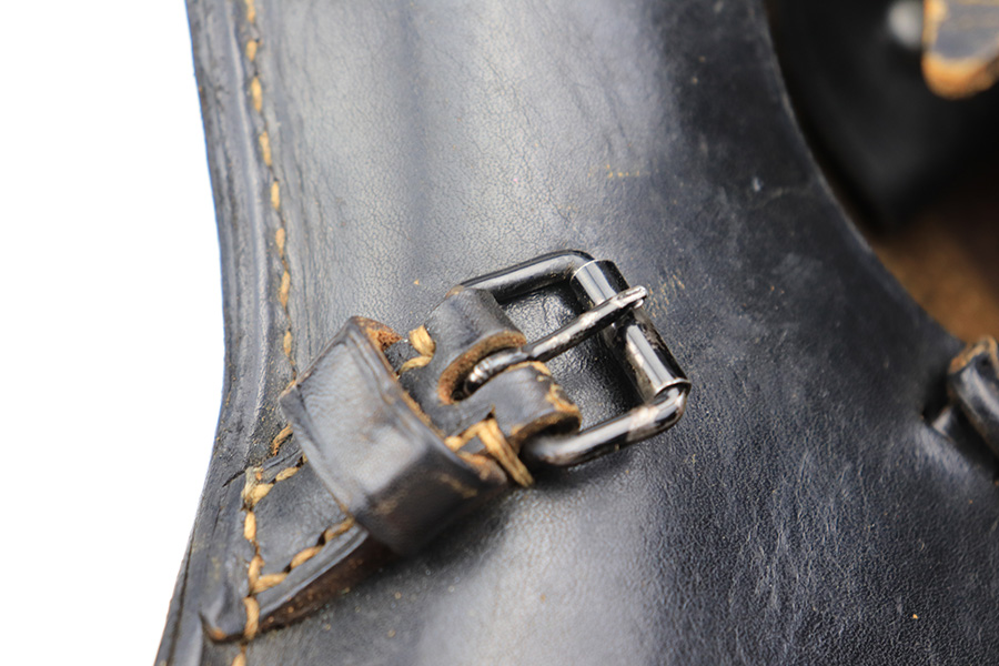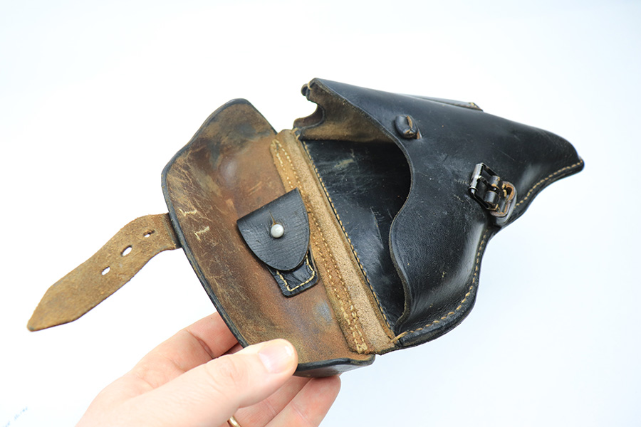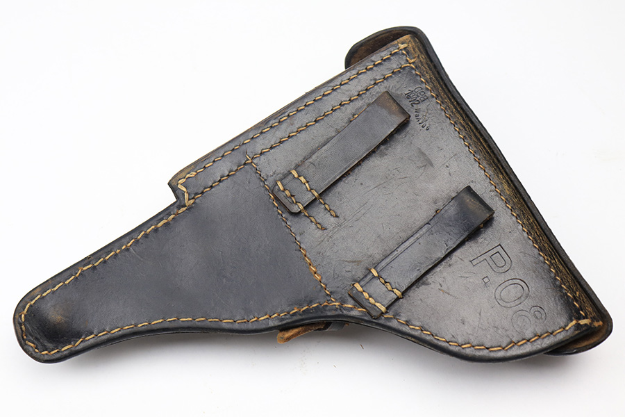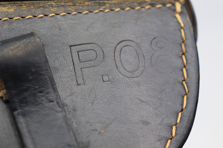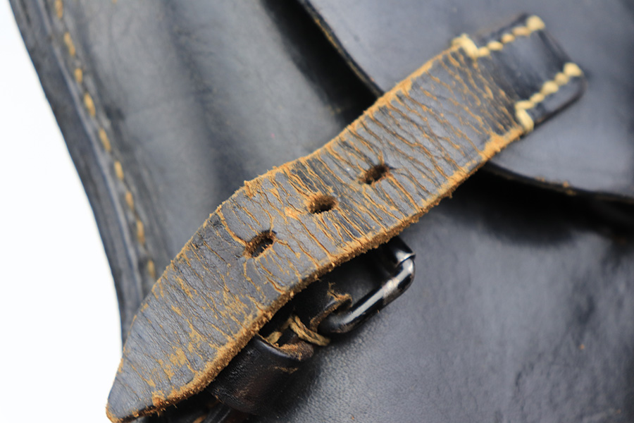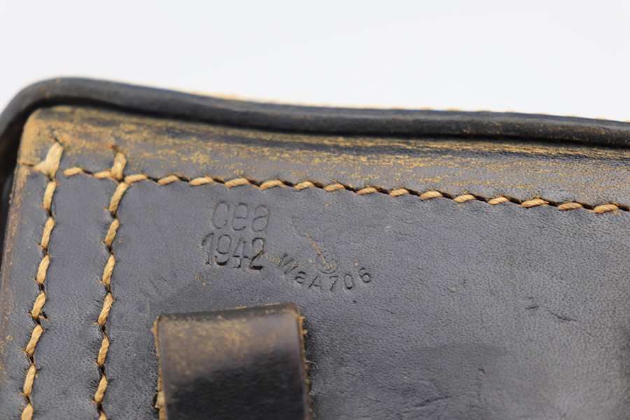 4/5/22 – This is an original 1942 dated Luger holster from WW2. These are highly desirable as they pair perfectly with Black Widow lugers. The leather is pliable but has a relatively clean exterior with only a few mild scuffs on the lid and surface wrinkling on the closure strap. The back leather is maker stamped, dated, waffen proofed, and P.08 stamped. Clean interior leather and no stitching issues.