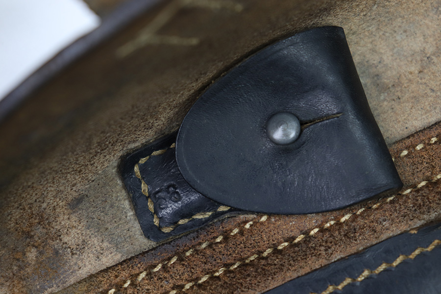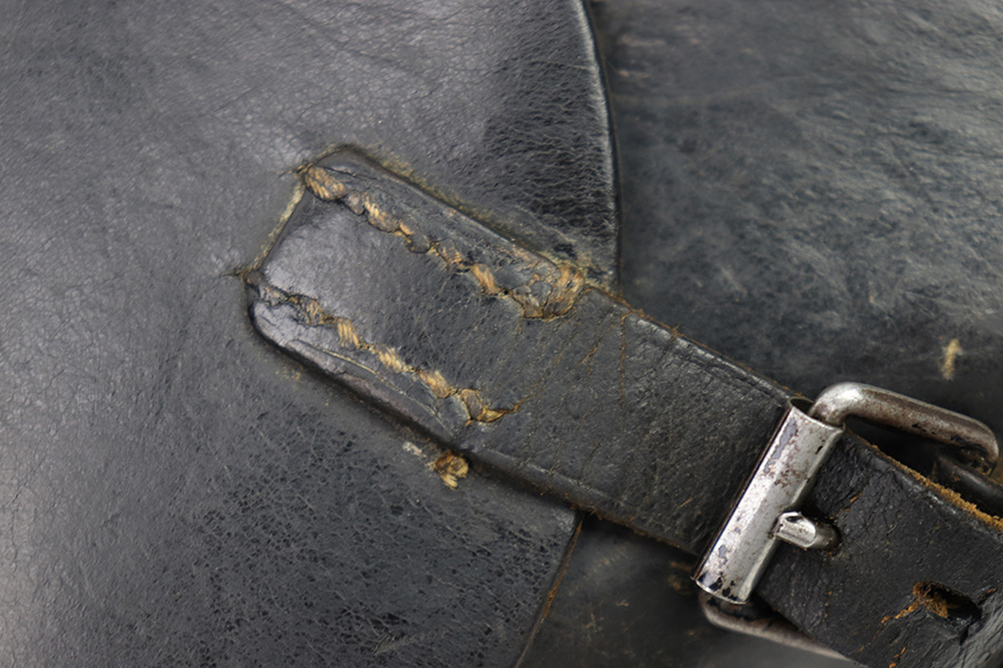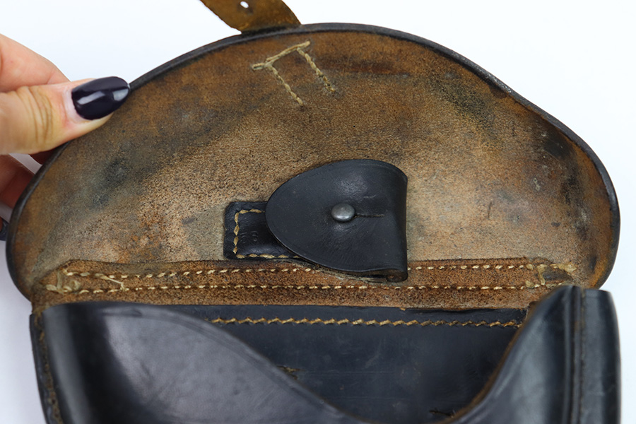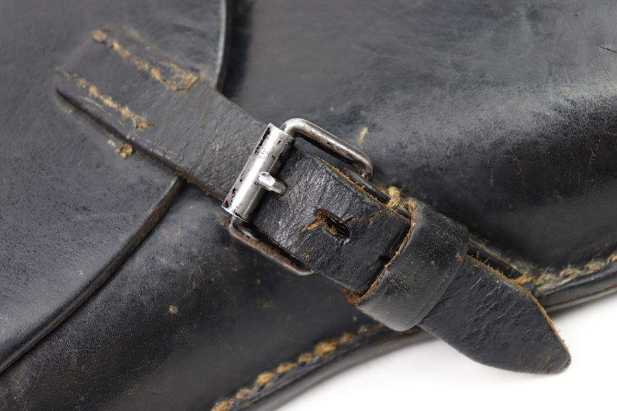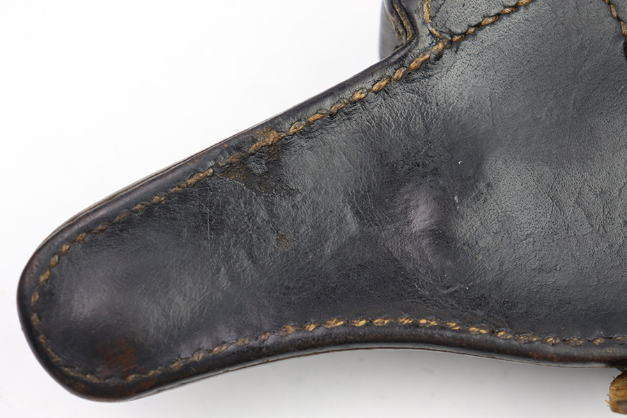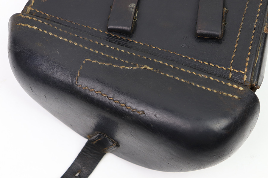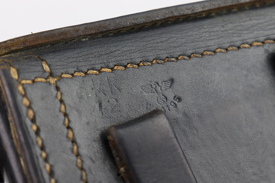 11/11/22 – This is an original 1942 production Luger holster. The holster is maker stamped, dated, waffen and proofed on the back leather. The maker stamp and date are somewhat faint, but still visible. The black leather has mild pliability and typical signs of previous use and aging, without any excessive wear or damage. Excellent, tight original stitching throughout. Fairly clean interior leather. A very nice example, pairs well with a Black Widow Luger.