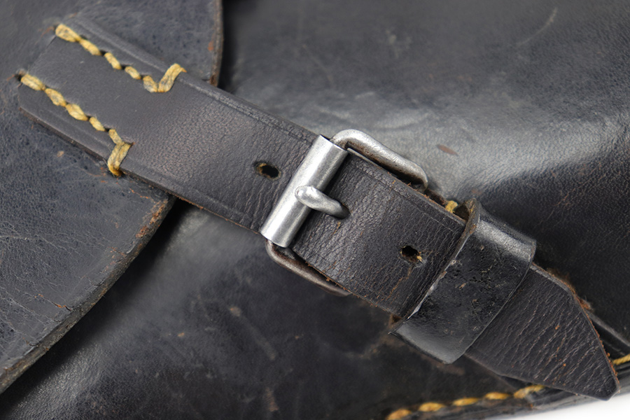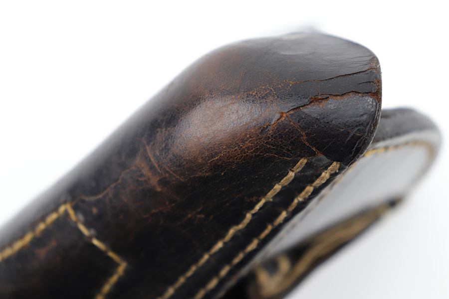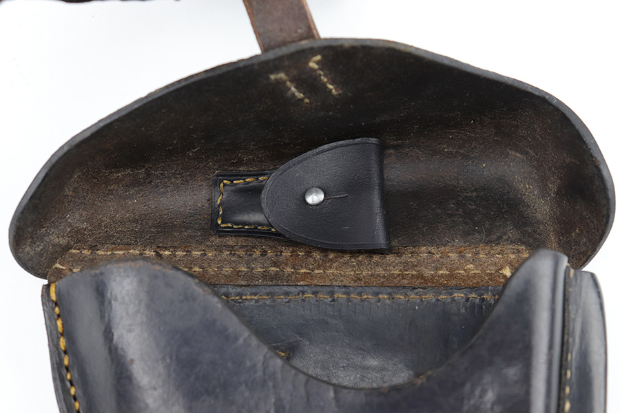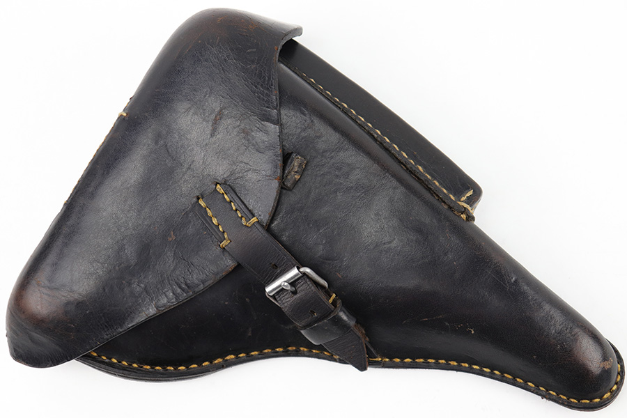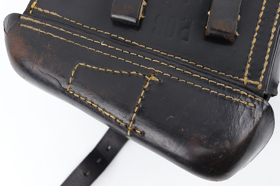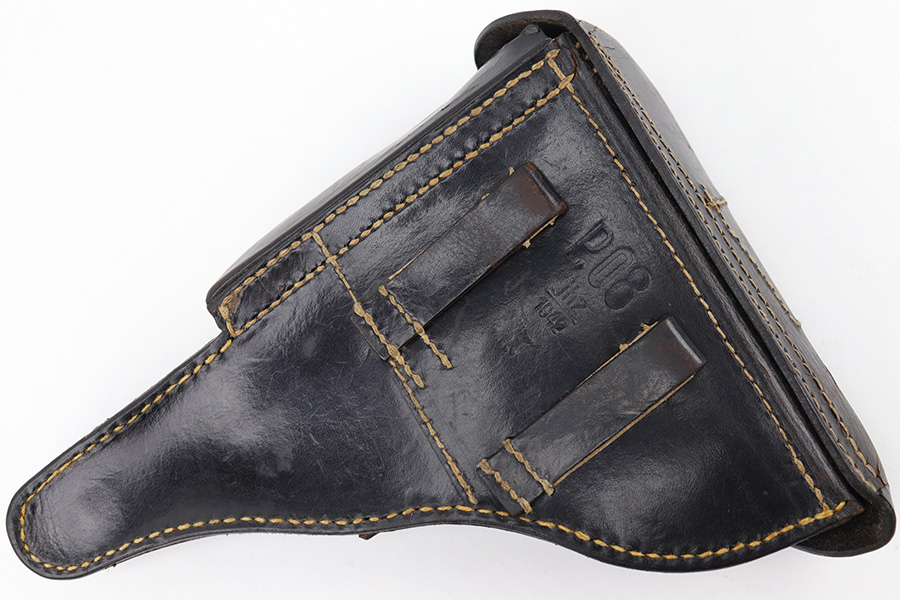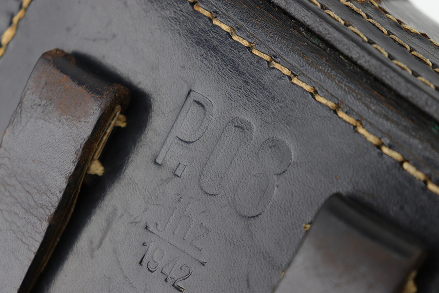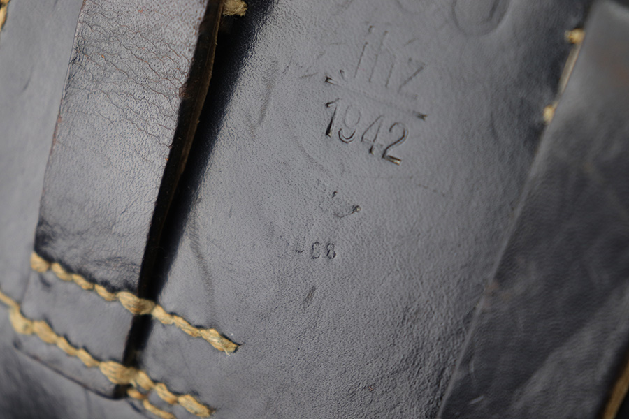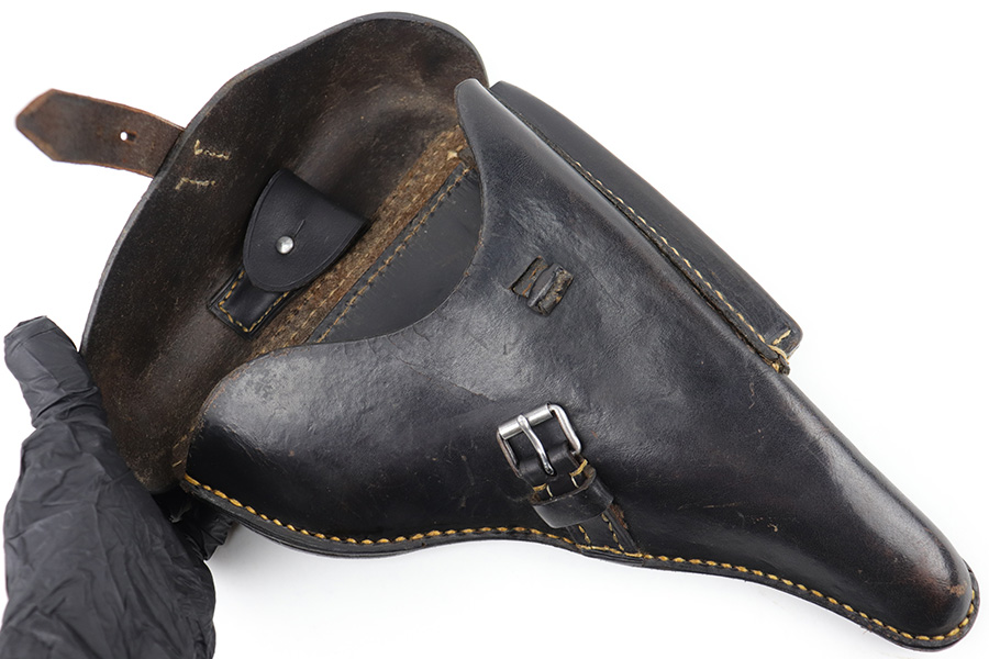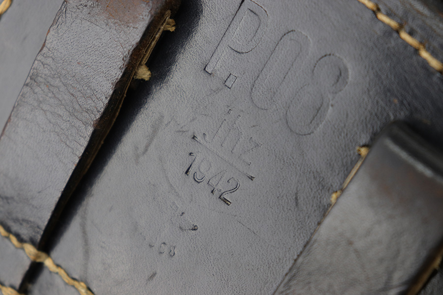 5/22/23 – This is an original 1942 dated Luger holster from WW2. The holster is in near-excellent condition with all original leather and stitching. The black leather has normal pliability and no major issues. The back leather is P.08 stamped with jhz, 1942, and waffen military proof stamps. All stamps are well struck and easily visible. The leather has some mild surface wrinkling on the lid, but no major issues. All original stitching is excellent and tight. Minimal use wear and aging.