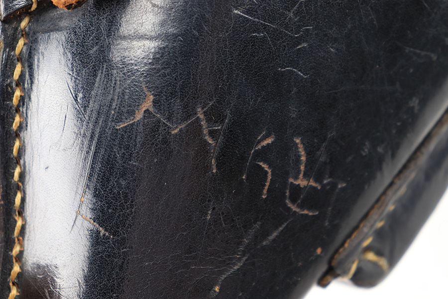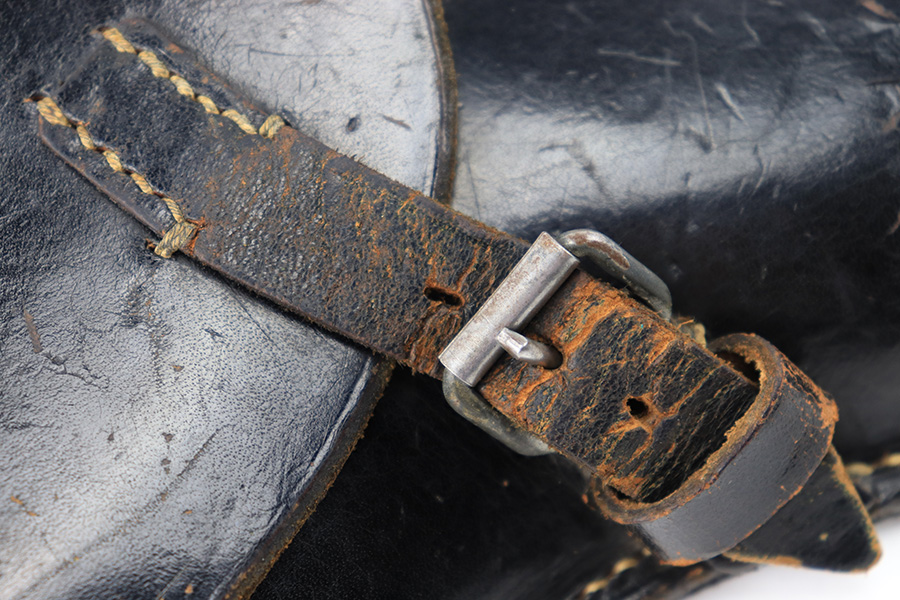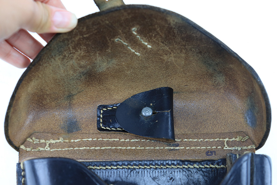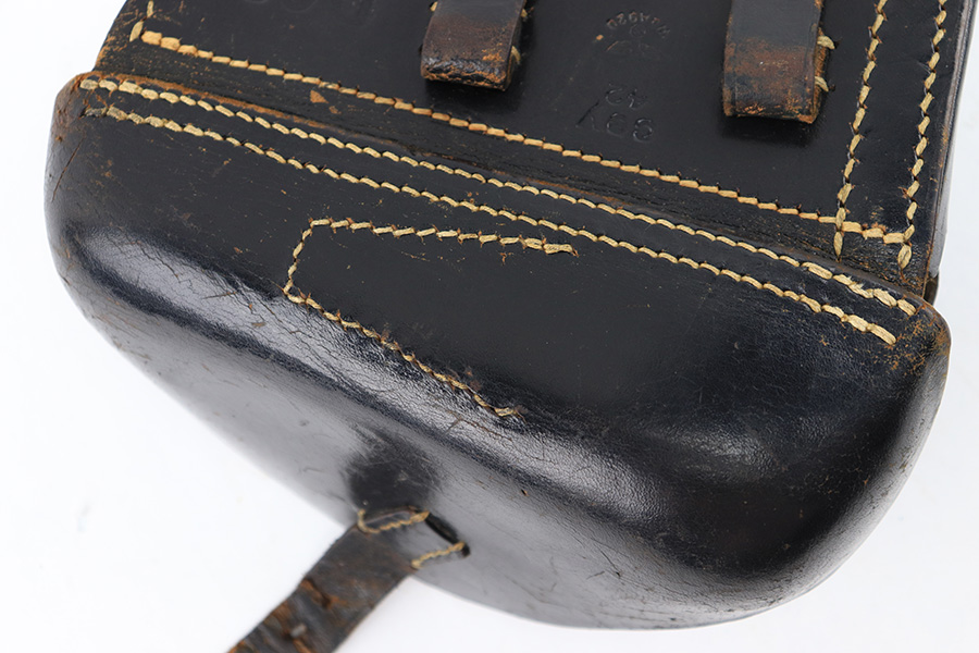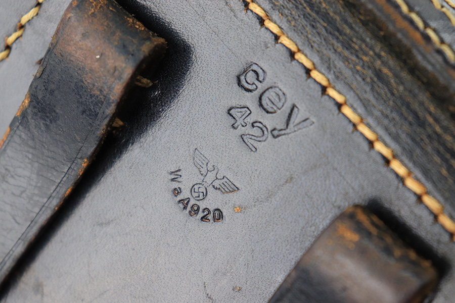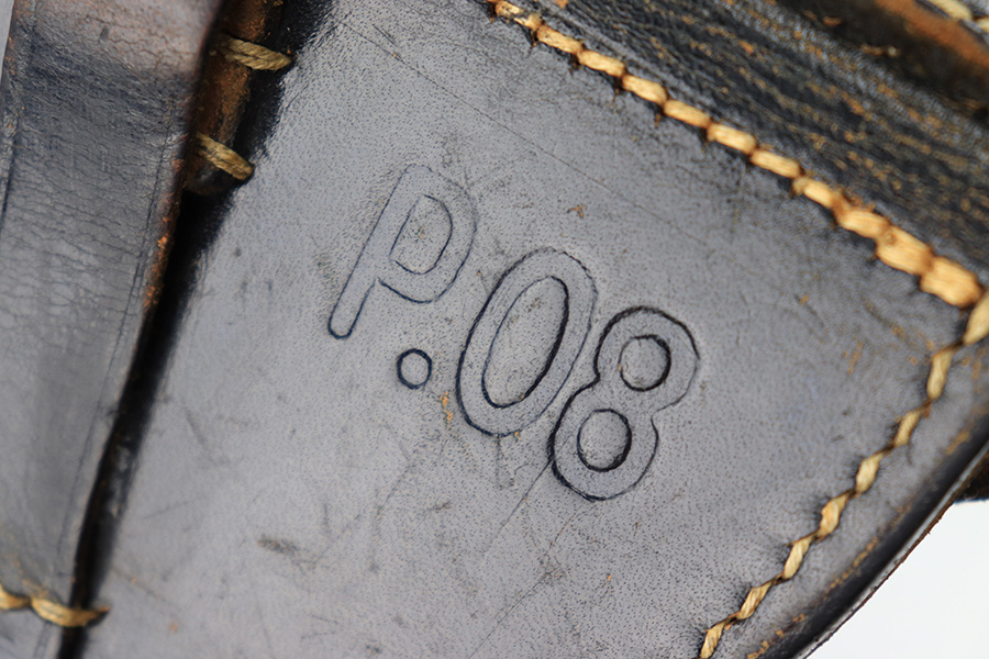 8/14/23 – This is an original 1942 dated Luger holster from WW2. The holster is in great overall condition despite having a few minor imperfections. First is a small amount of wrinkling and scuffing on the closure strap. Second is a name that’s lightly scratched into the front leather. Despite these minor setbacks, the leather is strong and in near-excellent overall condition. Light pliability and clean interior leather. The stitching is all original and excellent throughout. The back leather is stamped with a maker code, date, waffen military proof, and P.08 designation stamp. All markings are crisp and easily visible.