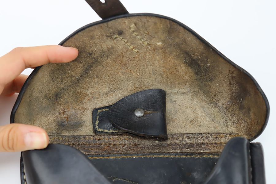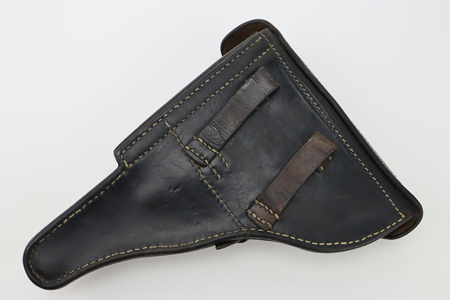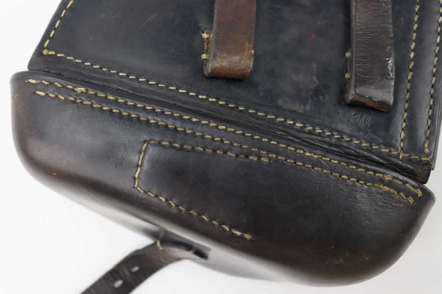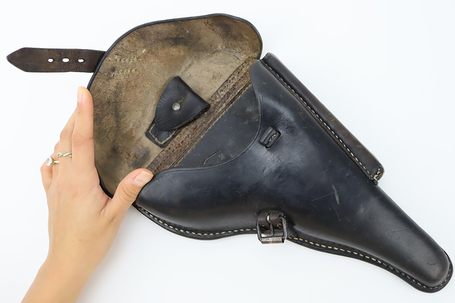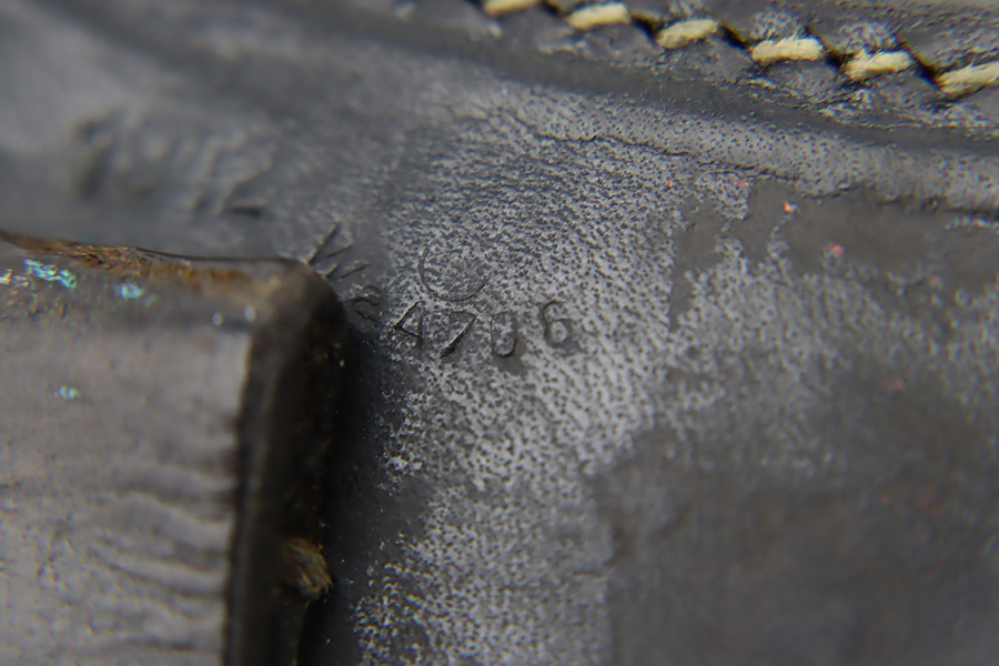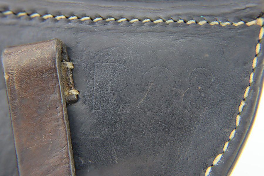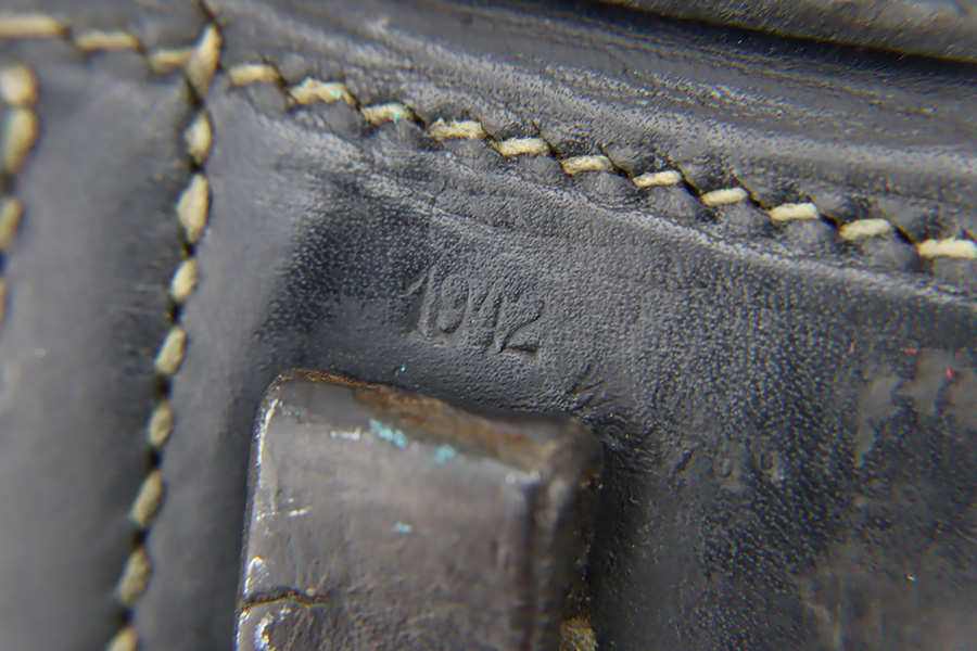 11/10/23 – This is an original 1942 dated Luger holster from WW2. The holster is stamped on the back leather with a faint maker marking which appears to be CWW for Carl Weiss. The holster is also 1942 date stamped, waffen military proof stamped, and P.08 designation stamped. These markings are all faint, as shown. The holster has nice black leather with normal pliability and light use wear but is in great overall condition. All original stitching in great condition as well.