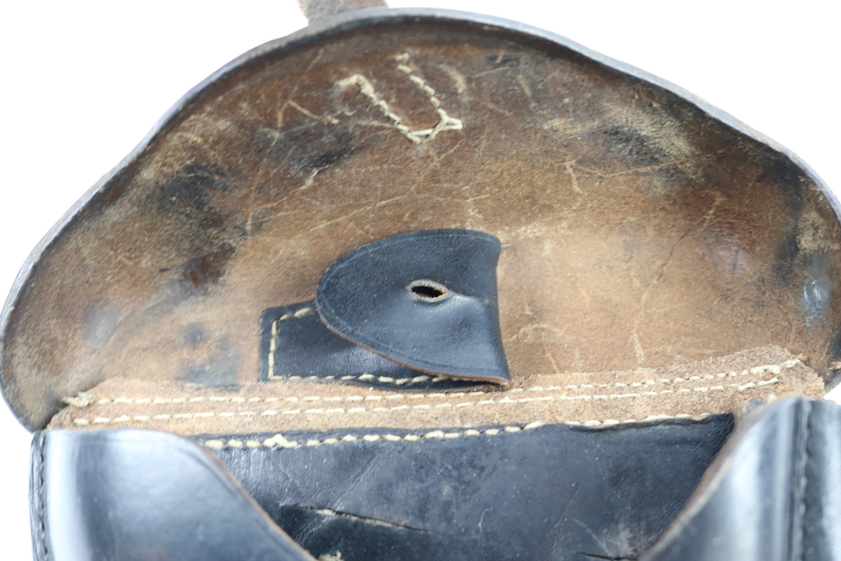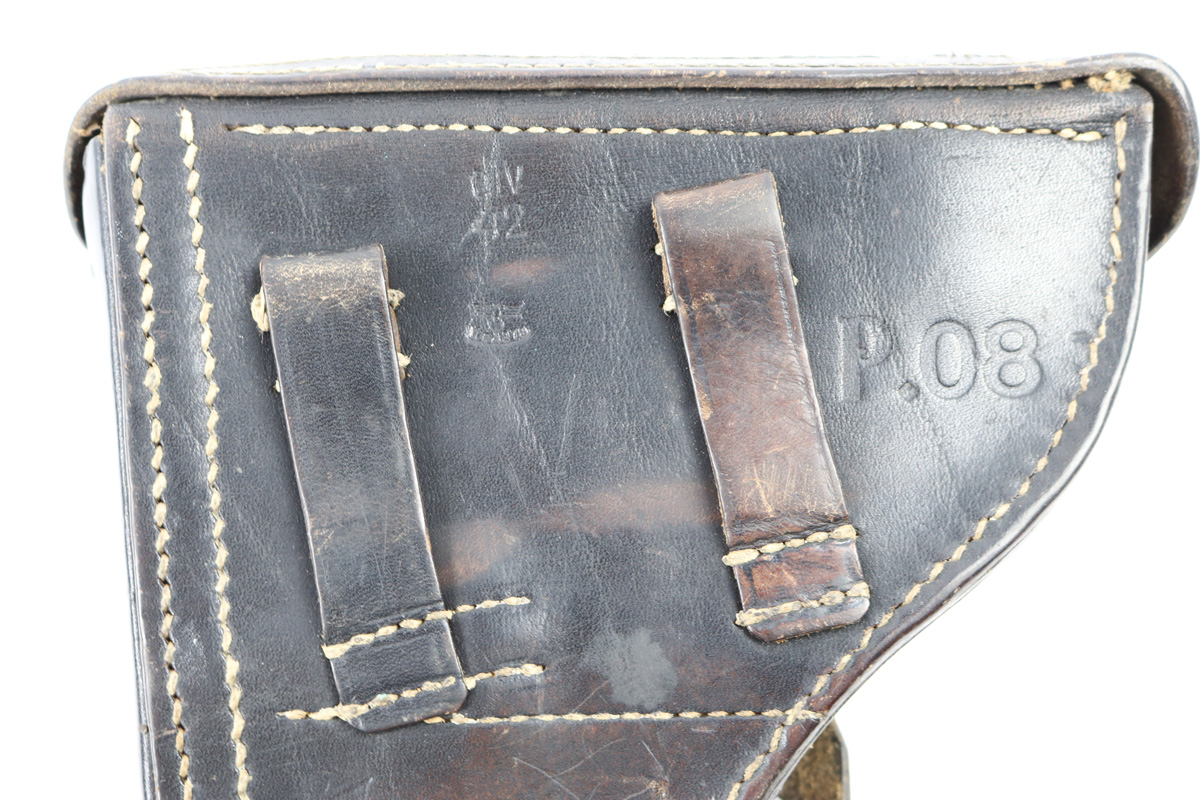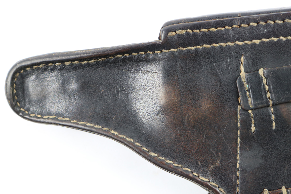 5/18/18 – This is an original 1942 dated Luger holster. The holster has some exterior scuffs and normal wear with semi pliable leather. The leather is all in tact though, as is the stitching. The backside of the holster is maker stamped, 42 dated, and waffen proof stamped. Guaranteed original.