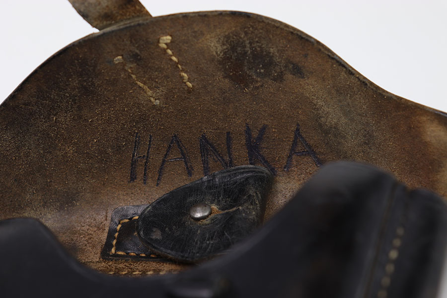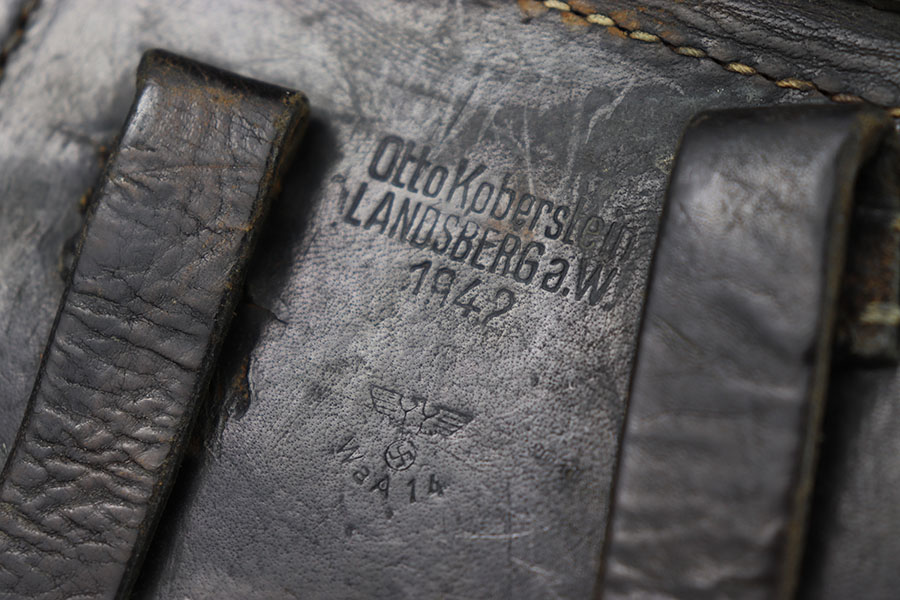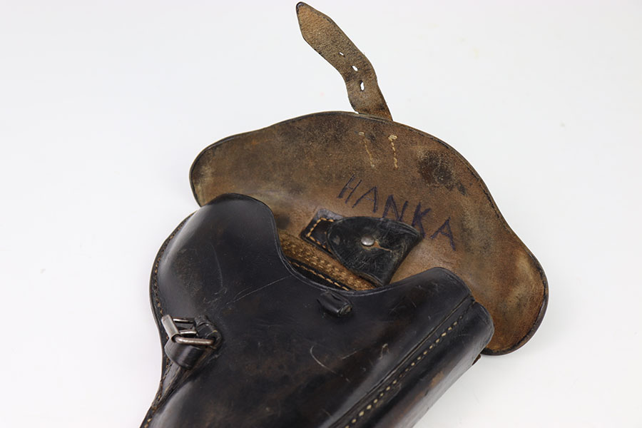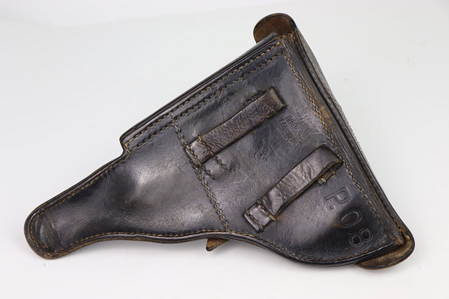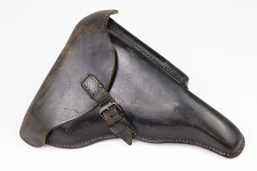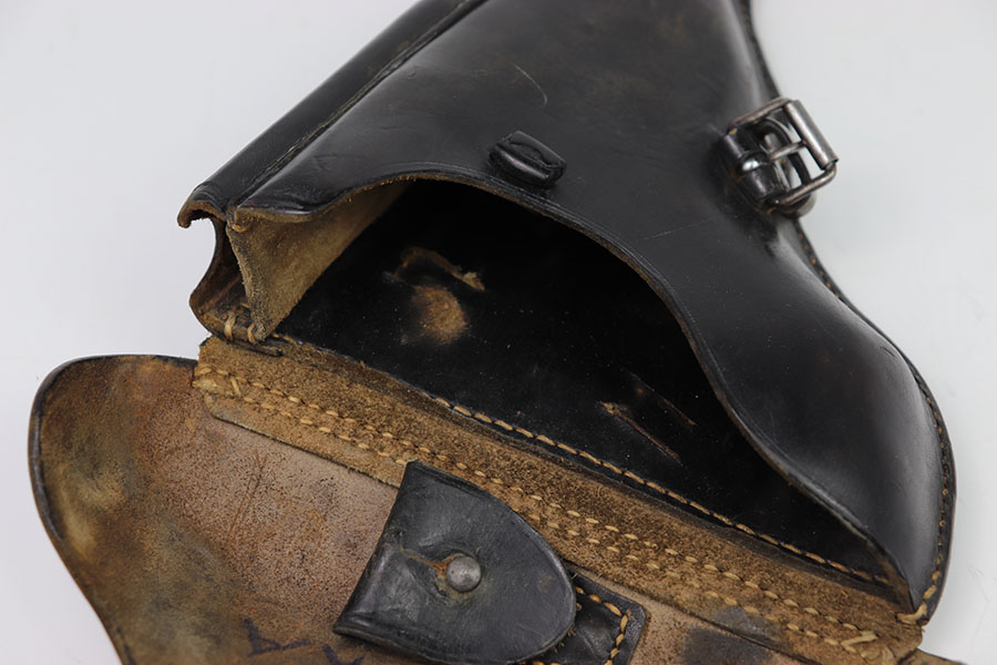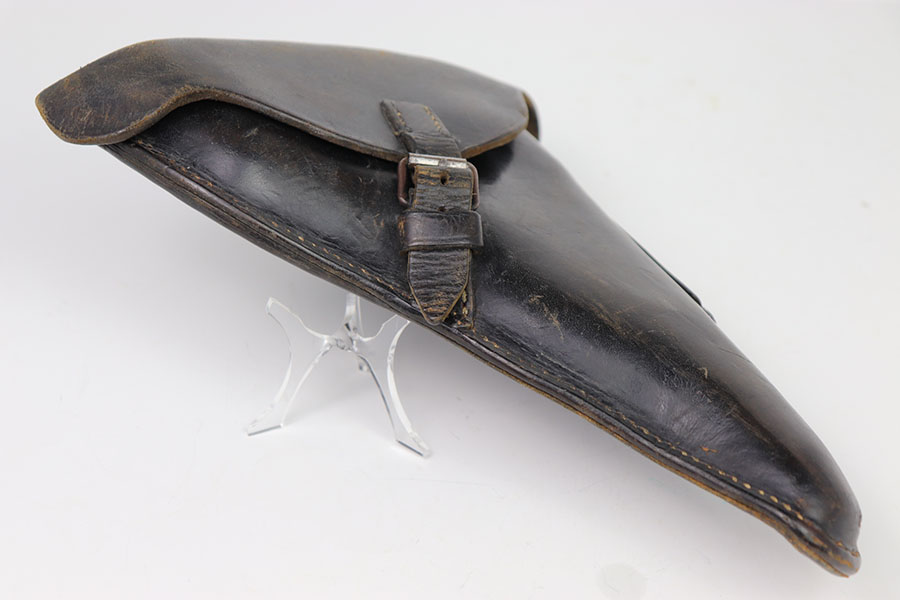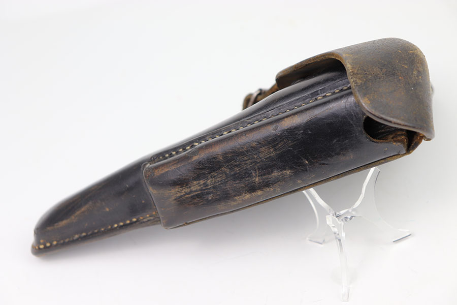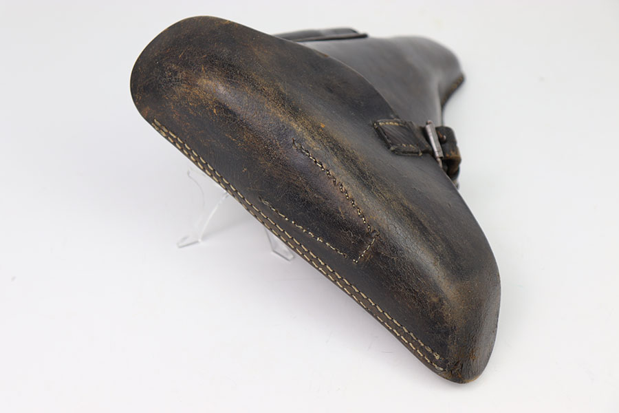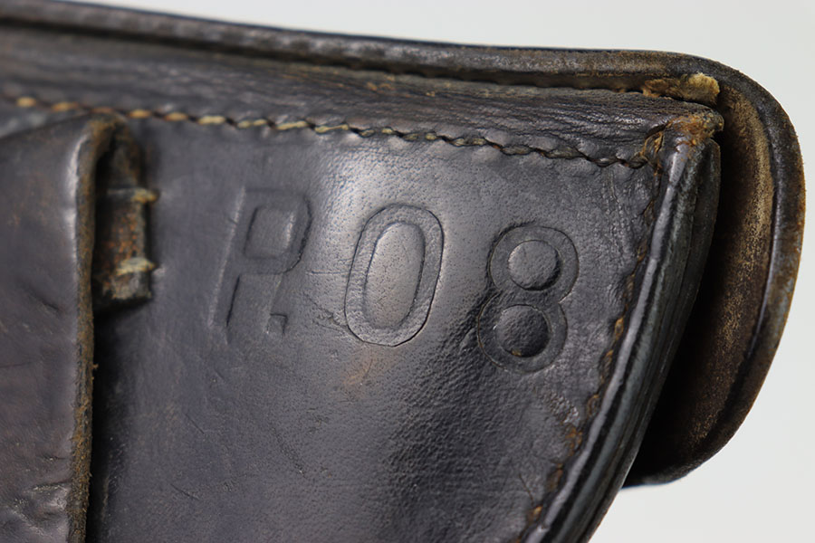 3/25/24 – This is an original 1942 dated Luger holster from WW2. The holster is in great+ overall condition. The closure flap has some minor surface wear to the leather from typical use and some light scratches to the magazine pouch. The black leather is maker stamped, date stamped, military proof stamped, and P.08 stamped. Has an excellent closure strap with no cracking or tears. The leather has mild pliability and shows typical signs of use mainly on the closure flap and some light surface scratches throughout. The stitching is in excellent condition and all original throughout.