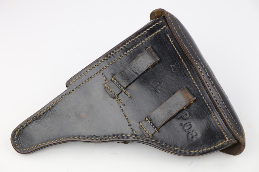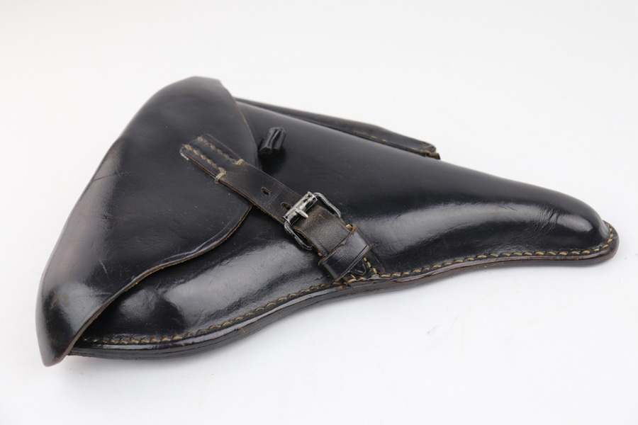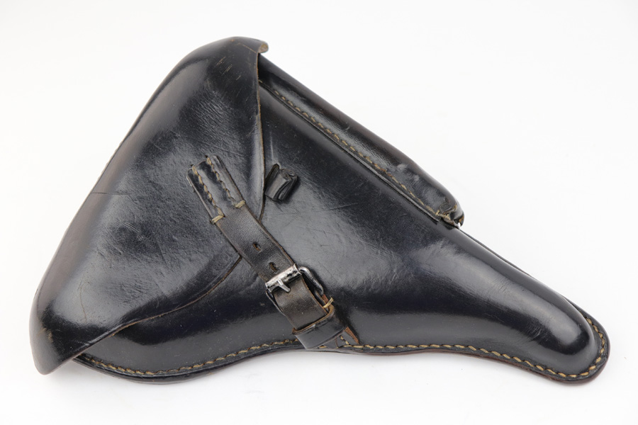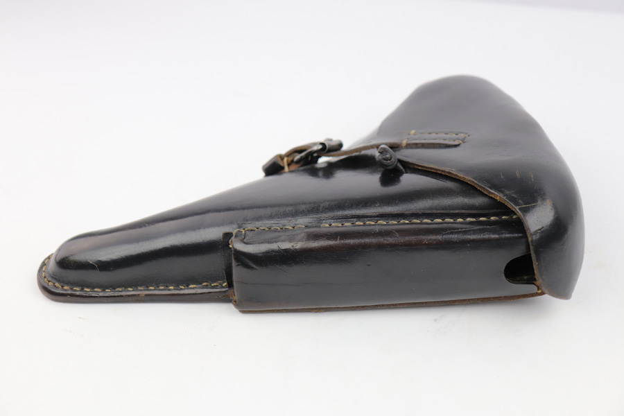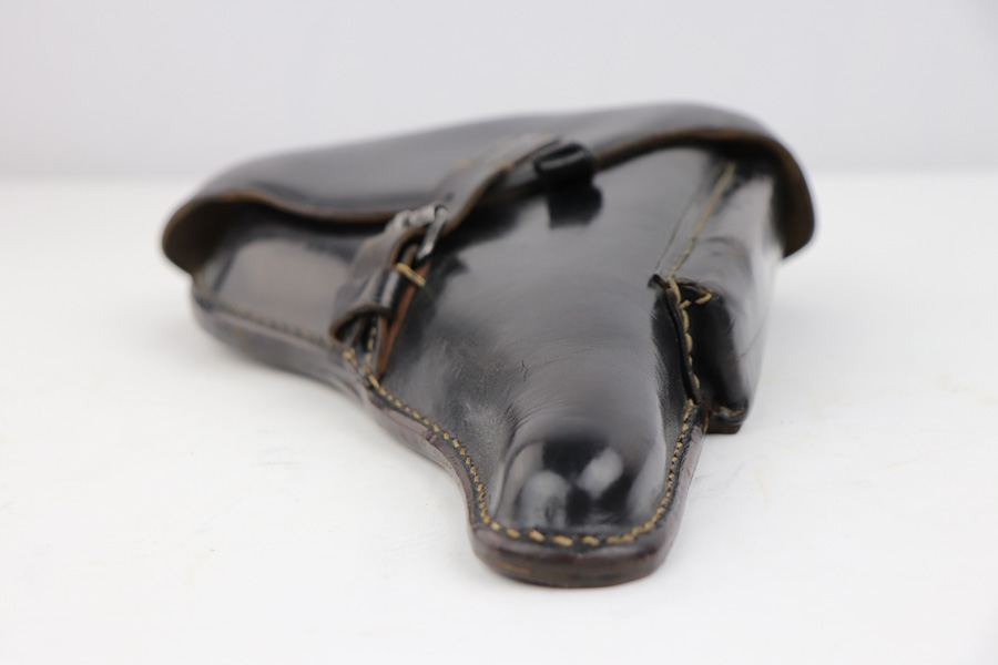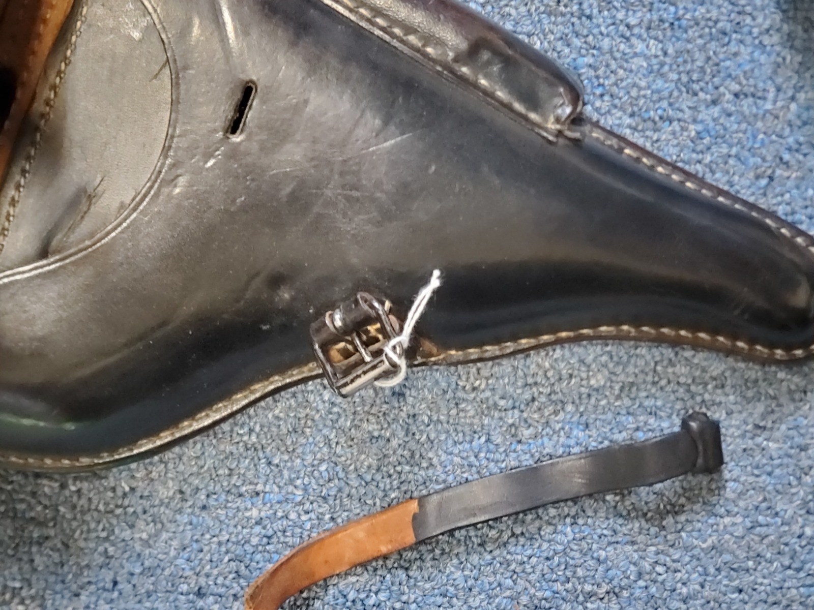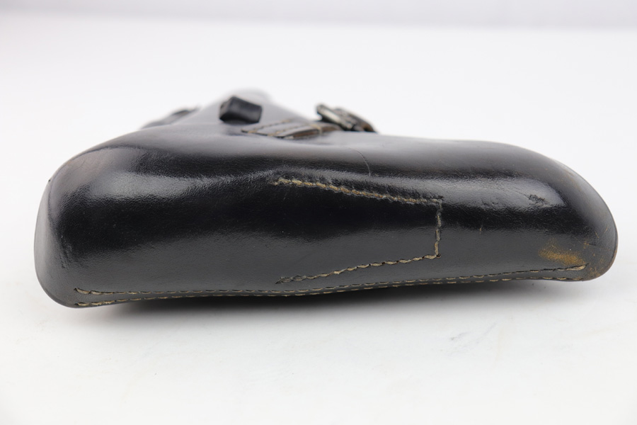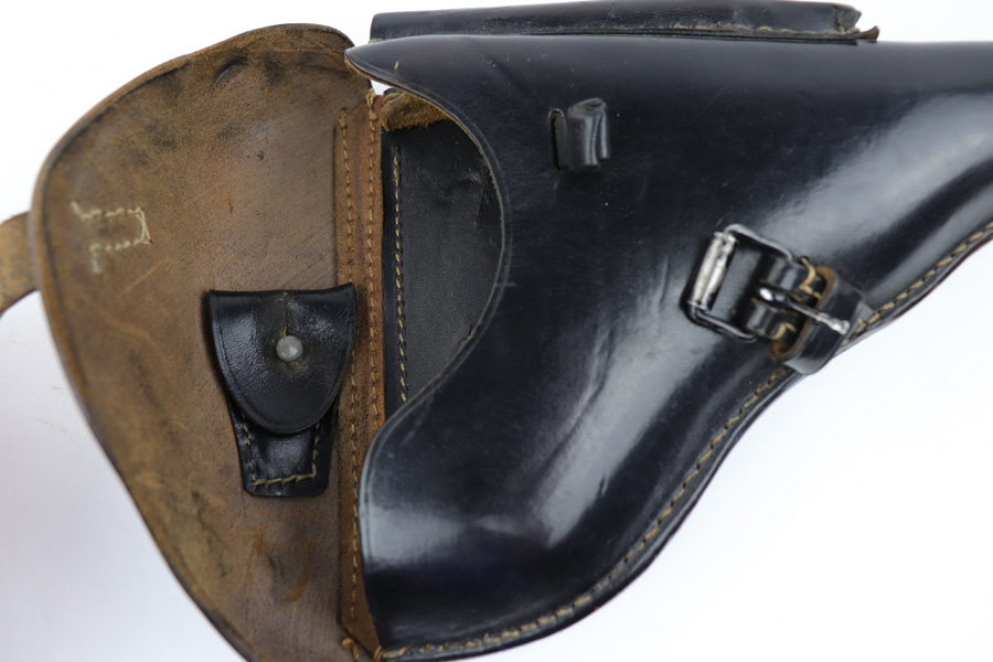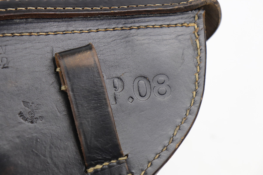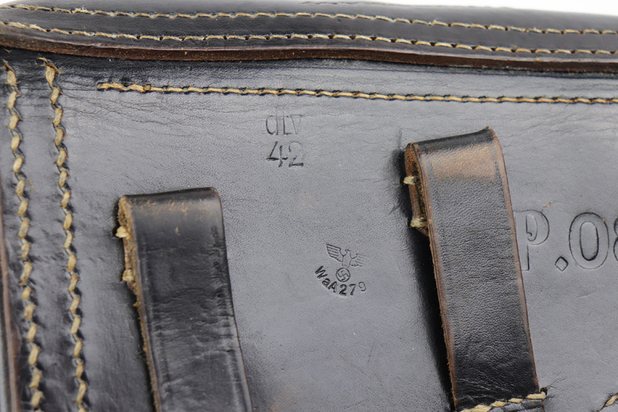 7/22/19 – This is an original 1942 dated Luger holster in excellent condition. This holster would be priced much higher, but the lift strap is detached from the interior body of leather (see last photo). Otherwise all original black leather is clean and slightly pliable. All original stitching in tact. Maker stamped and dated with a waffen proof stamp on the back leather.
