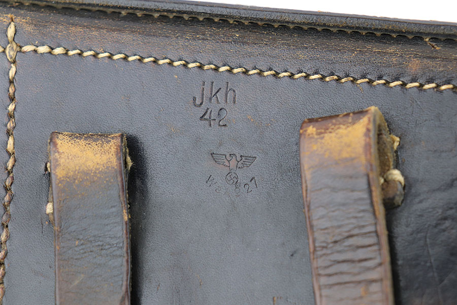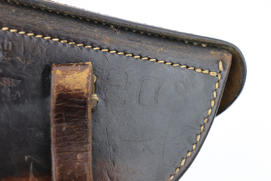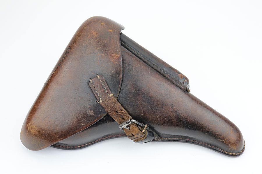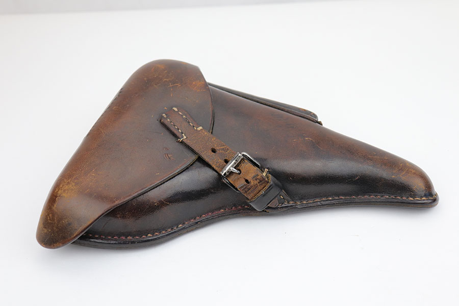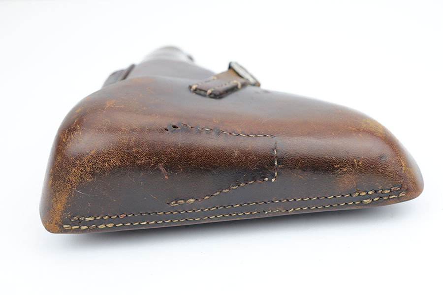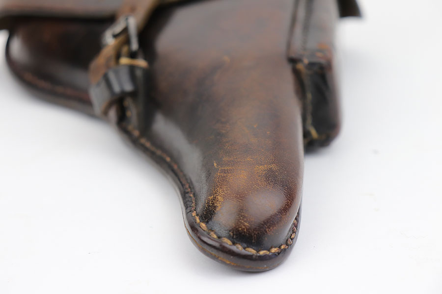 9/27/19 – This is an original 1942 Luger holster from WW2. Made during the last year of luger production, and good to pair with black widow lugers. This holster has lost some of it’s original black dye, but overall is in good condition. Some light exterior scuffing but no major damage and clean interior leather. All original stitching in tact. Great collector holster reasonably priced.