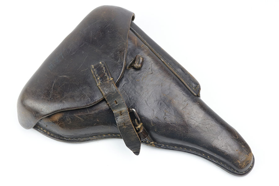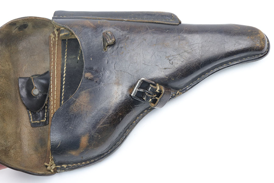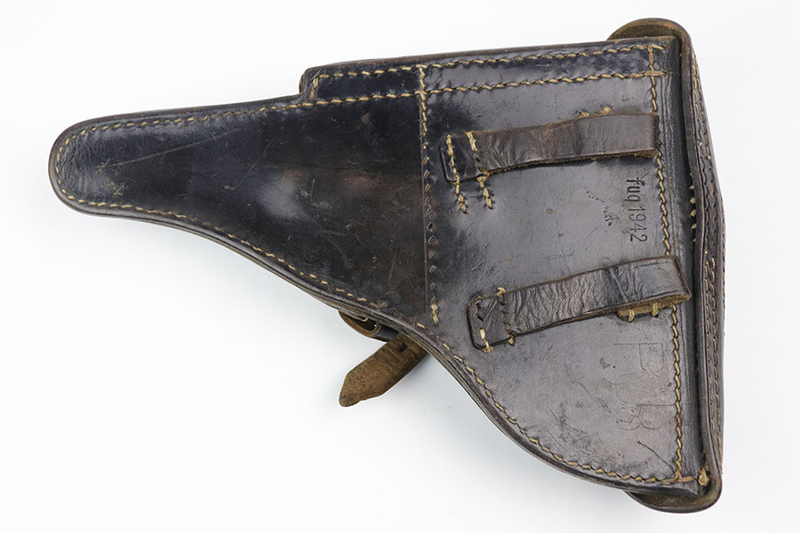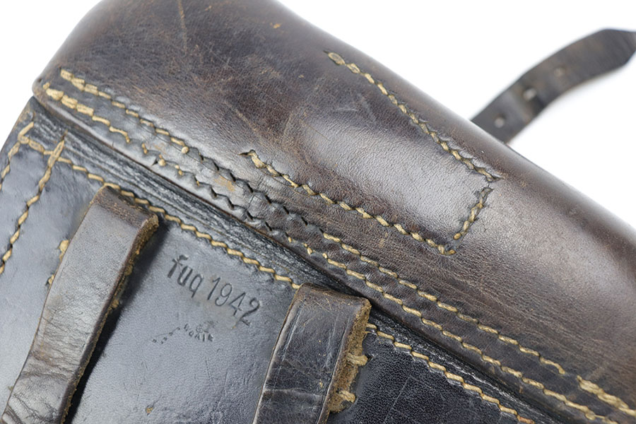10/15/20 – This is an original 1942 dated luger holster. Maker stamped, dated, and waffen proofed on the back leather. Some missing stitches on the top, but no major issues and still completely in tact. Light surface wear and normal signs of aging but the leather is in good overall condition.