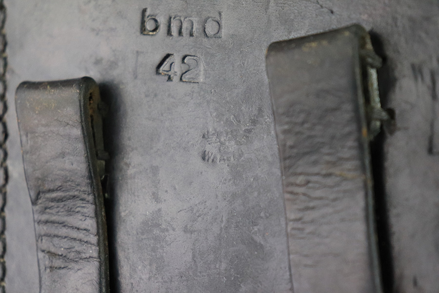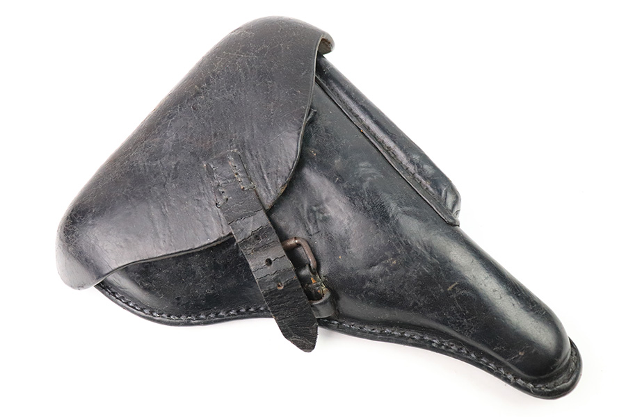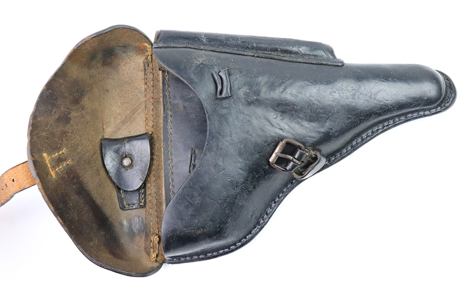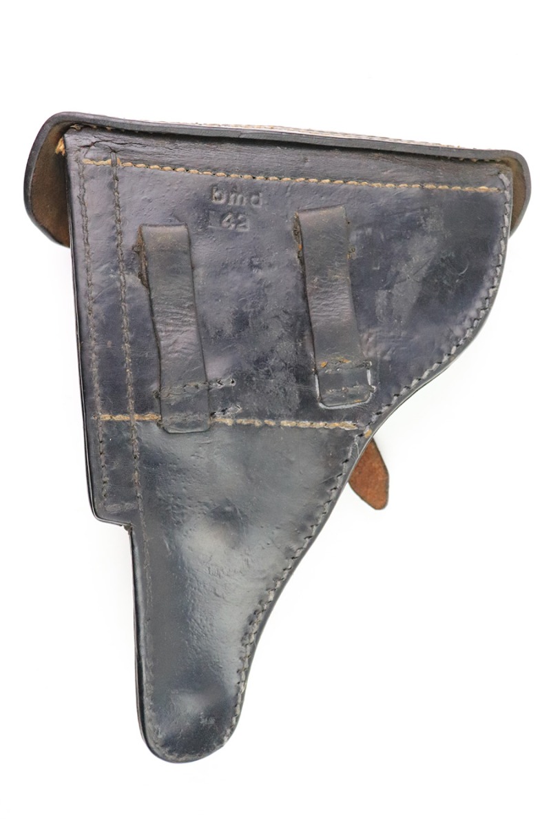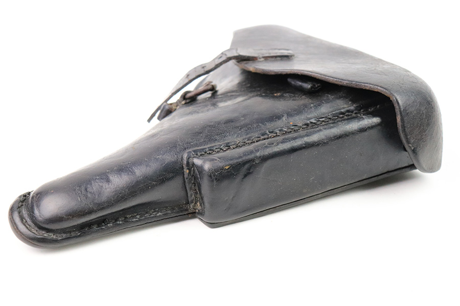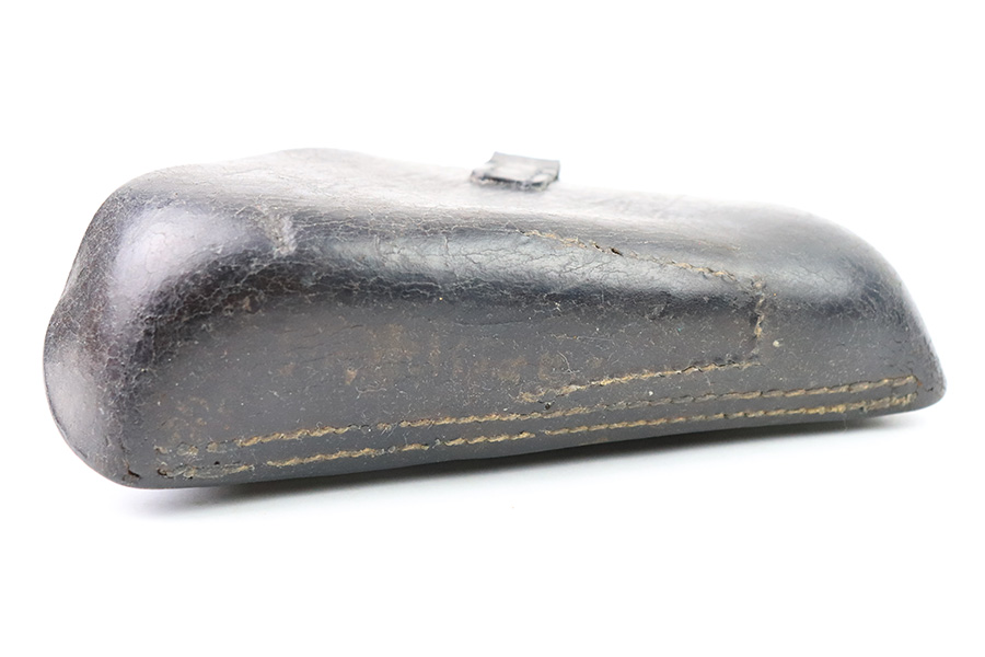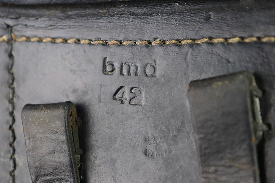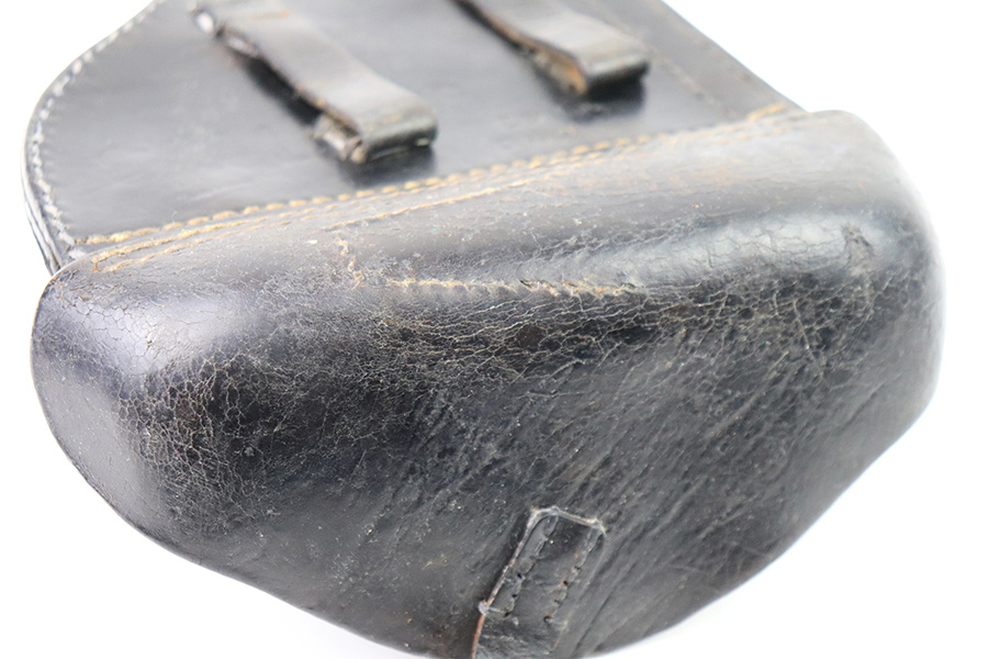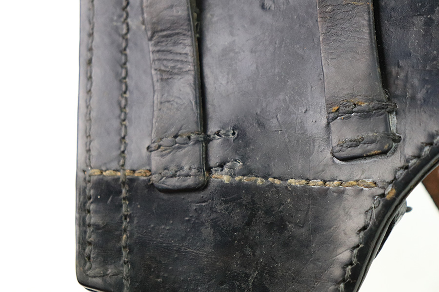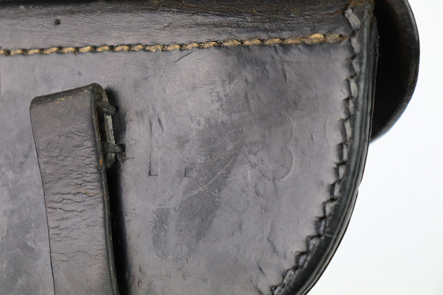 12/21/22 – This is an original 1942 dated Luger holster from WW2. The holster is maker stamped and dated on the back leather, along with a waffen military proof stamp and P.08 designation stamp. The waffen proof is somewhat faint but still visible. The leather is in good condition with soft, pliable, all-original leather. The closure strap has some surface cracking but is still completely intact. The lid leather has surface wrinkling throughout. The stitching is replacement throughout the holster exterior. The belt loops also have replaced stitching.
