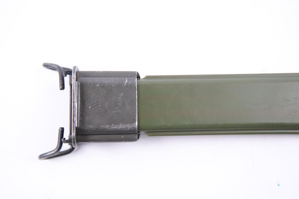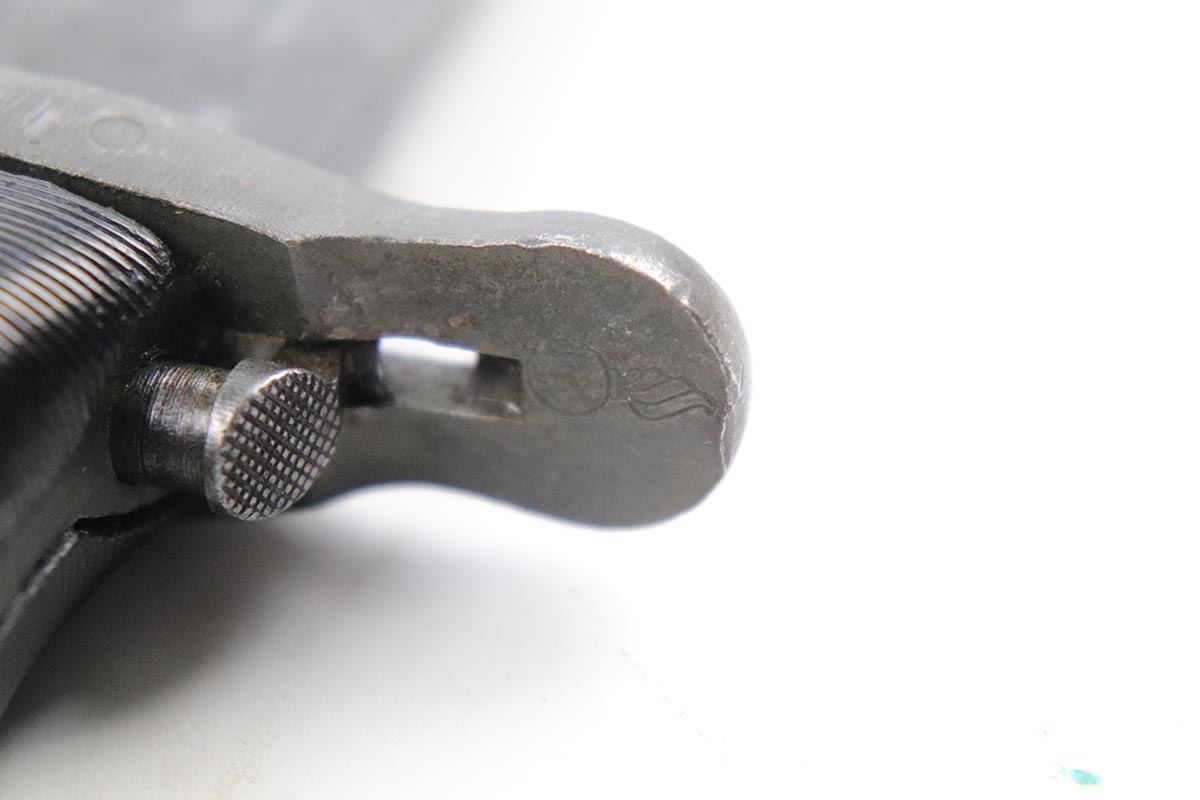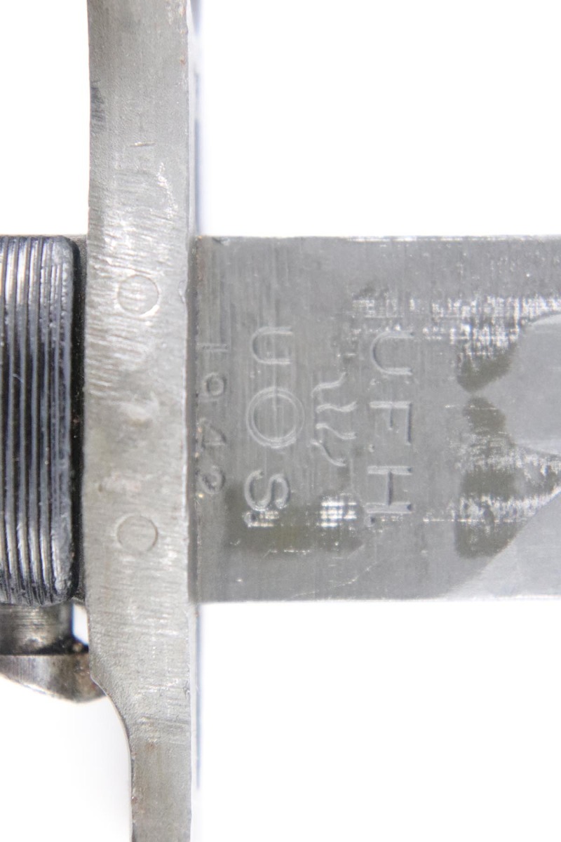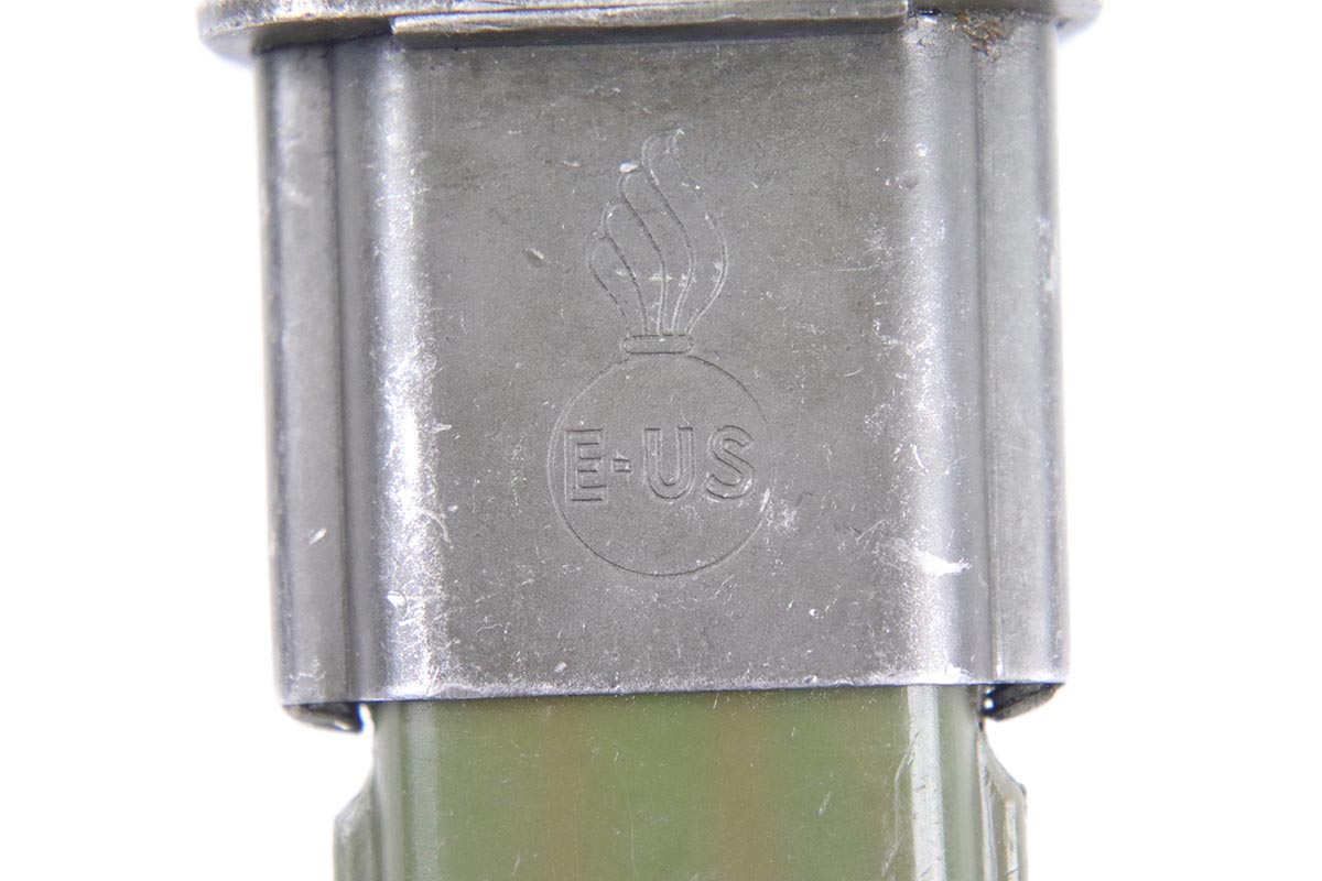 5/14/18 – This is an excellent WW2 M1 Garand bayonet. The bayonet is arsenal cut and dated 1942 with a US flaming bomb and UFH maker stamp. The reverse side has a faint cartouche that’s hard to see. The handle is excellent. The scabbard has a flaming bomb stamp and “E-US” within the stamp. Excellent scabbard no notable flaws. Guaranteed all original.