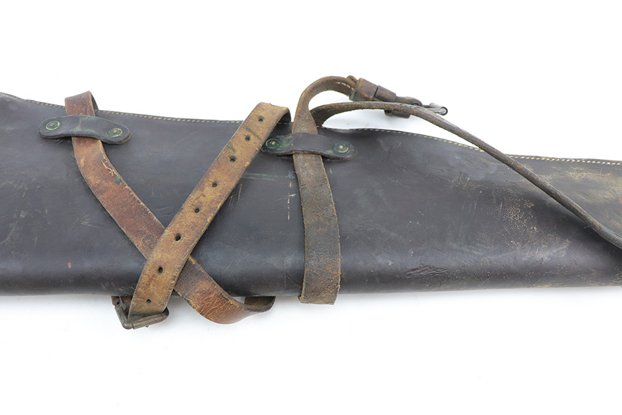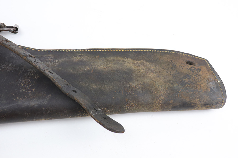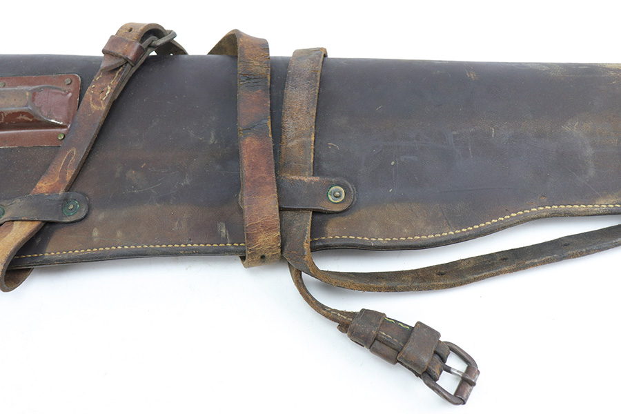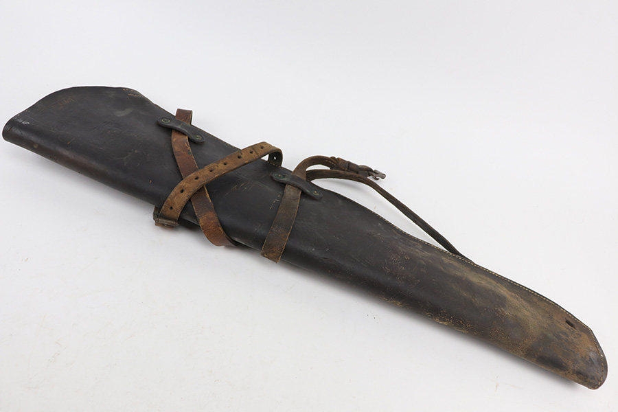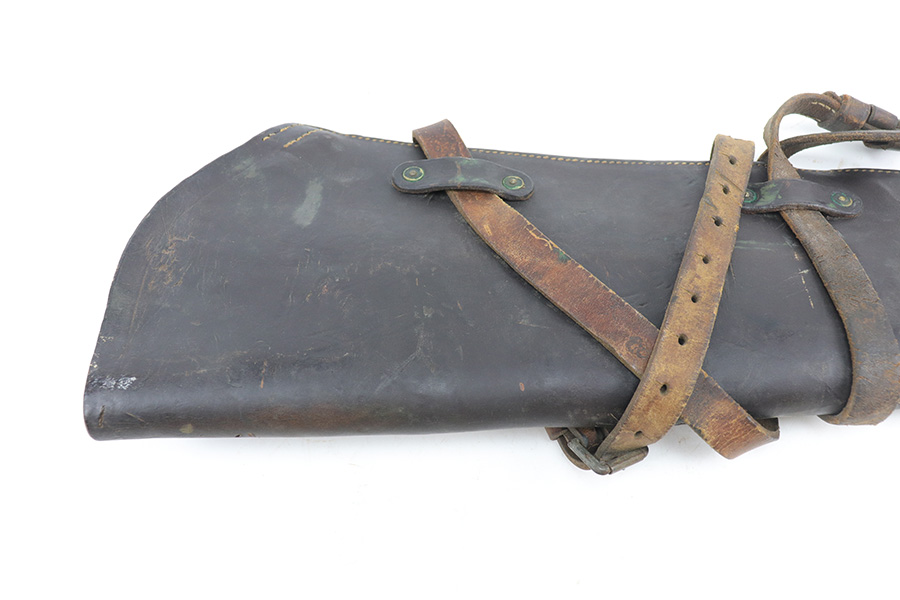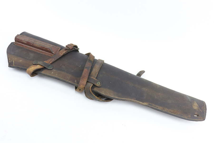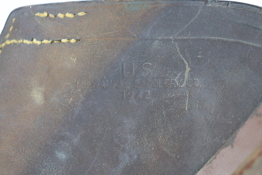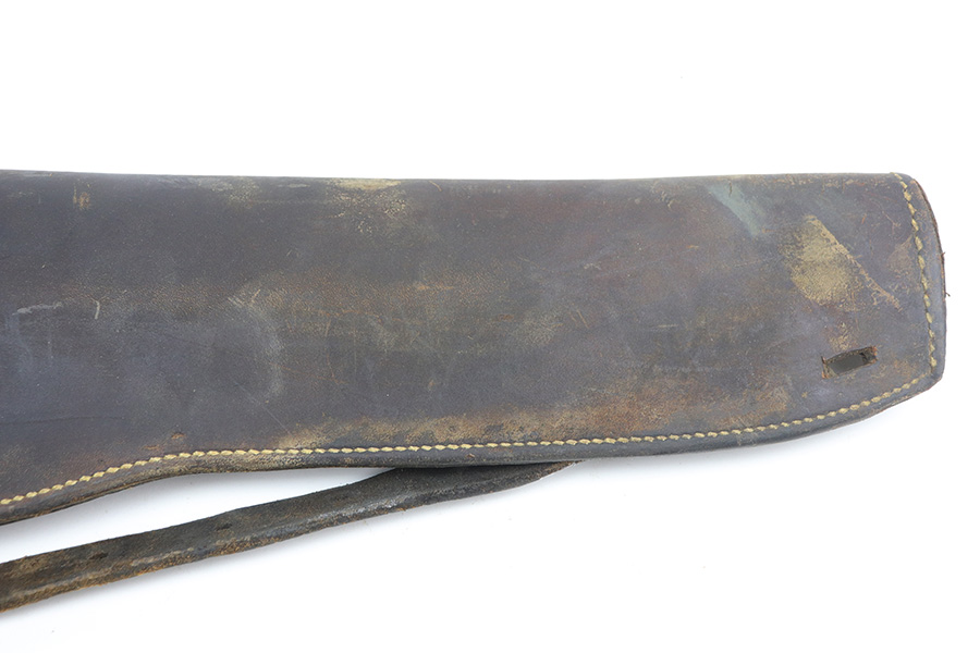 11/9/21 – This is an original 1942 dated leather holster for a Model 1903 or a M1 Garand rifle. These holsters were often attached to Jeeps and vehicles for safe rifle transportation. The leather case is maker stamped and dated on the front leather near the opening. The stamp is fairly faint yet still visible. The leather has surface wear throughout and some signs of aging but no excessive wear or damage. The toe has a small hole intentionally cut, but we’re not sure why. No notable stitching flaws. The leather attachment sling has surface wear but is in tact.